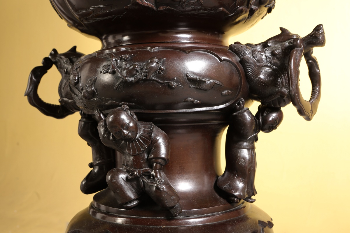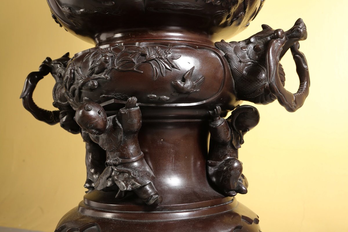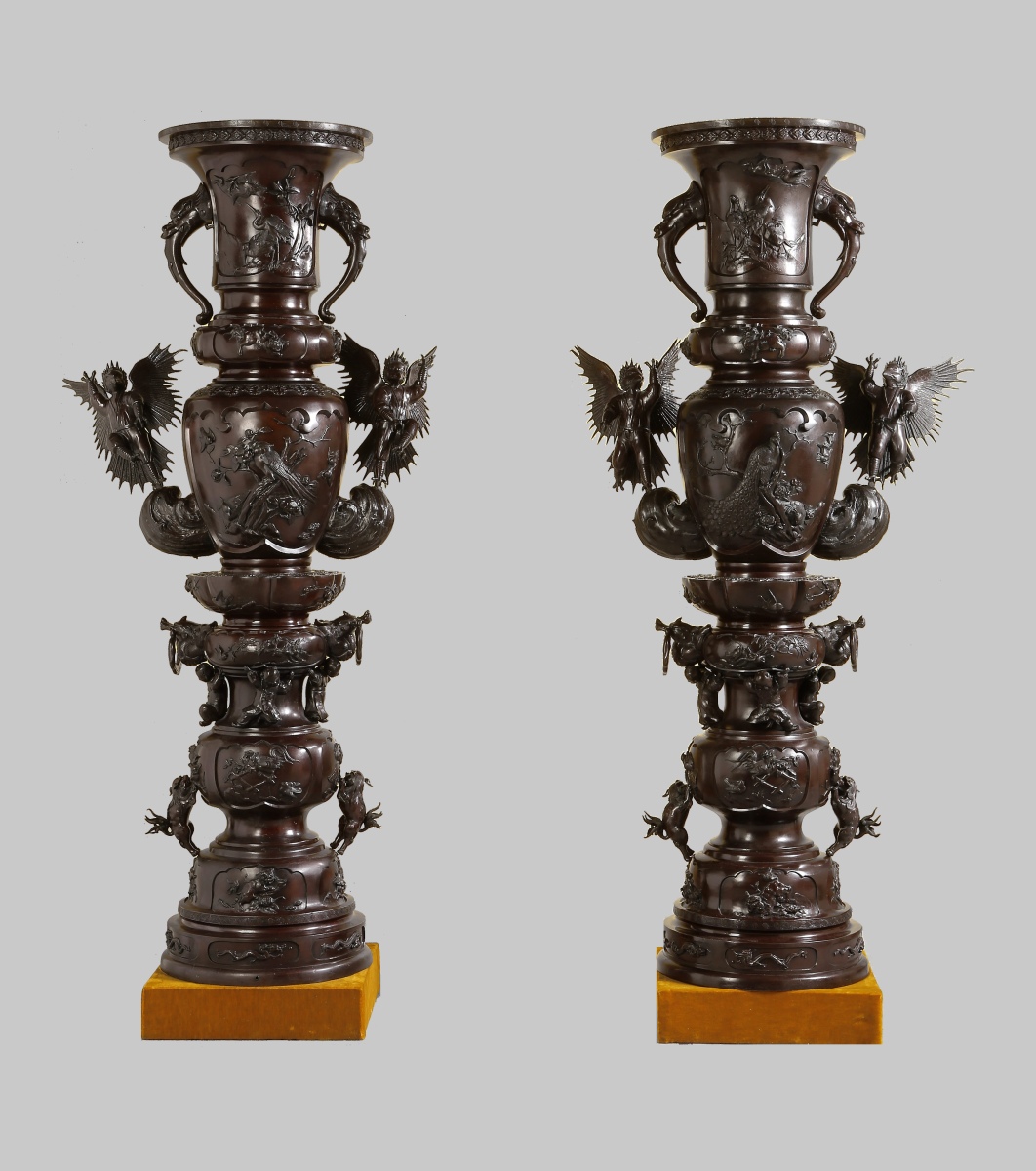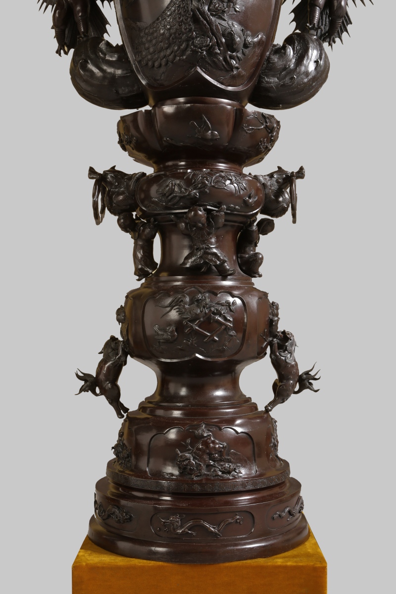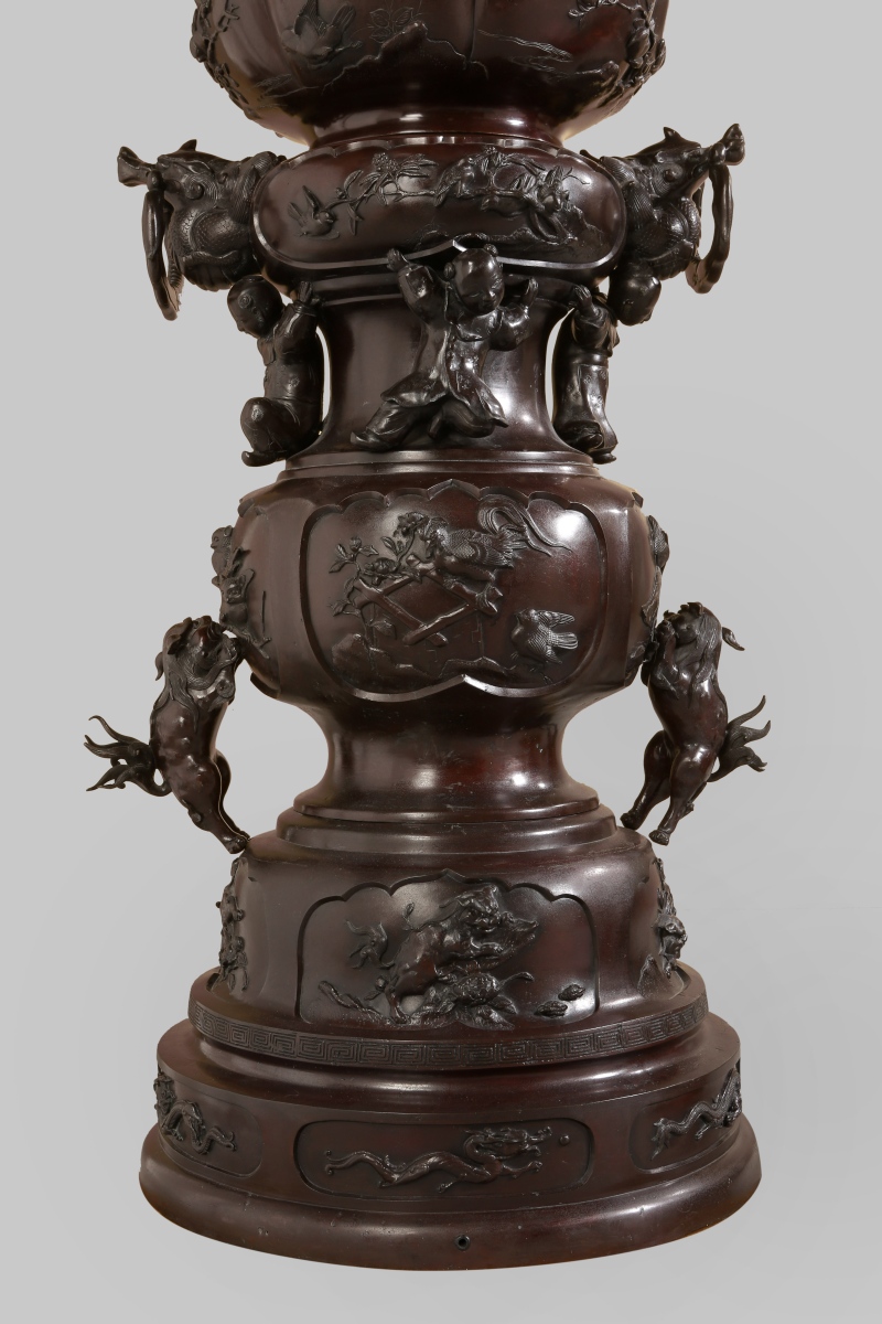 Paire de GRANDS VASES dits porte-bonheur - pour salle d'audience - en bronze à patine brune. Superpositions de divers vases richement ouvragés d'animaux mythologiques et symboliques. Ronde d'enfants associée aux animaux fabuleux tels phénix, grues, dragons, rongeurs, monstres, personnages ailés...