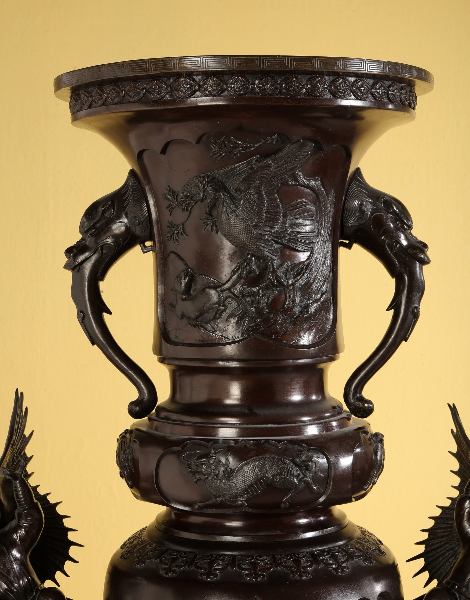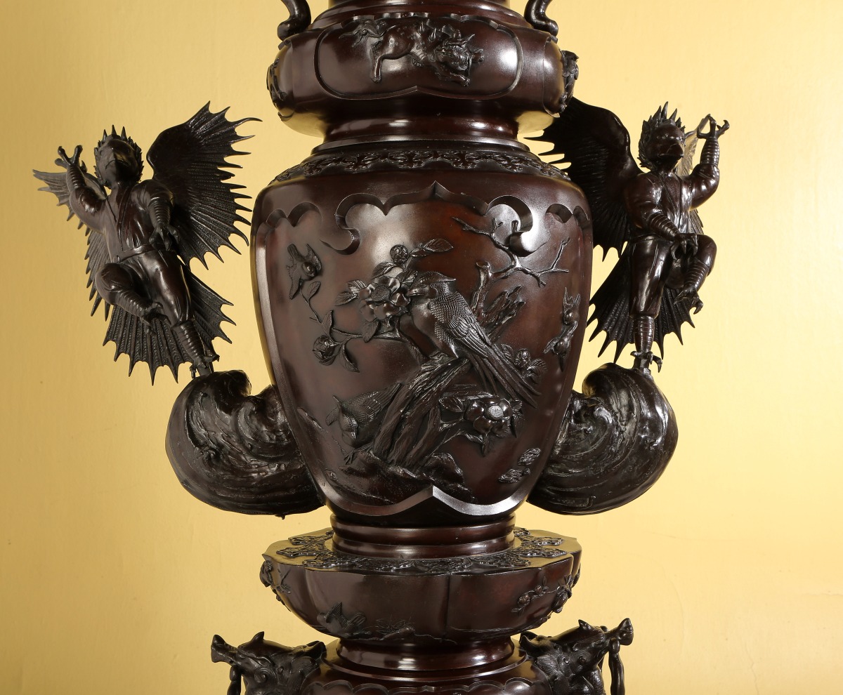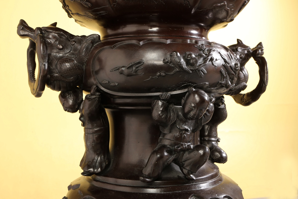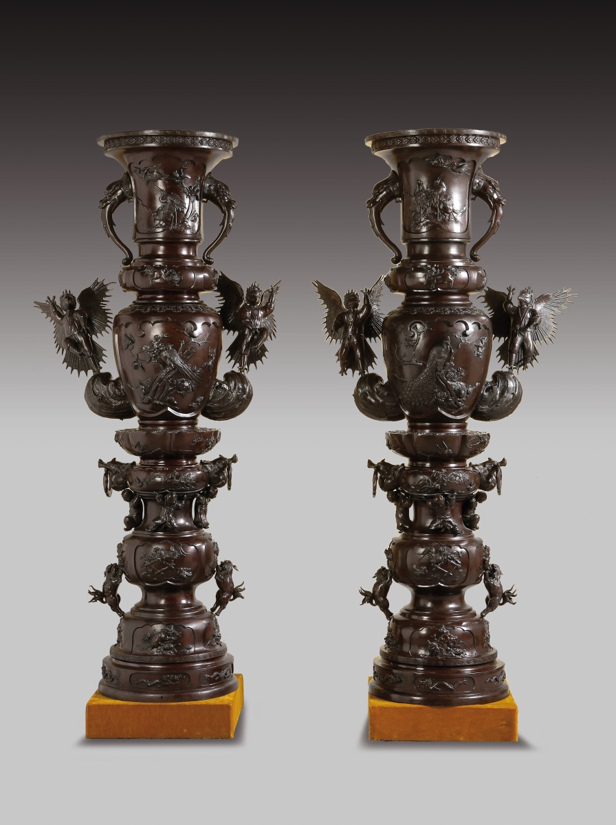 Paire de GRANDS VASES dits porte-bonheur - pour salle d'audience - en bronze à patine brune. Superpositions de divers vases richement ouvragés d'animaux mythologiques et symboliques. Ronde d'enfants associée aux animaux fabuleux tels phénix, grues, dragons, rongeurs, monstres, personnages ailés...