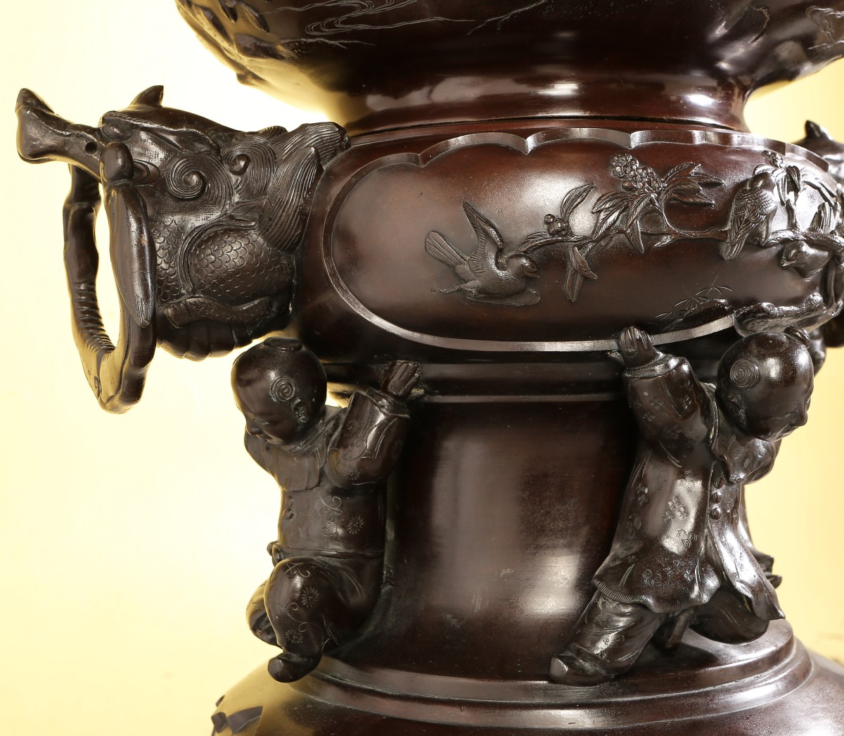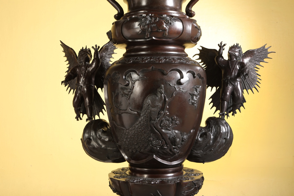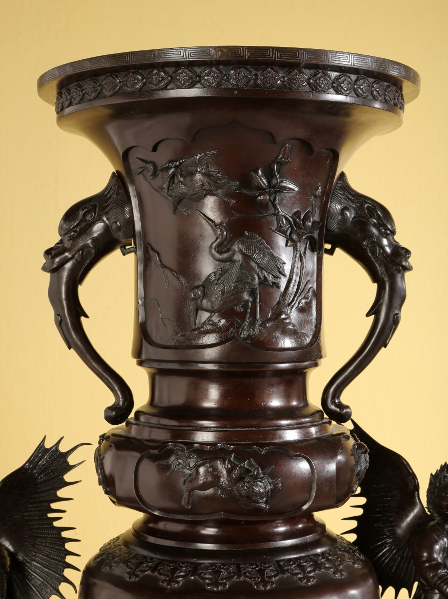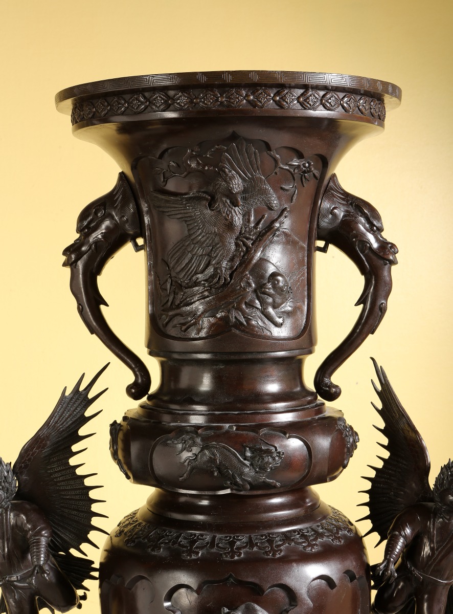 Paire de GRANDS VASES dits porte-bonheur - pour salle d'audience - en bronze à patine brune. Superpositions de divers vases richement ouvragés d'animaux mythologiques et symboliques. Ronde d'enfants associée aux animaux fabuleux tels phénix, grues, dragons, rongeurs, monstres, personnages ailés...