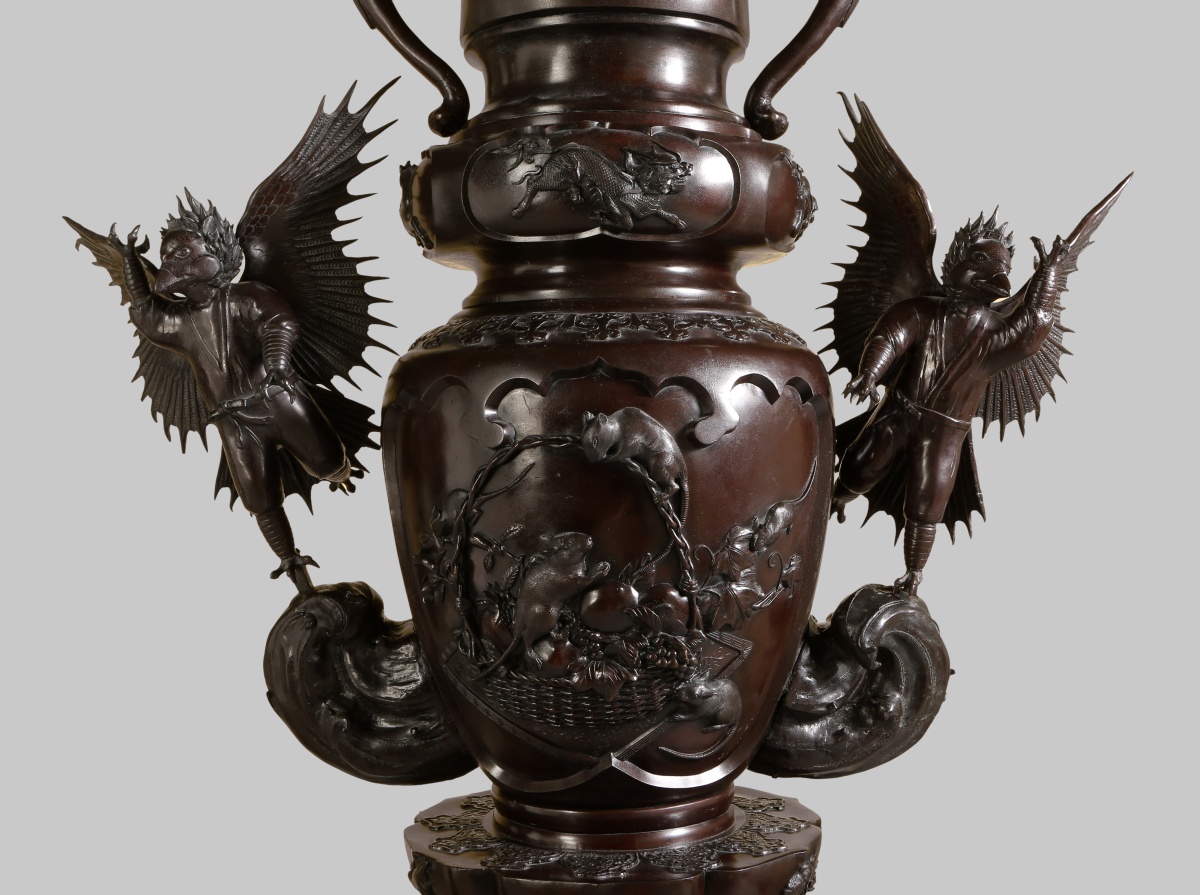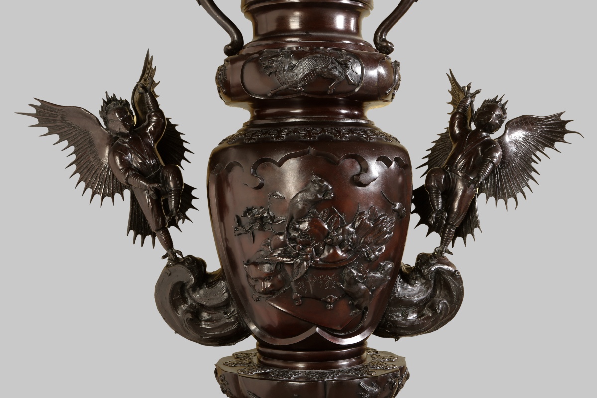 Entre la fertile imagination des traditions populaires et lincroyable réalité danimaux exclusivement japonais, cette paire de vases nous entraîne dans un monde insolite où les animaux sont vénérés comme messagers des dieux, dautres portent chance, dautres encore sont censés soigner les maladies infantiles. Dans un folklore aussi riche que celui du Japon, il nest pas étonnant de rencontrer des animaux fabuleux, fantastiques entre monstres et esprits facétieux de la nature, comme les yôkai ou les dragons, mais aussi des animaux réels dotés de pouvoirs comme le chat, le renard.