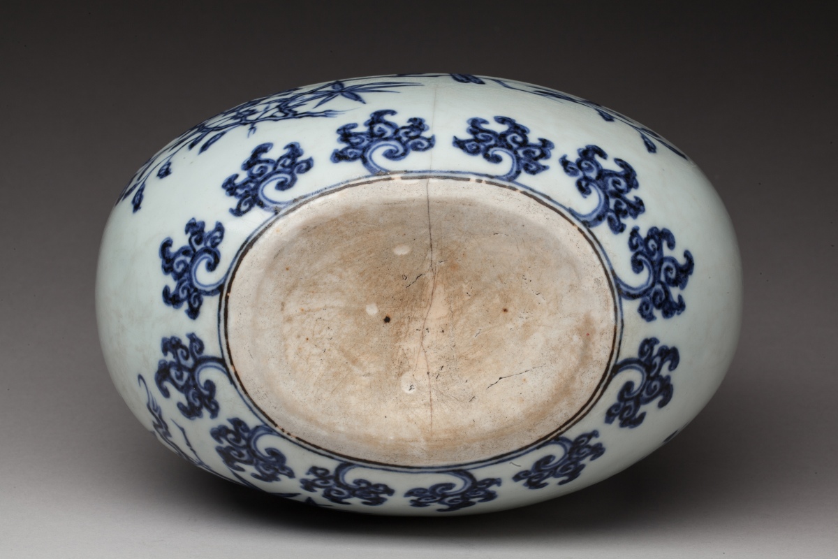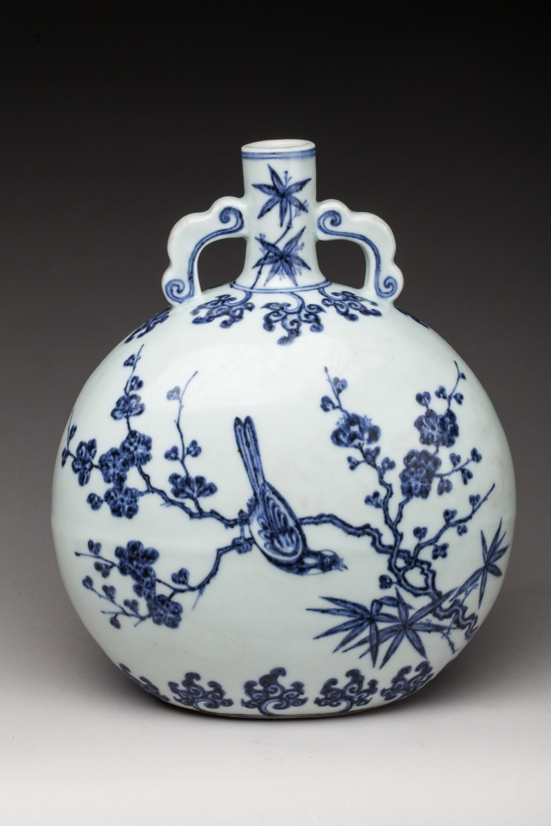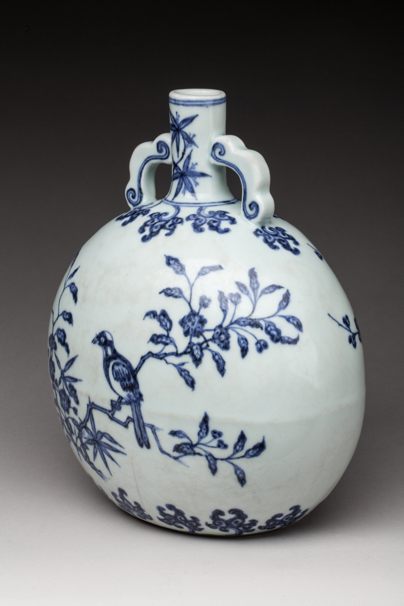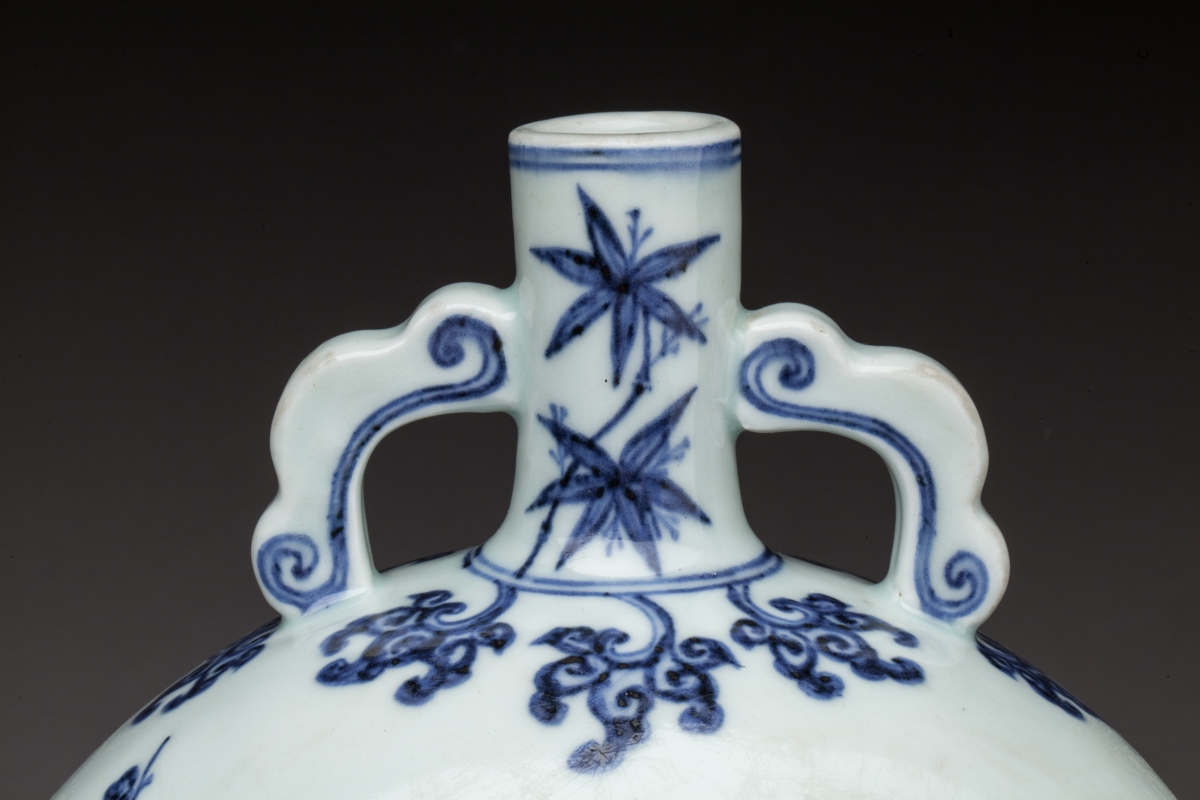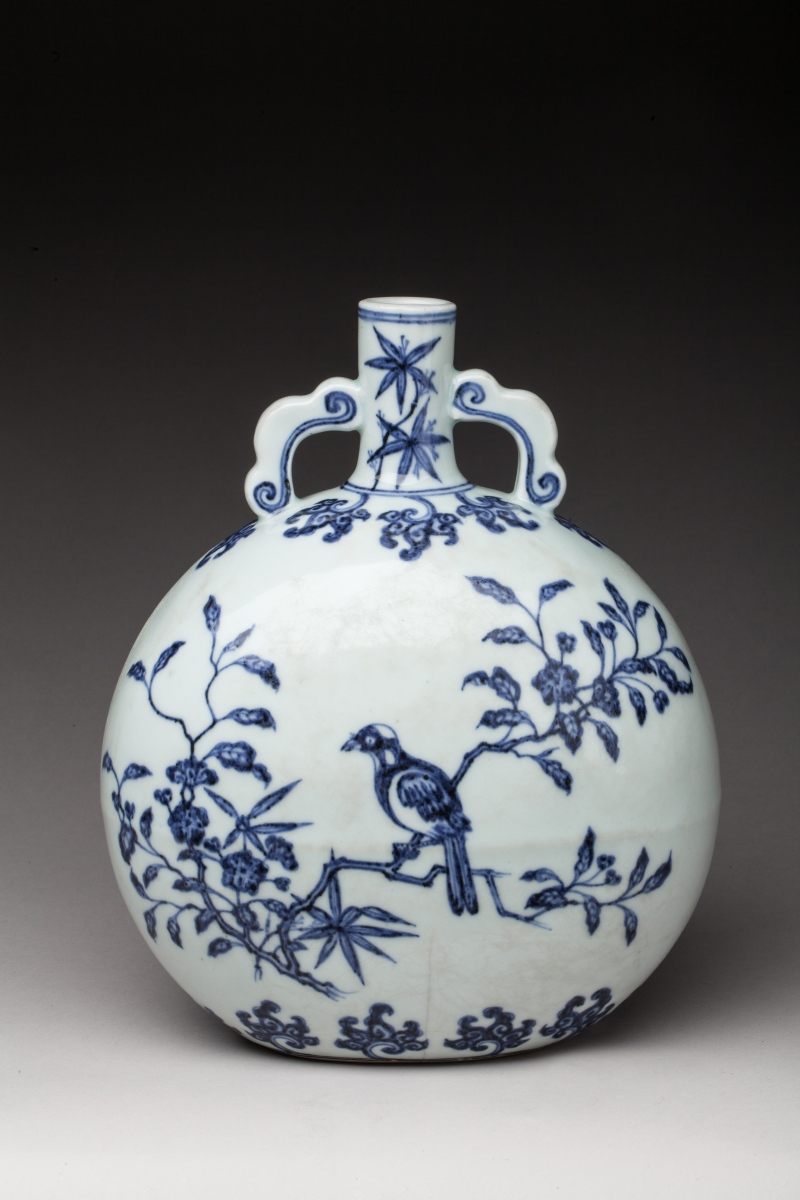 "Cette gourde au profil lenticulaire est surmontée d'un goulot cylindrique court accosté de deux petites anses en volutes. Cette forme, destinée au commerce dans le Proche-Orient d'où elle est originaire, est connue sous la dénomination chinoise de bianhu (gourde du pélerin) ou yueping (flacon en forme de lune). À partir du règne de Yongle, la porcelaine est d'un blanc très pur, sans faille, dont la surface semble presque frémissante. Cette couverte dit en "peau d'orange" présente de nombreuses irrégularités de plans qui participent à l'aspect particulièrement onctueux de cette pièce. La beauté de cette céramique coïncide avec l'un des règnes les plus glorieux de la dynastie Ming. Yongle, quatrième fils de fondateur de cette dynastie qui vainquit les envahisseurs mongols, gouverne une Chine en pleine prospérité économique et d'expansion qui perdurera jusqu'à la fin de son successeur, Xuande (1426-1435)."