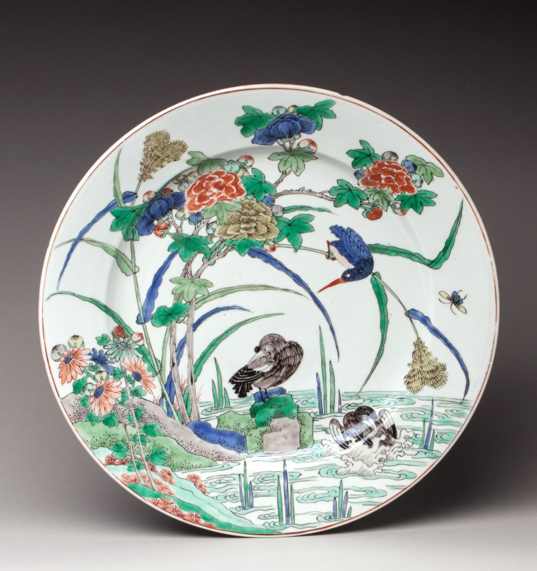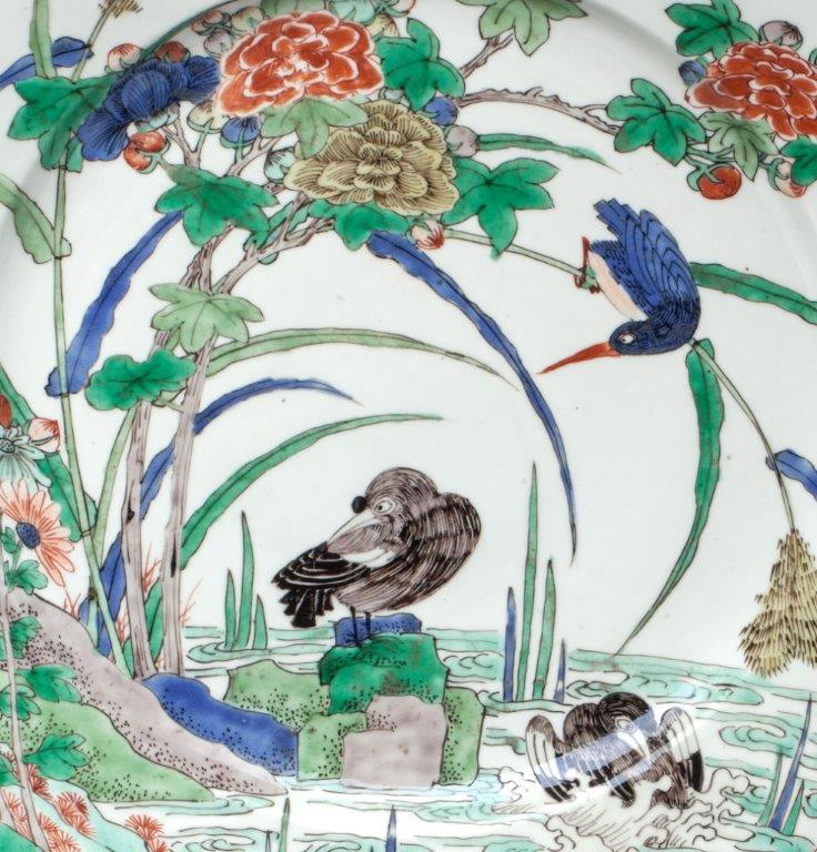 CHINE. PLAT rond en porcelaine à décor polychrome de la famille verte de canards et martin-pêcheur parmi des fleurs et des roseaux. L'extérieur de l'aile ornée de paysages.