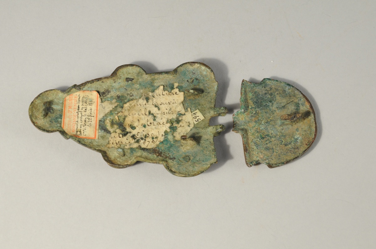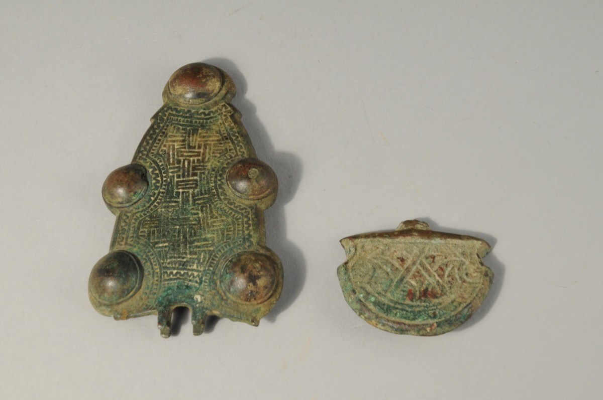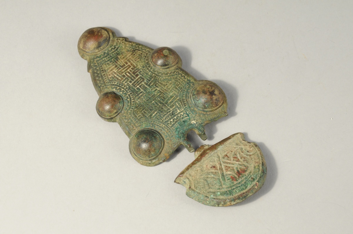BELT BUCKLE. Bronze with engraved designs. 6th century A.D.