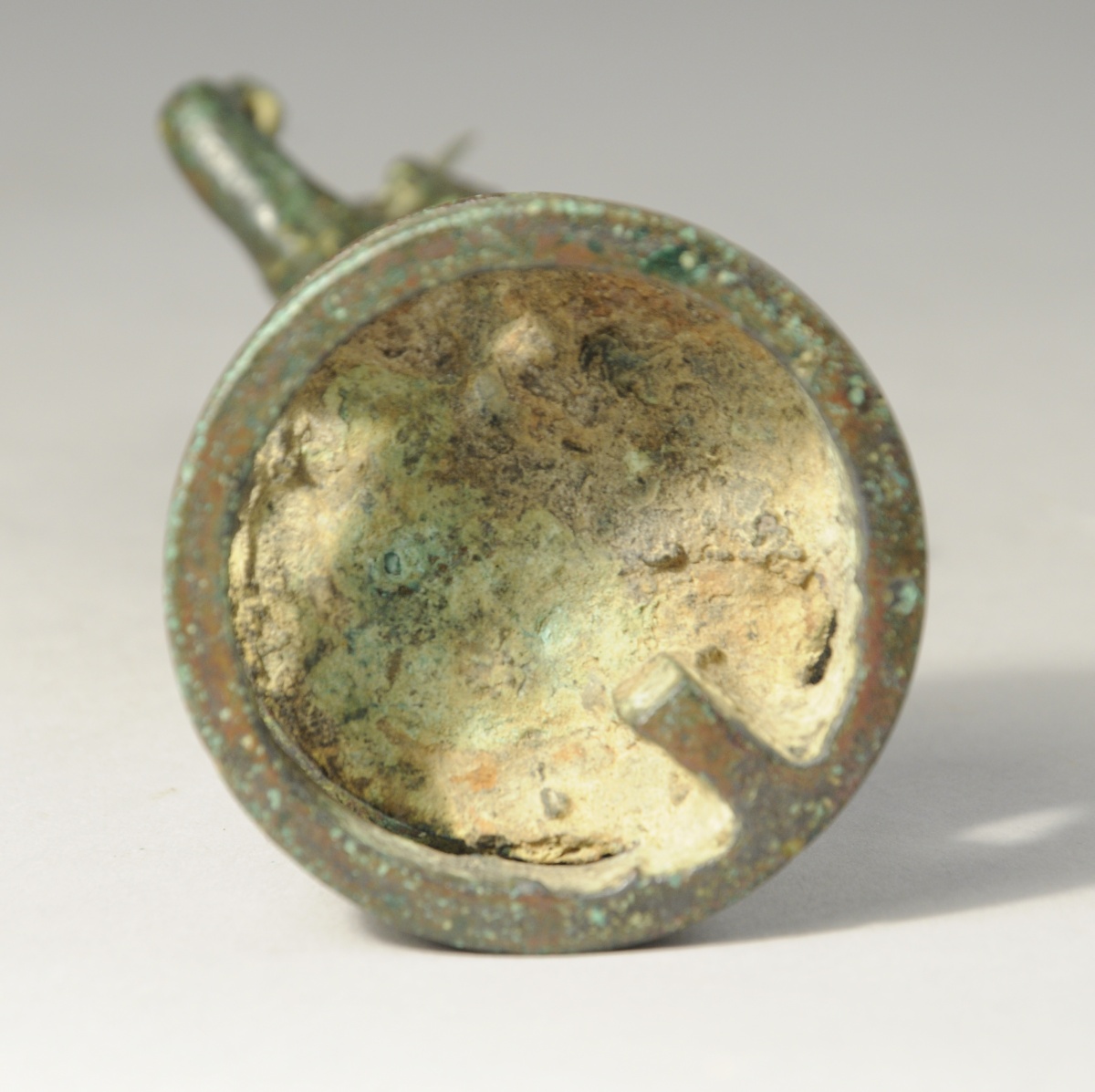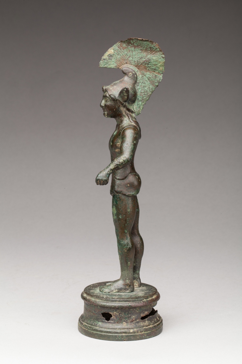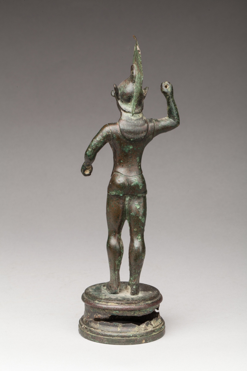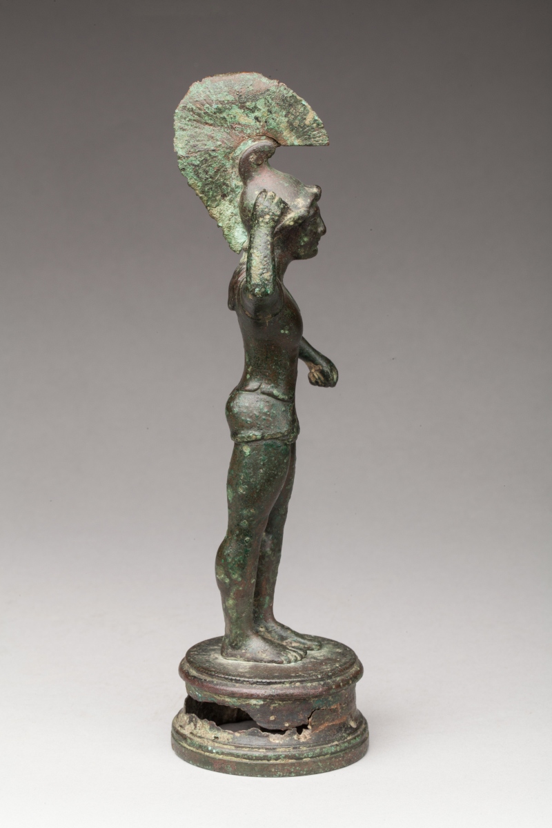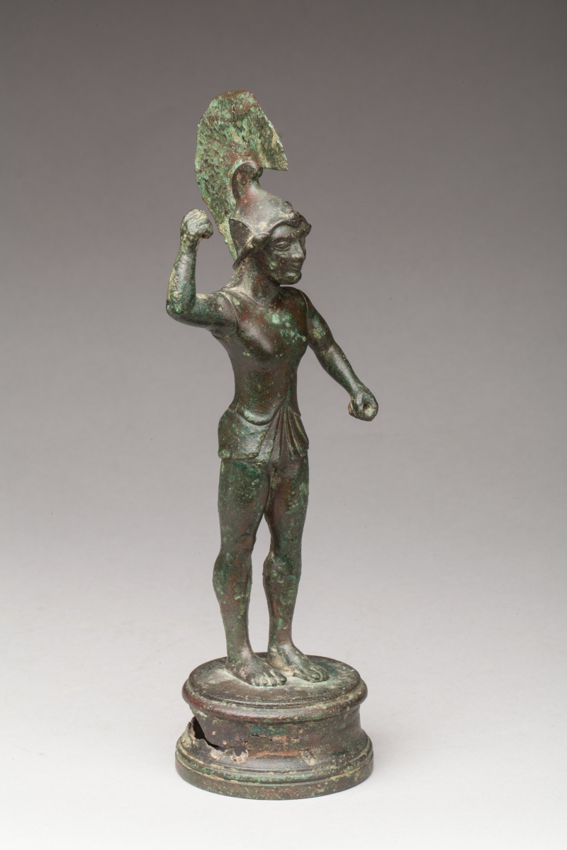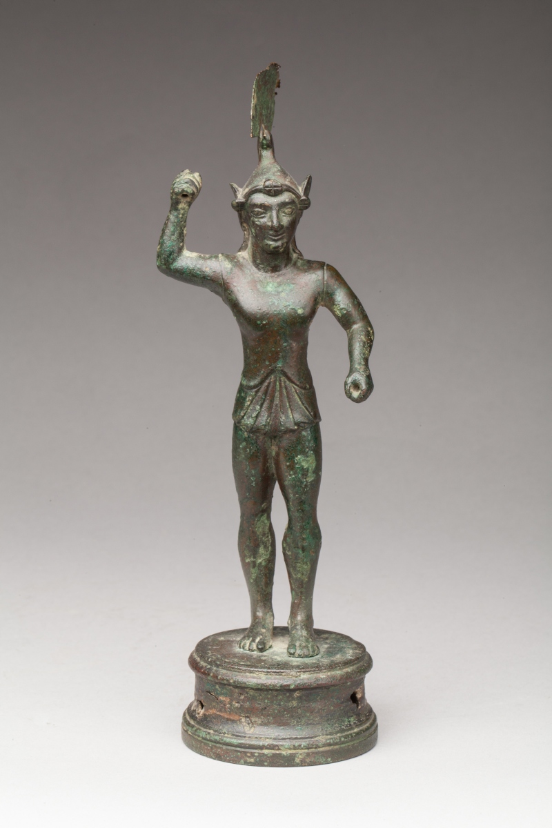 LARAN (Arès?) Bronze fonte pleine. Coiffé d'un casque chalcidien, le bras droit levé plié, la main fermée mais laissant un creux pour probablement tenir une lance, le bras gauche tendu plié au coude devait tenir un poignard.