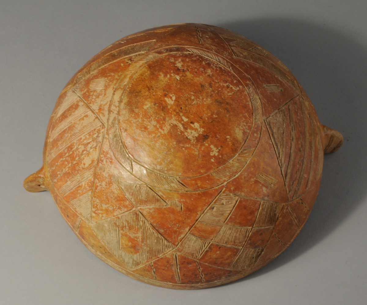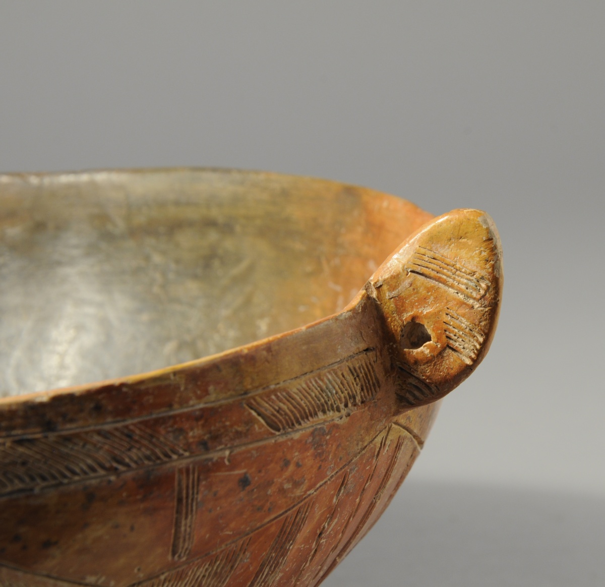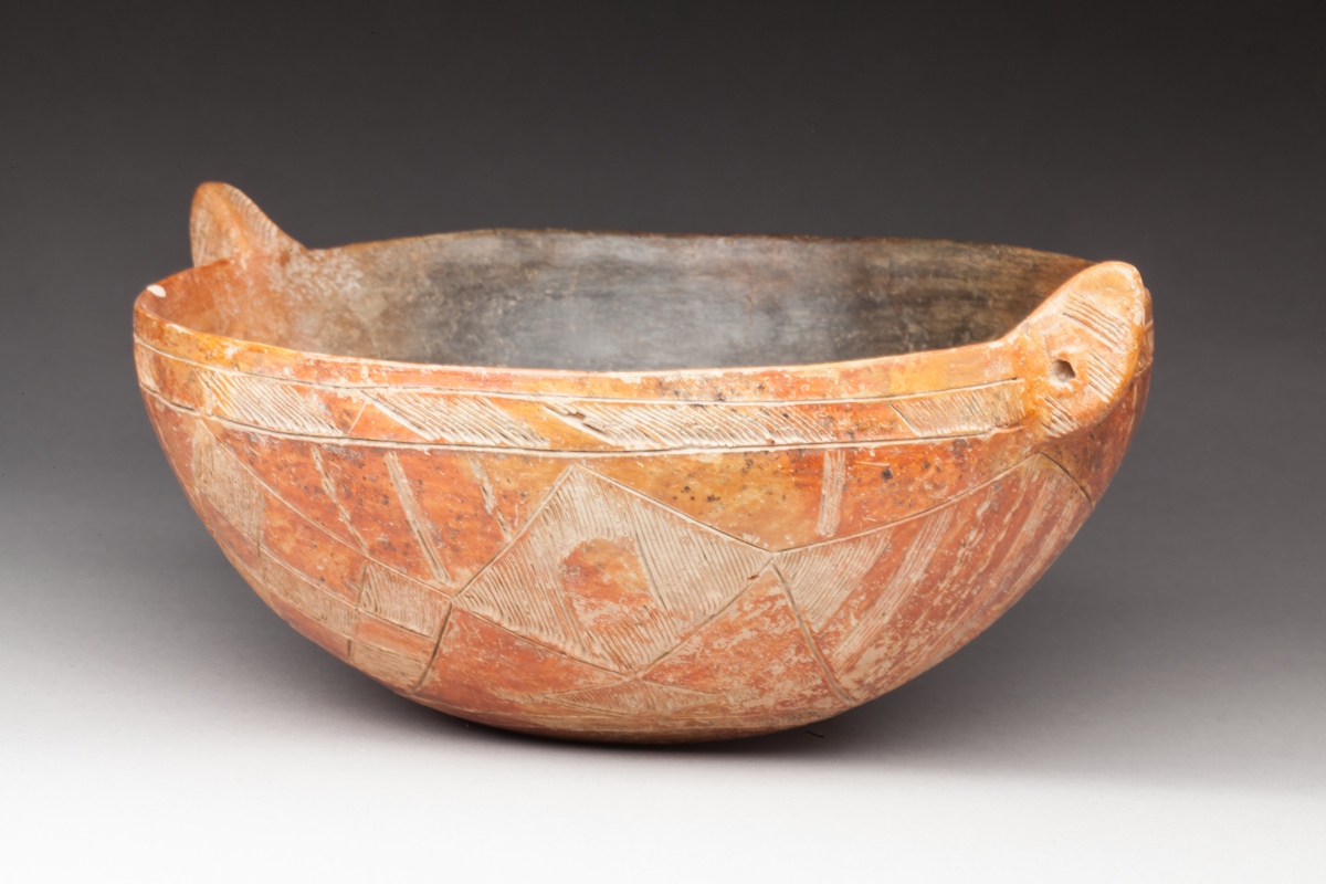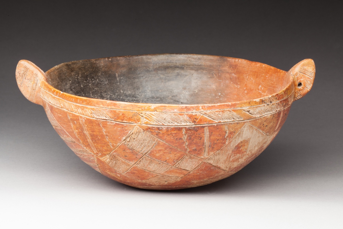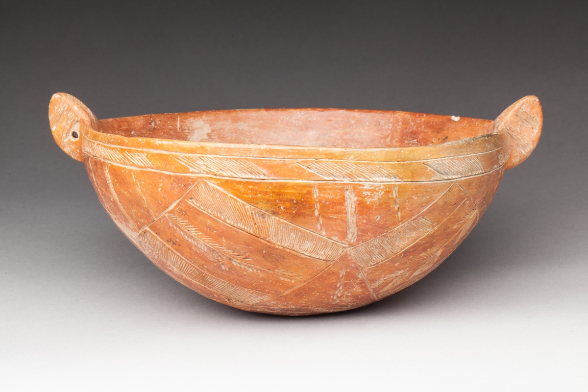COUPE À ANSES, l'une d'elles percée. Céramique vernissée orangé à décor incisé de motifs géométriques.