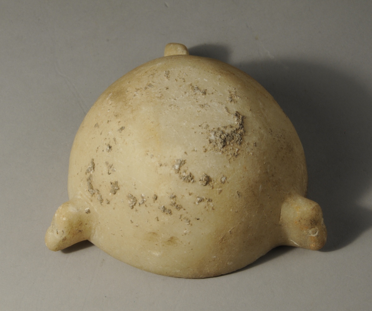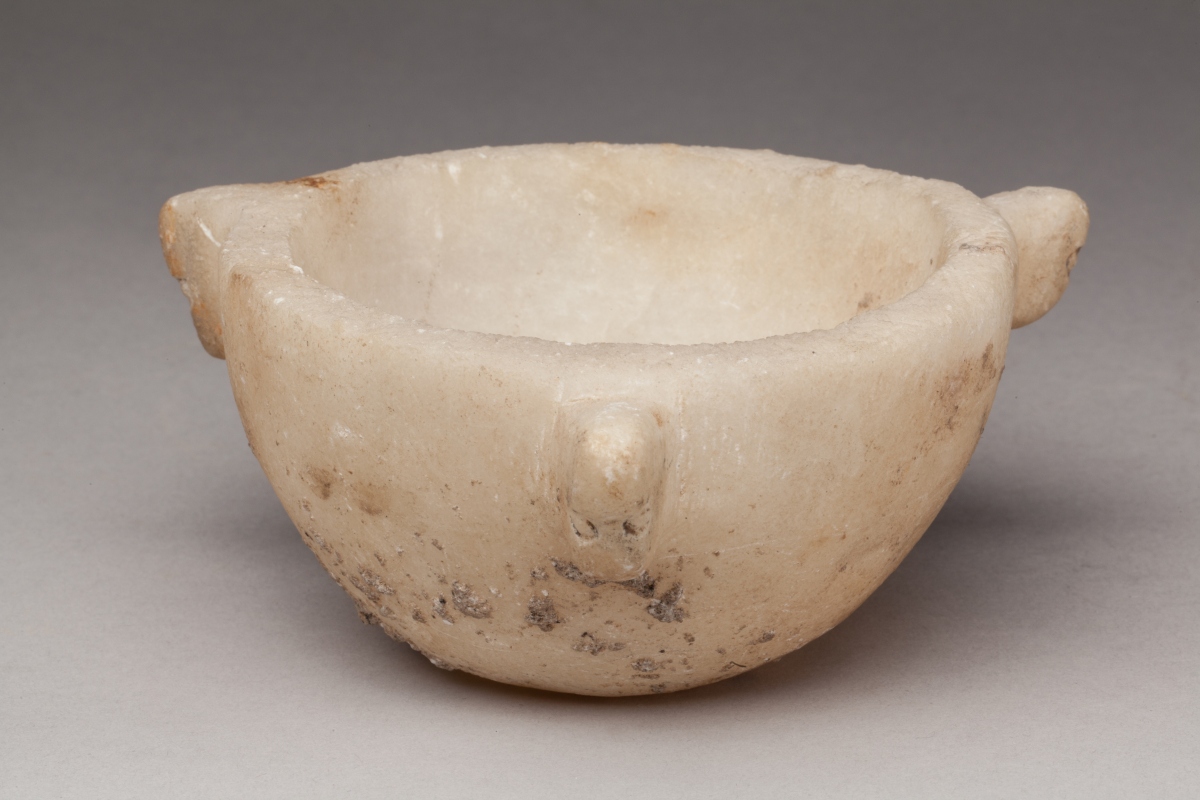 MORTIER. Albâtre. De forme ronde, comporte trois anses figurant des têtes d'animaux dont seuls les yeux et la bouche sont gravés.