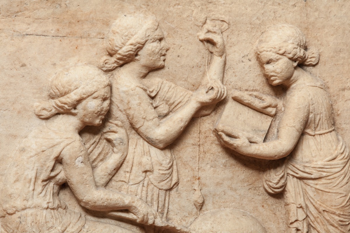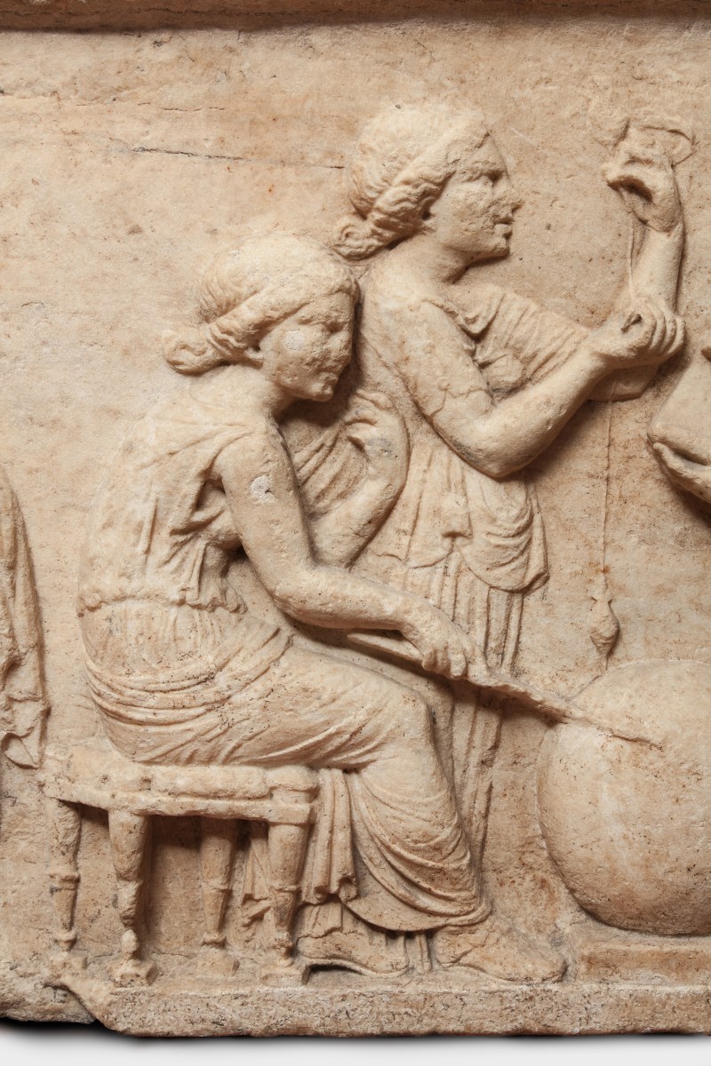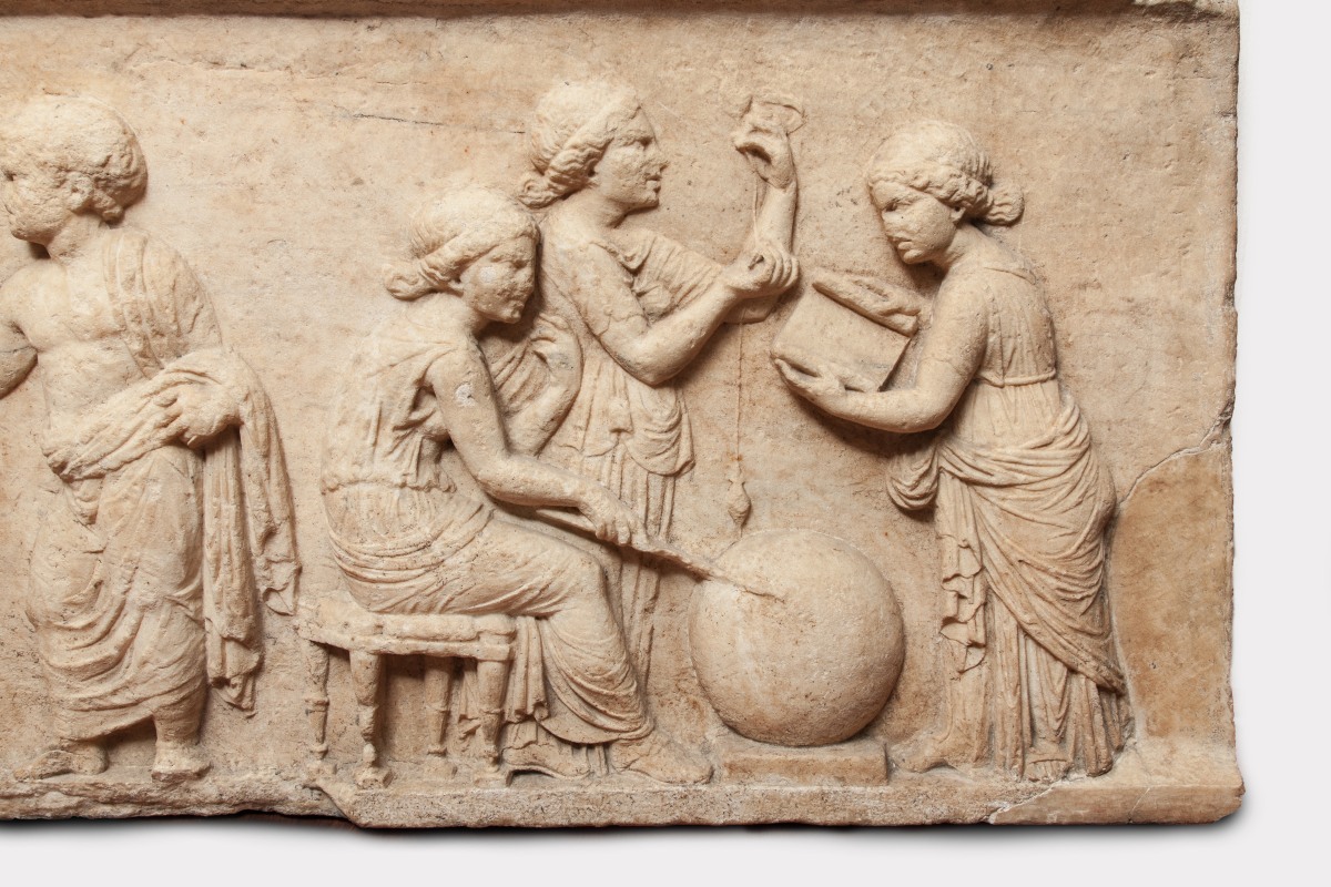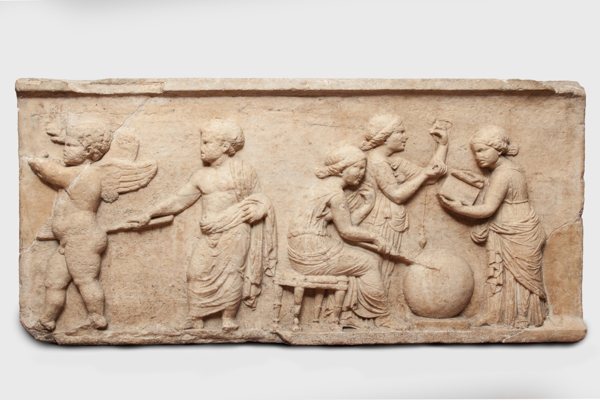 FAÇADE of a SARCOPHAGUS. White sculpted marble representing the Fates. Provenance: Collection of the viscount of Dresnay and then the museum Nanii Veneti of Rome.