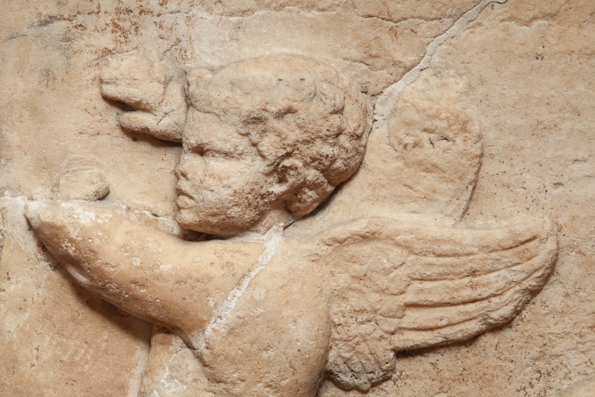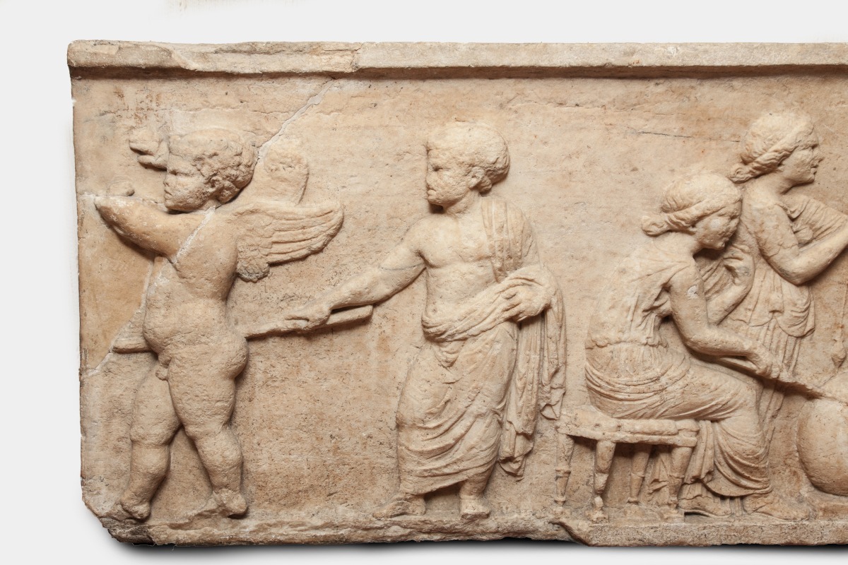 FAÇADE D'UN SARCOPHAGE en marbre blanc sculpté en relief. À gauche Éros apprend le ceste sous la direction d'un pedrotibe de son âge, vêtu d'un manteau et de la baguette des instructeurs. À droite, trois fillettes du même âge sont représentées en Parques. Celle de droite lit un volumen à demi déroulé, celle du milieu file, celle de gauche cherche sur un globe l'heure ou l'horoscope.
