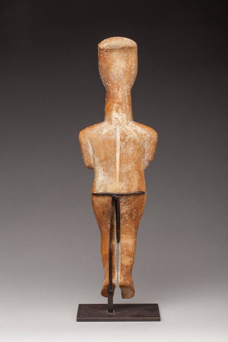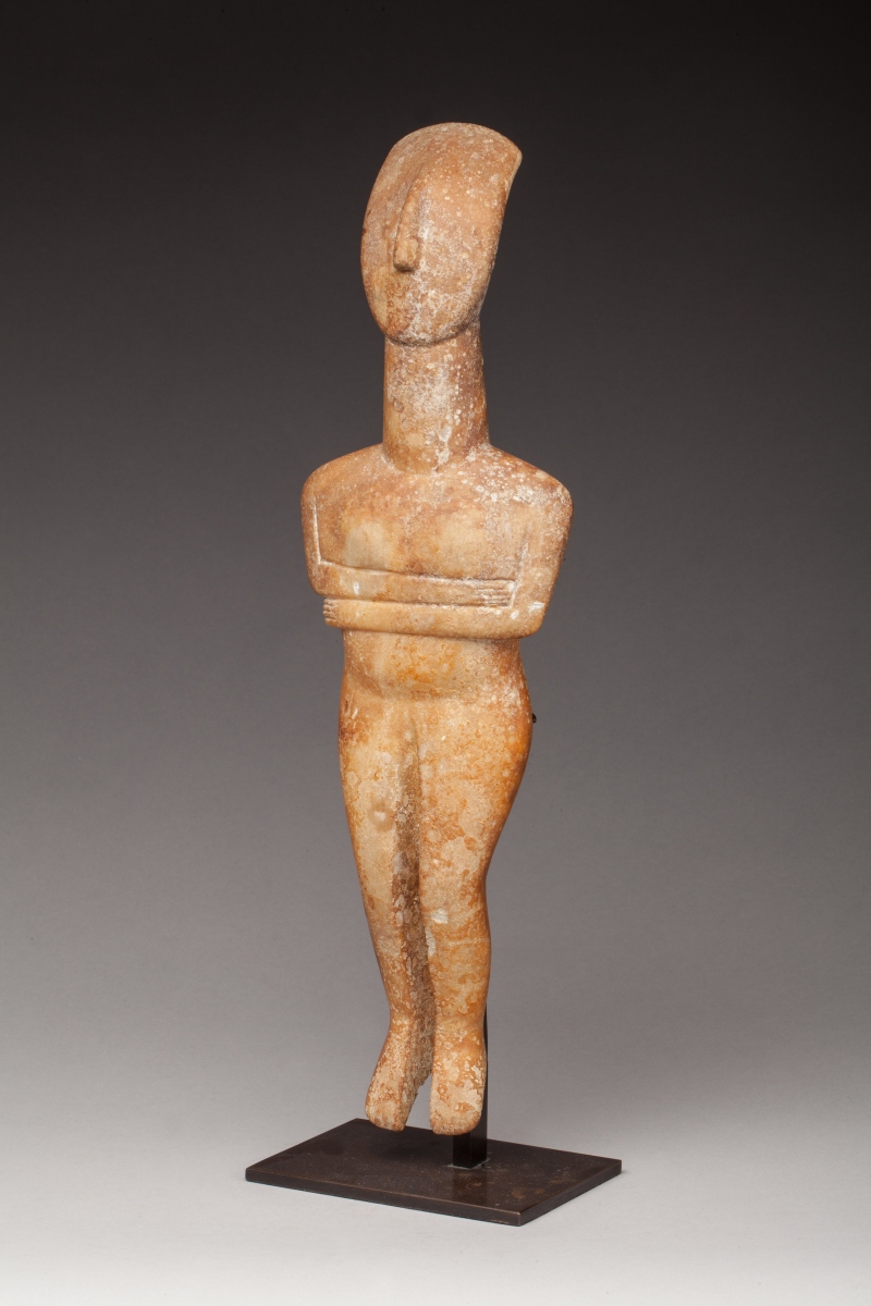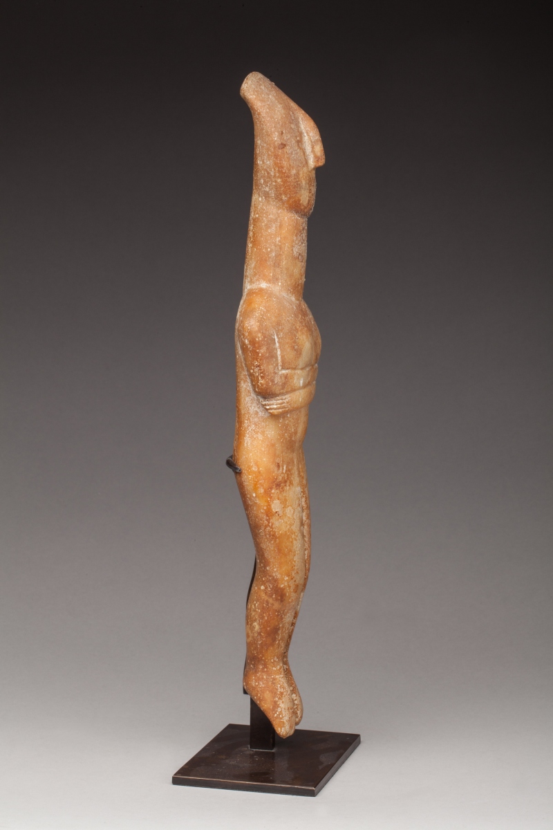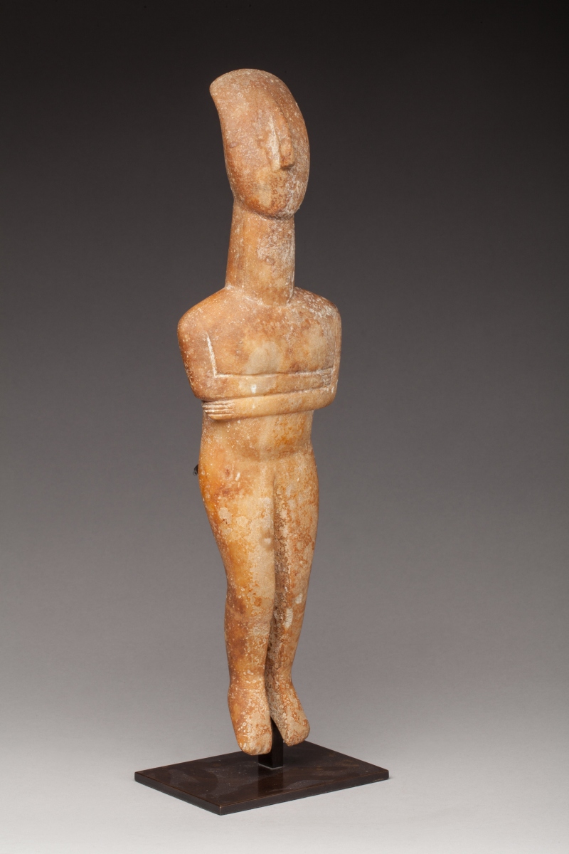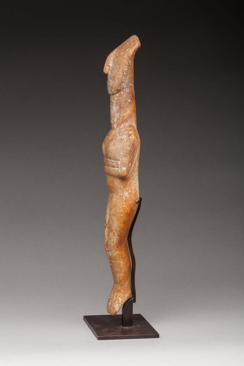 IDOLE des CYCLADES, style. Représentation féminine, debout sur la pointe des pieds, les bras sont croisés sous les seins, les jambes jointes. Le visage au nez proéminent est stylisé à l'extrême.