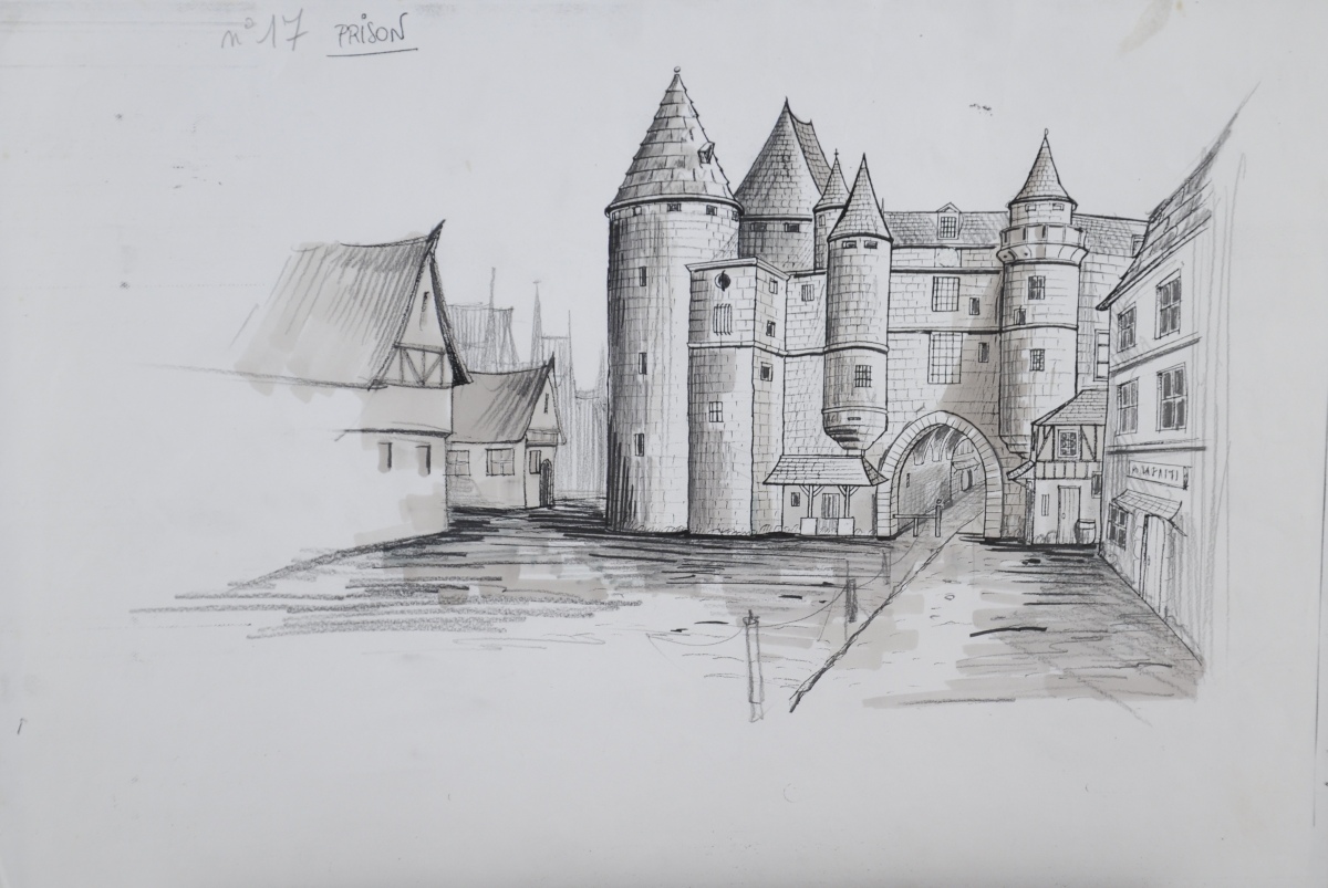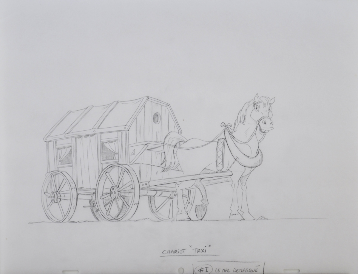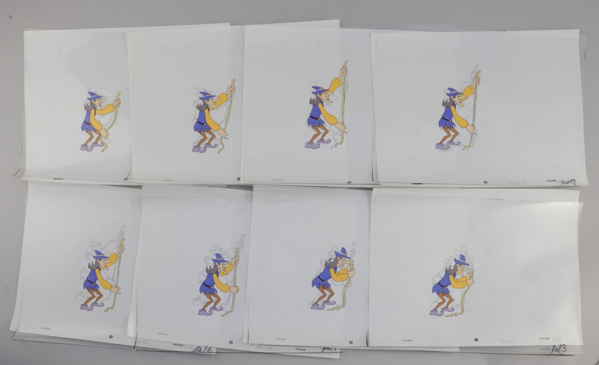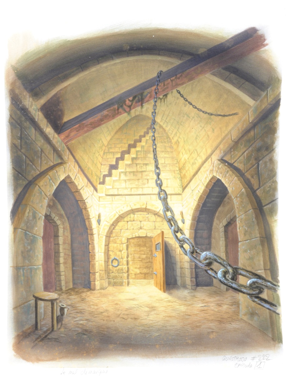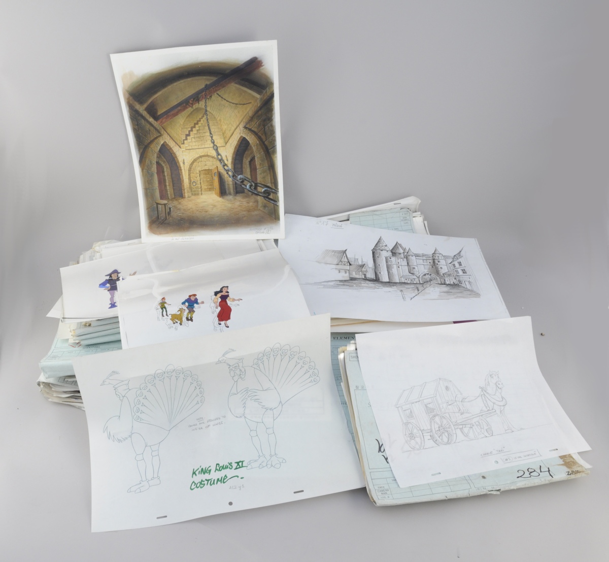 Carton des archives graphiques d'un épisode de la série de dessins animés " Quasimodo " ("The magical adventure of Quasimodo" en anglais) produite en 1995 par Ares Films, comprenant notamment: model sheet, celluloïd et background...