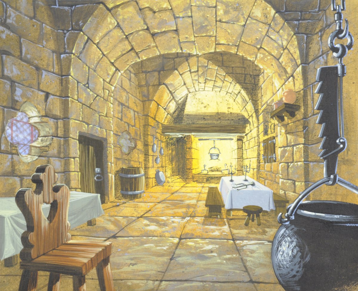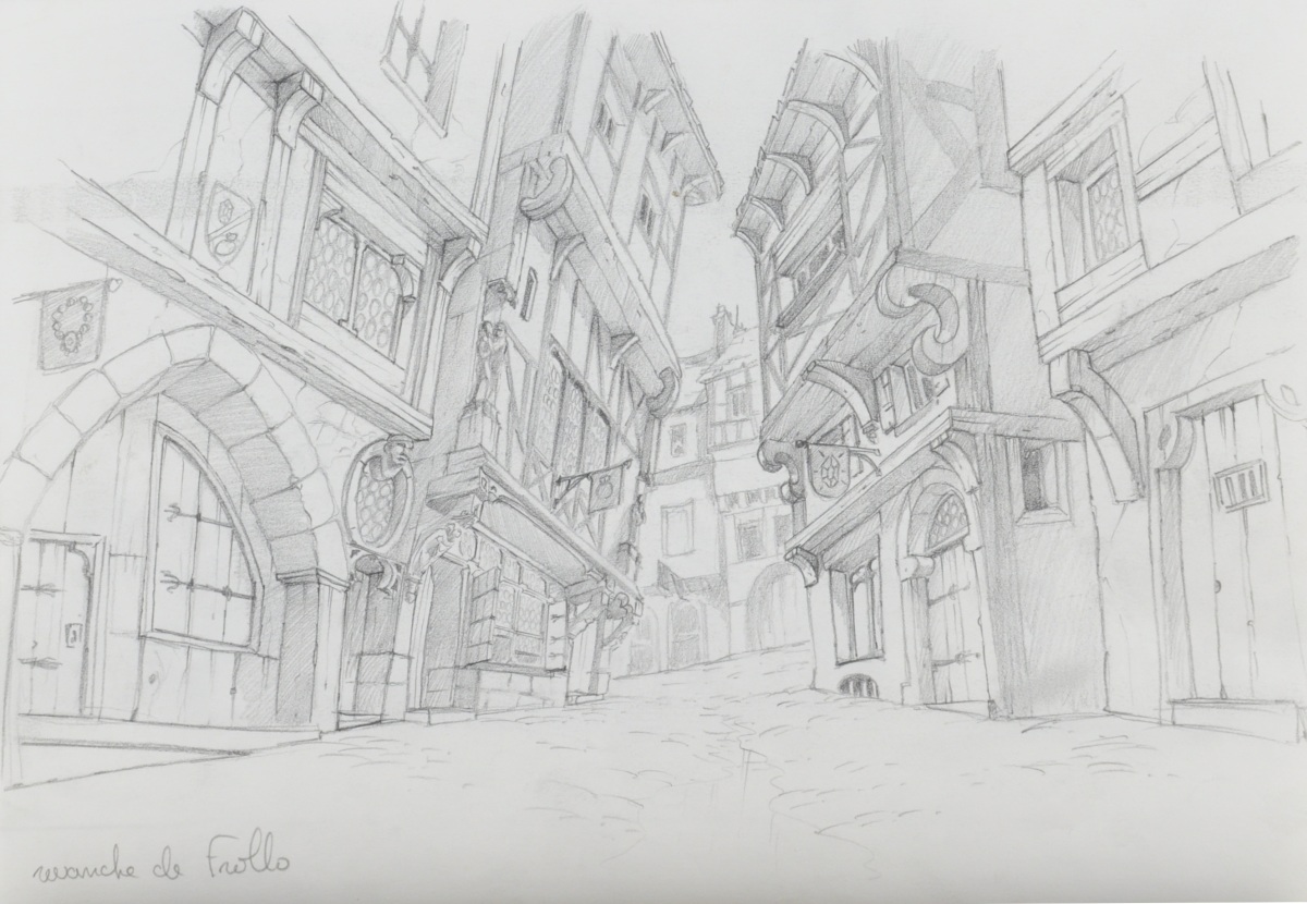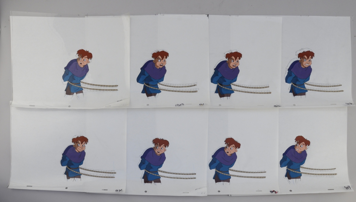 Carton des archives graphiques d'un épisode de la série de dessins animés " Quasimodo " ("The magical adventure of Quasimodo" en anglais) produite en 1995 par Ares Films, comprenant notamment: model sheet, celluloïd et background...