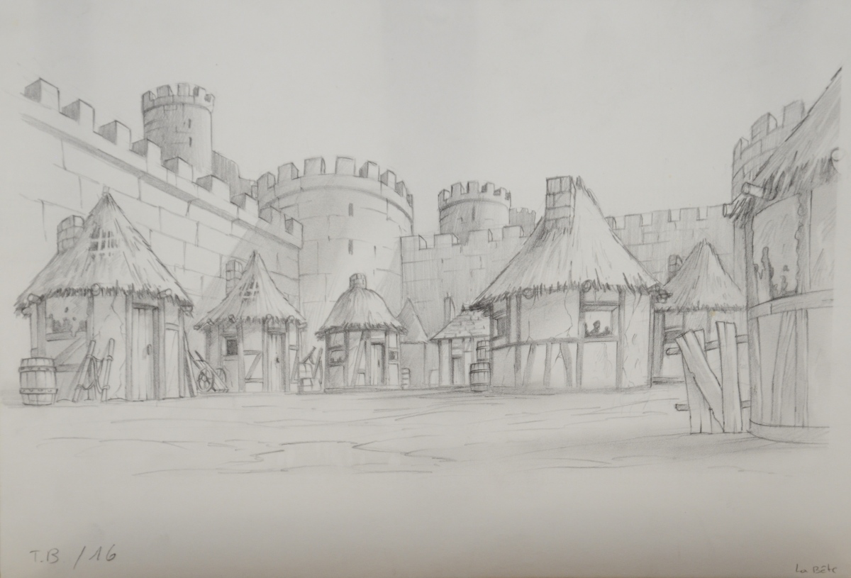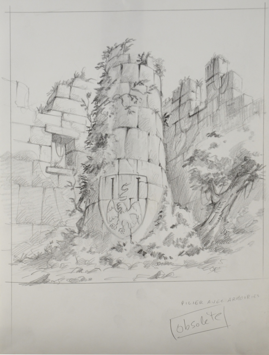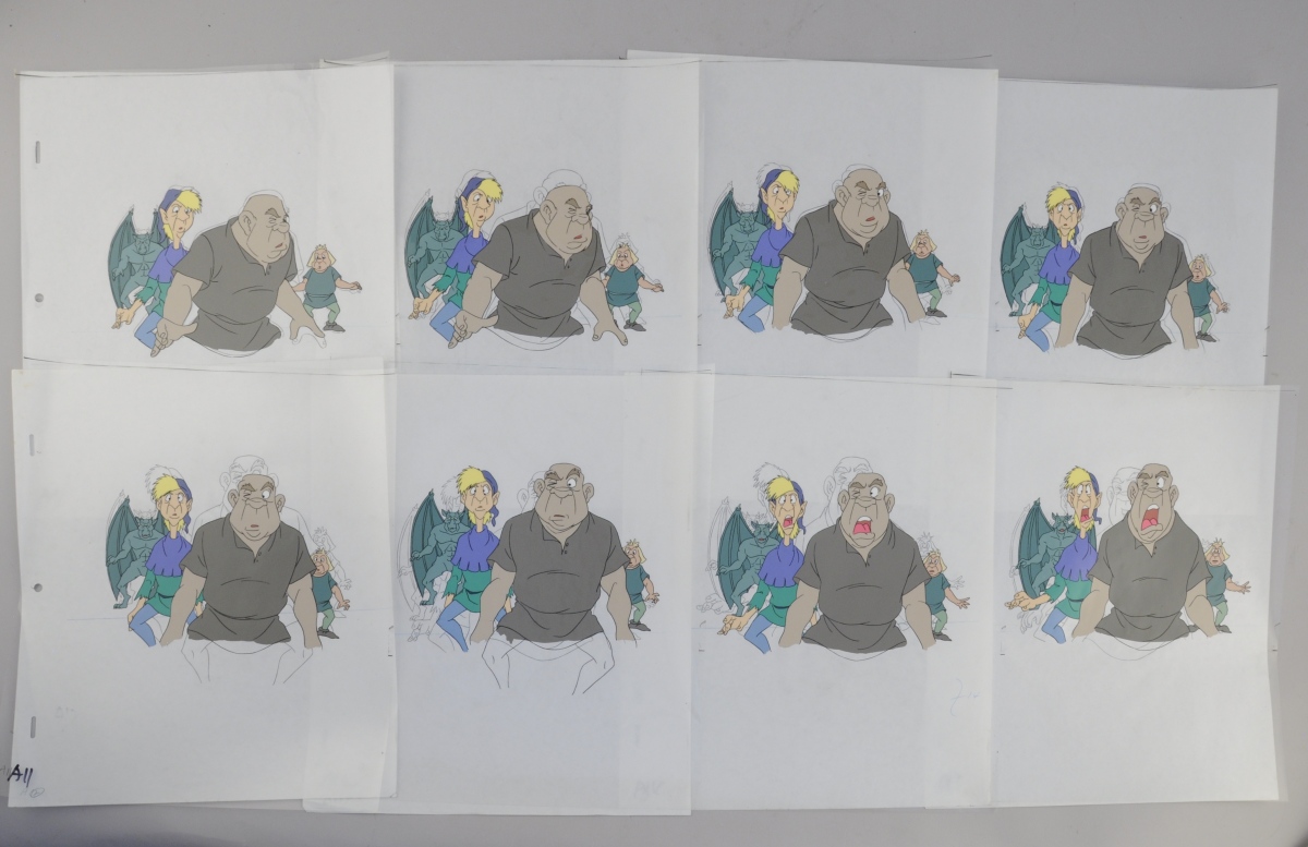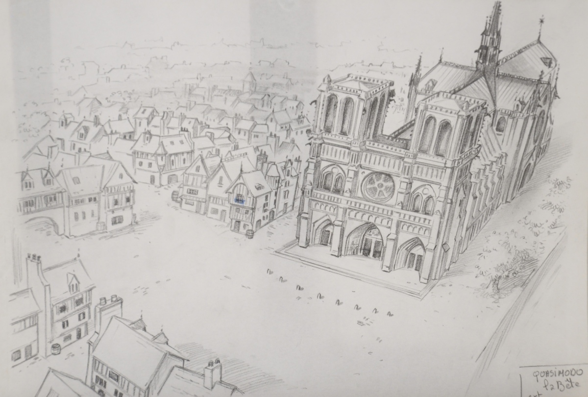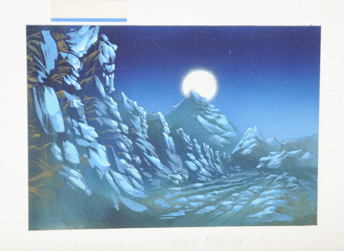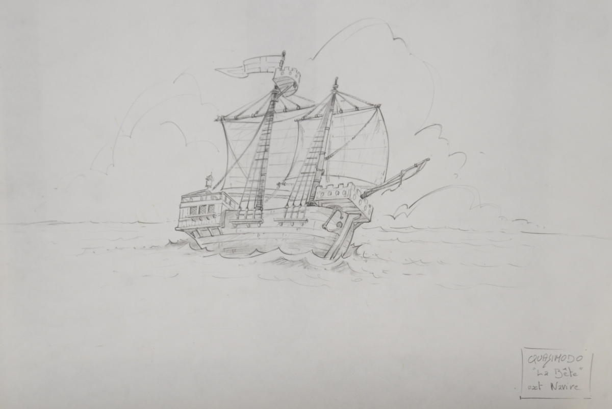 Carton des archives graphiques d'un épisode de la série de dessins animés " Quasimodo " (" The magical adventure of Quasimodo " en anglais) produite en 1995 par Ares Films, comprenant notamment: model sheet, celluloïd et background...