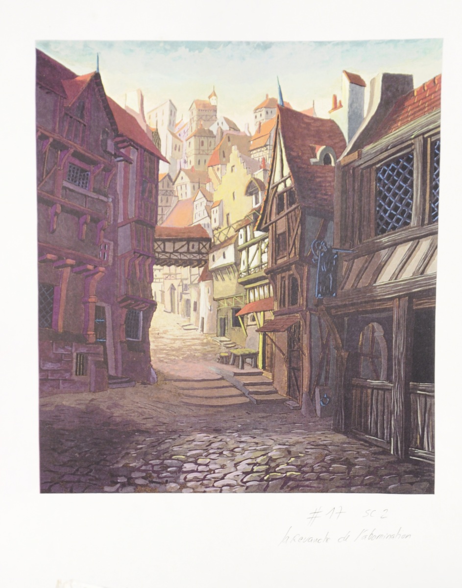 Carton des archives graphiques d'un épisode de la série de dessins animés " Quasimodo " (" The magical adventure of Quasimodo " en anglais) produite en 1995 par Ares Films, comprenant notamment: model sheet, celluloïd et background...