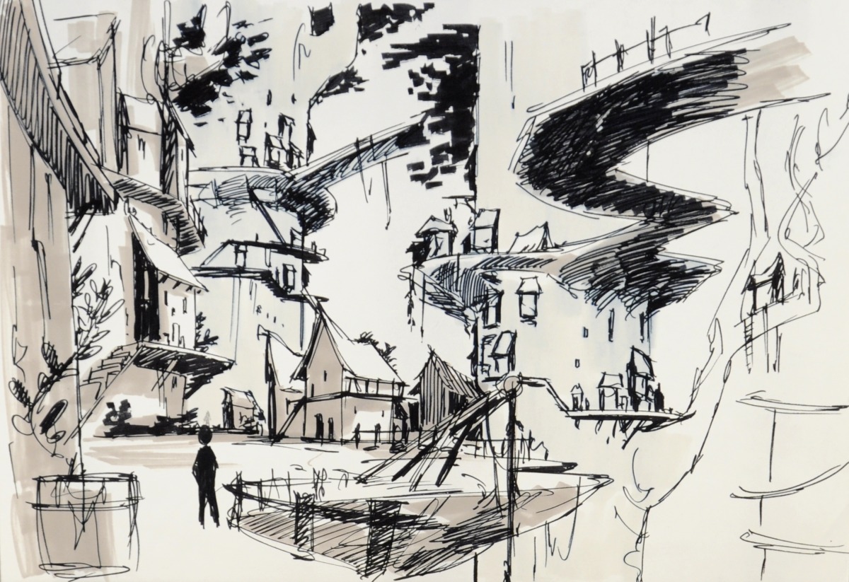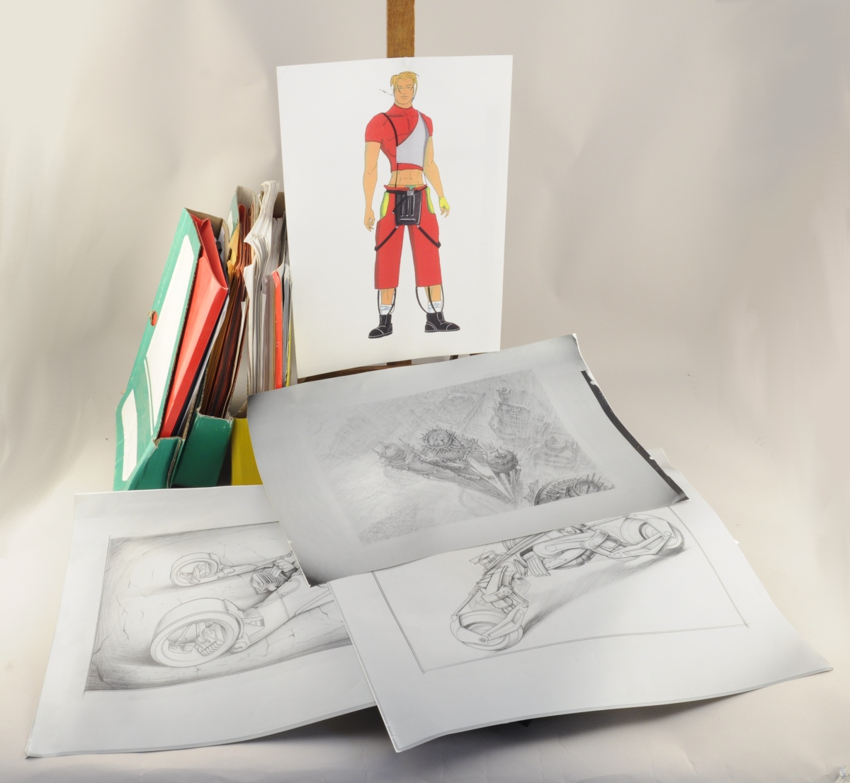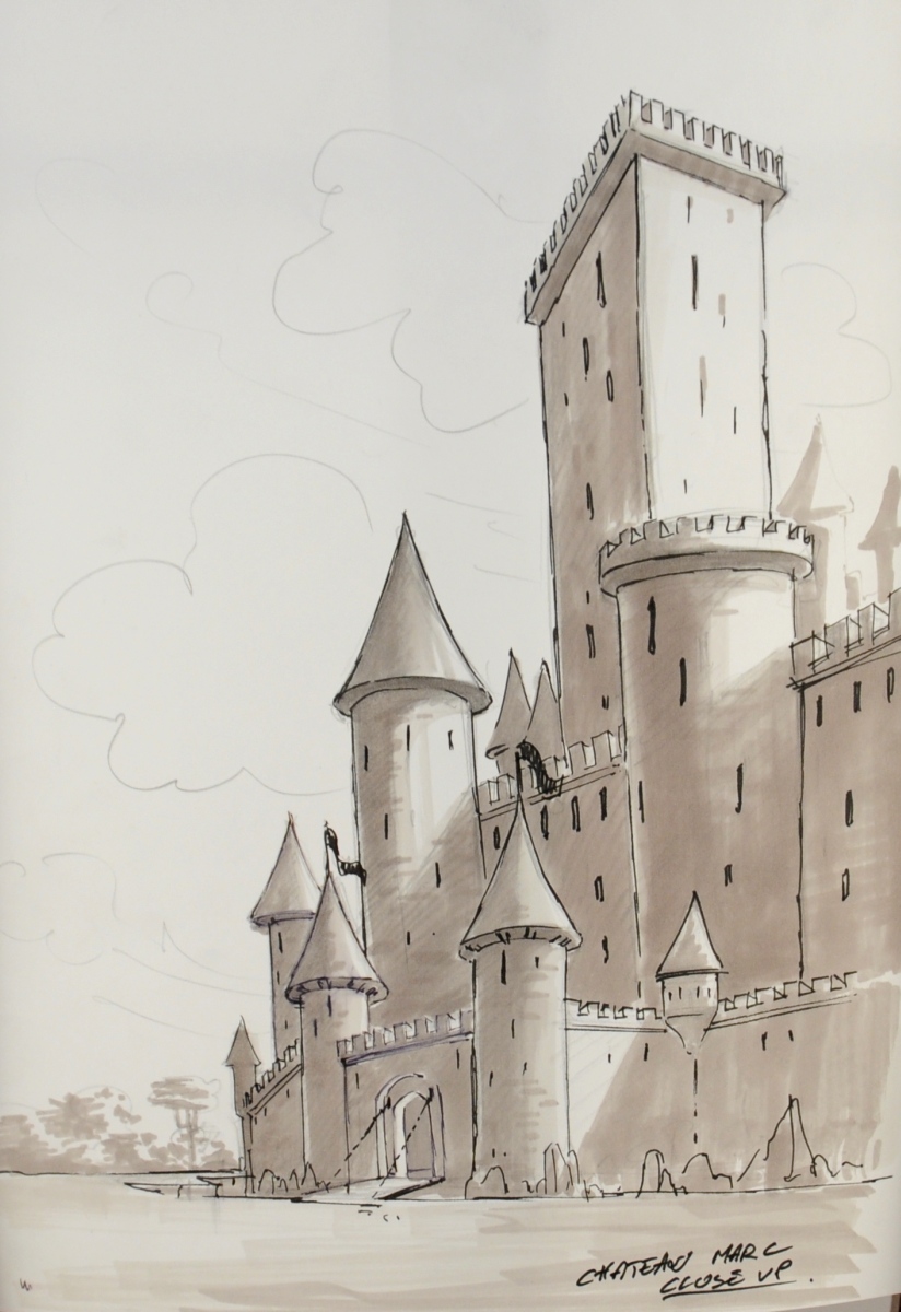 Carton des archives graphiques d'un épisode de la série de dessins animés " Tristan et Iseult " produite par Ares Films avec le CNC, comprenant notamment: model sheet, celluloïd et background...