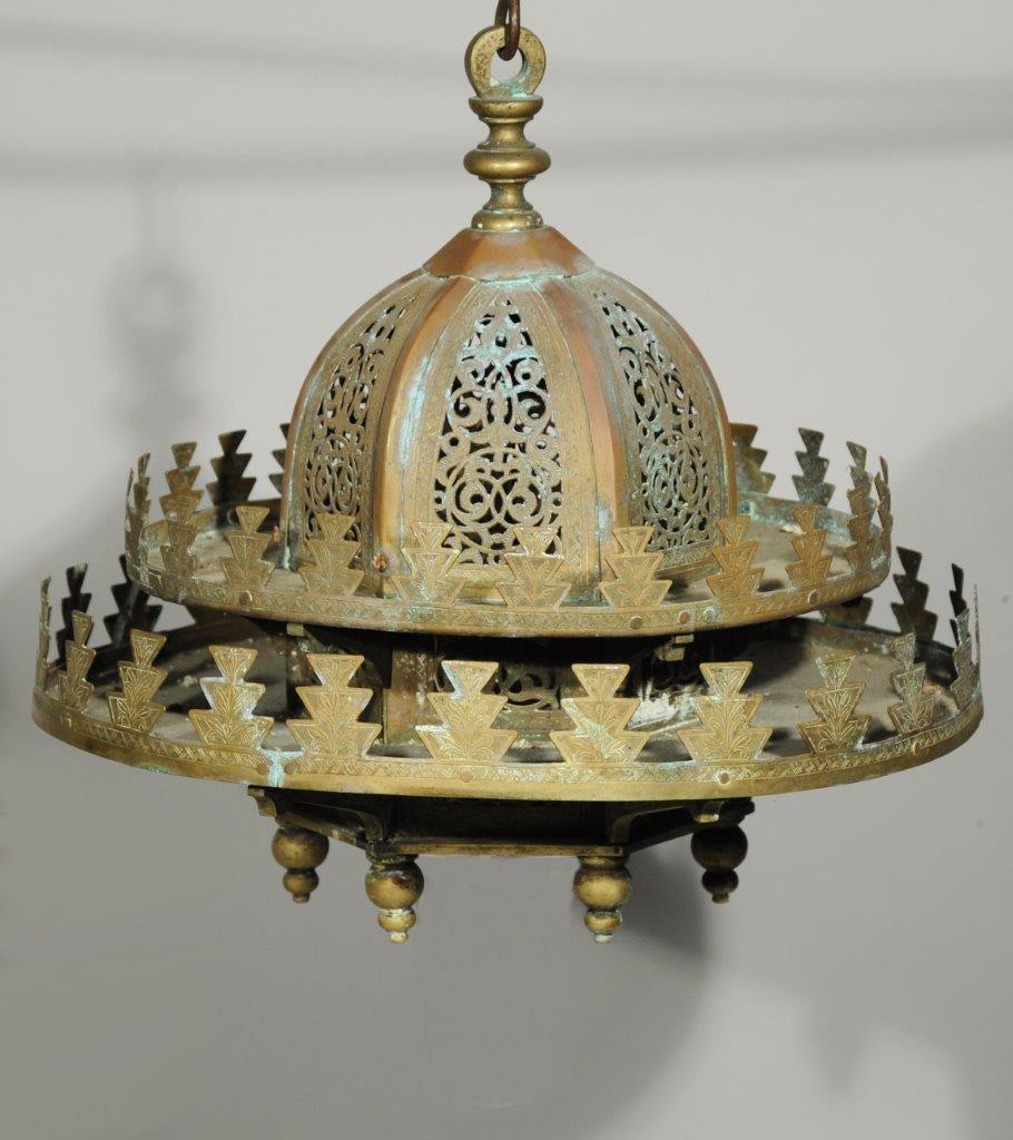 MAGHREB. LAMPE DE MOSQUÉE en laiton à décor d'arabesques et ornements géométriques ajourés.