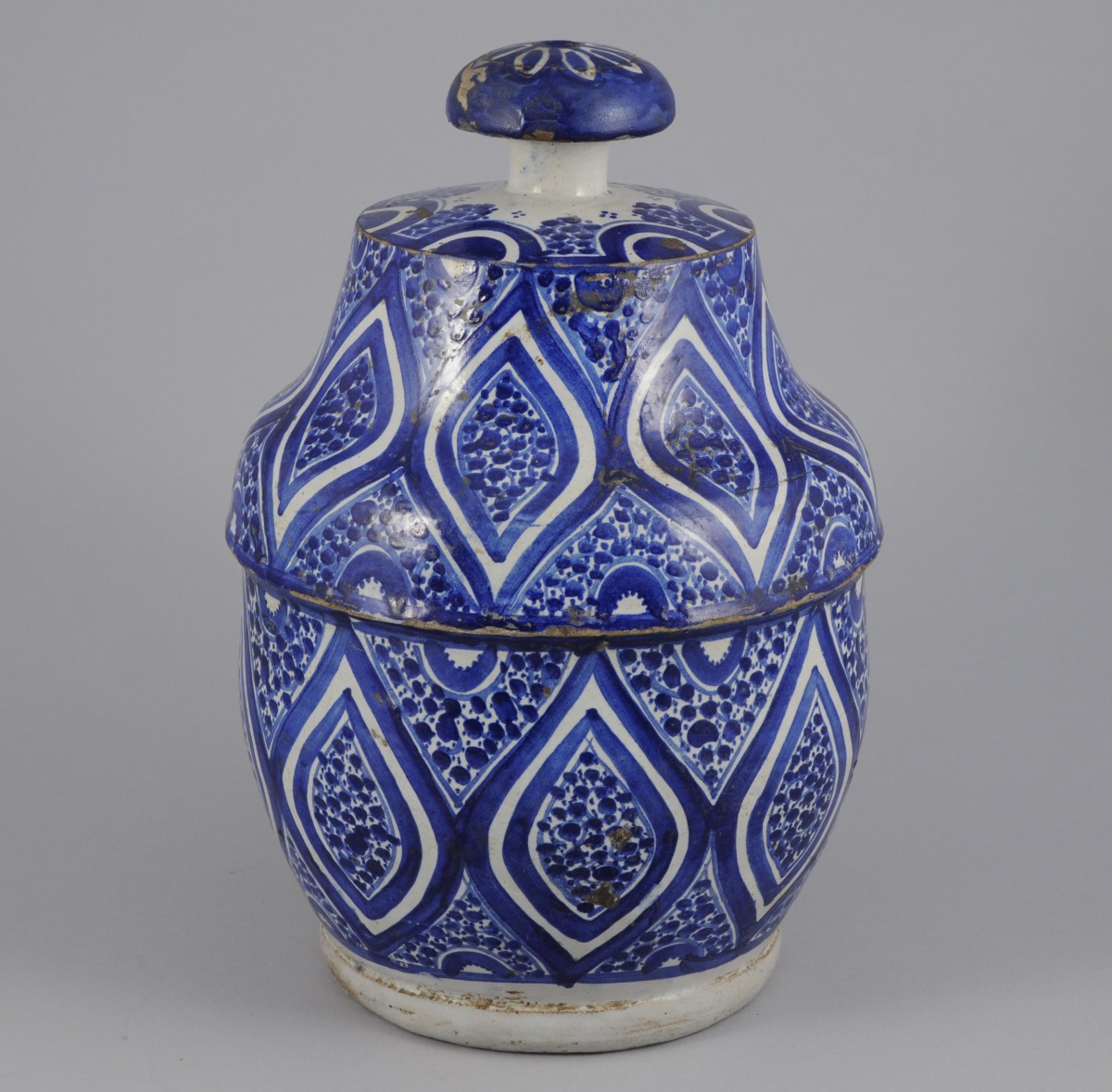 MAGHREB. POT COUVERT en faïence à décor en bleu et blanc de motifs stylisés.