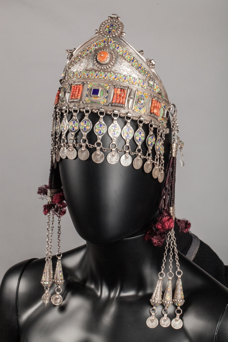 MAROC. PARURE de TÊTE en argent, corail et émail. Couronnement central surmonté d'une étoile émaillée entourée de perles en demi relief. Cabochon en corail et rais de coeur émaillé. Frise inférieure à perles en corail, pierres semi-précieuses bleues. Fuseaux sous lesquels pendent des fleurs émaillées et des pièces. Au extrémités deux longs bandeaux en cuir, cordes et fuseaux à piécettes en argent. Chainettes reliées à une monture émaillée en carré. Intérieur gainée de cuir.