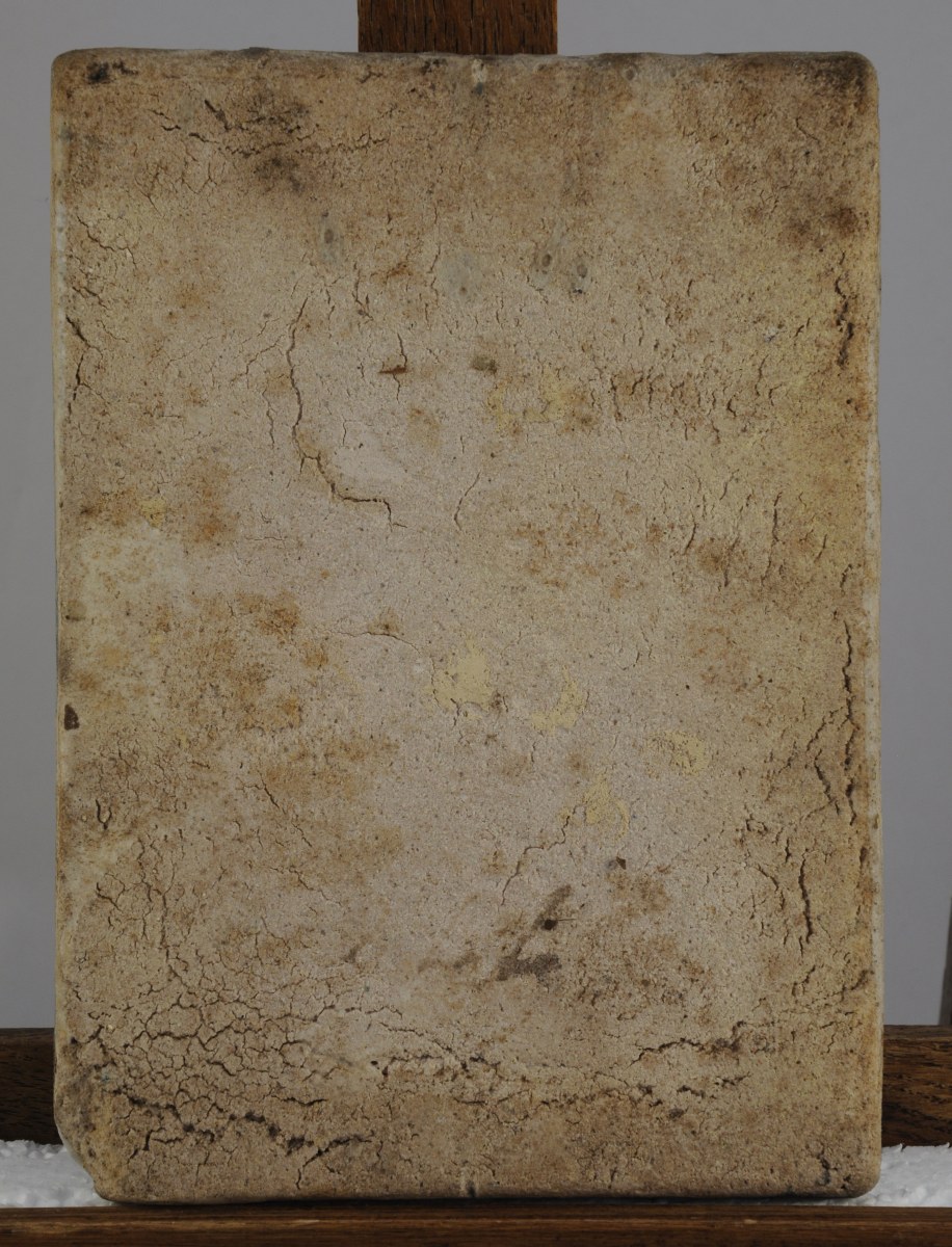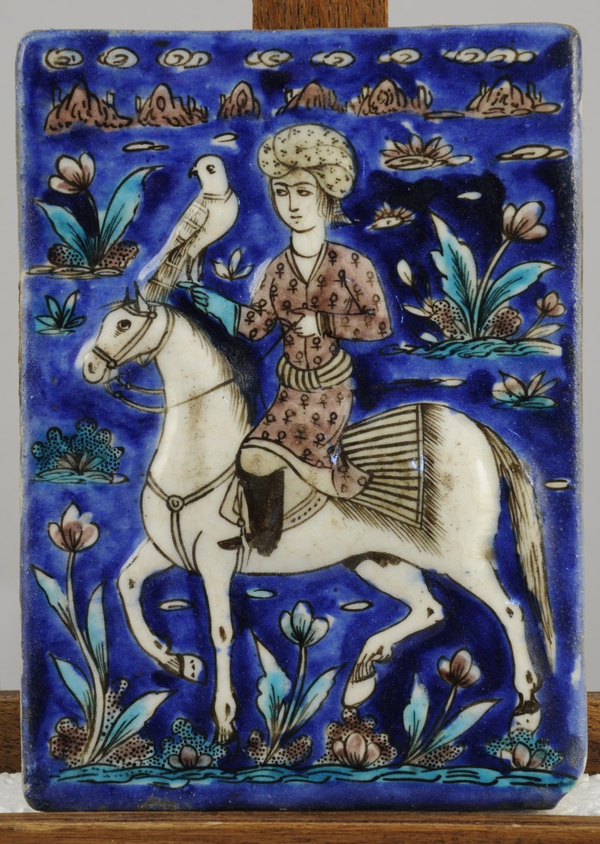 IRAN QÂJÂR. CARREAU de revêtement, cavalier au faucon. Céramique à décor polychrome moulé d'un cavalier, un faucon sur son poignet passnt à gauche sur fond bleu.