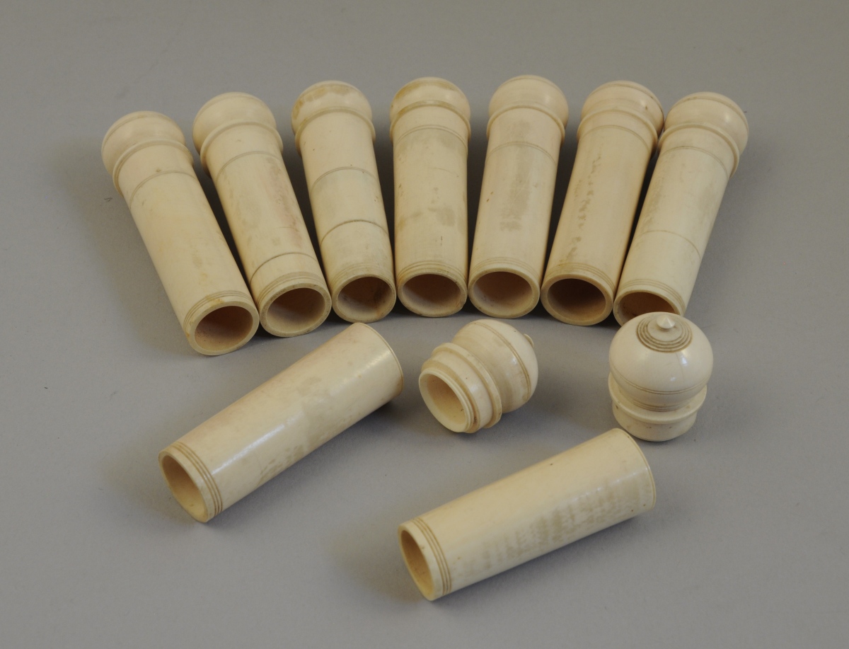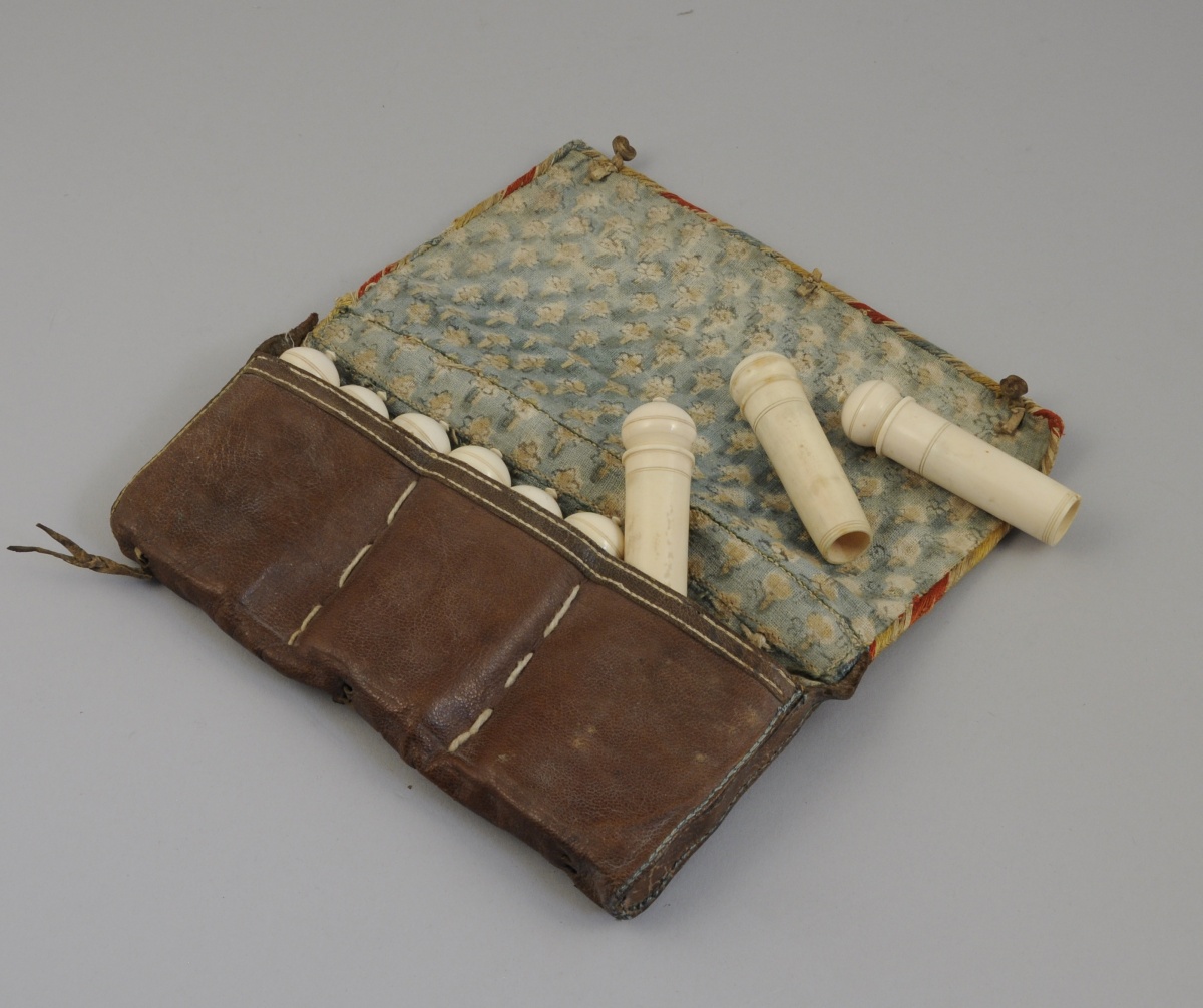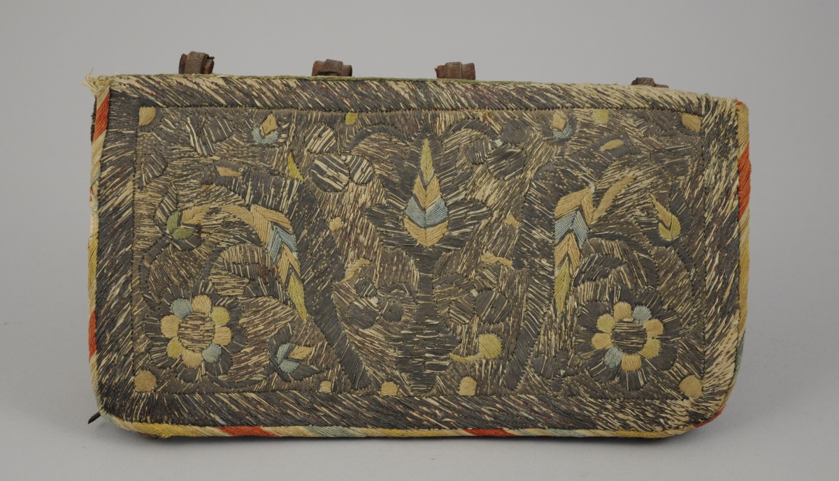 CAUCASE. CARTOUCHIÈRE en cuir. Pochette rectangulaire, à rabat brodé de fils métalliques et polychromes, dessinant une composition florale. À l'intérieur, trois compartiments contiennent neuf petits cylindres en os achevés en dôme.