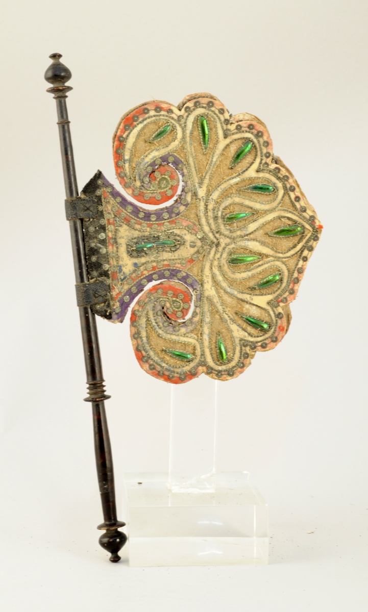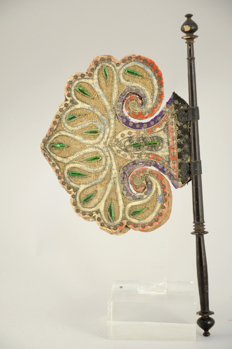 INDE. ÉVENTAIL en papier à une feuille de forme chantournée à enroulements. Elle est ornée de sequins, filets de métal et élytres de coléoptères. Manche en bois tourné et noirci.