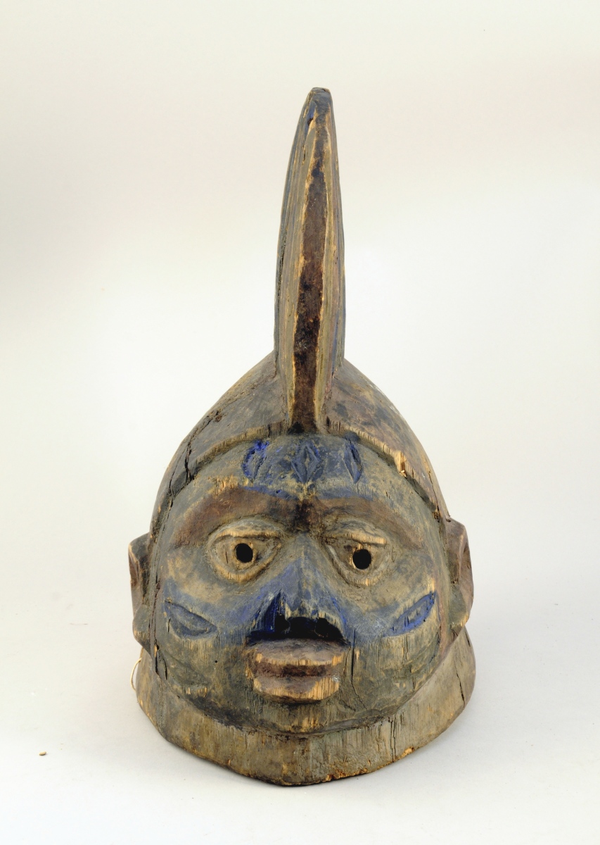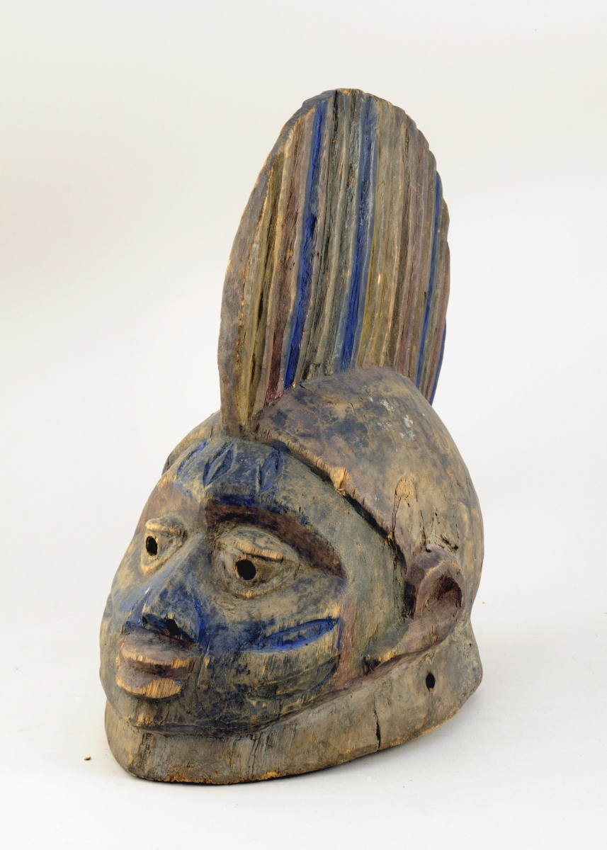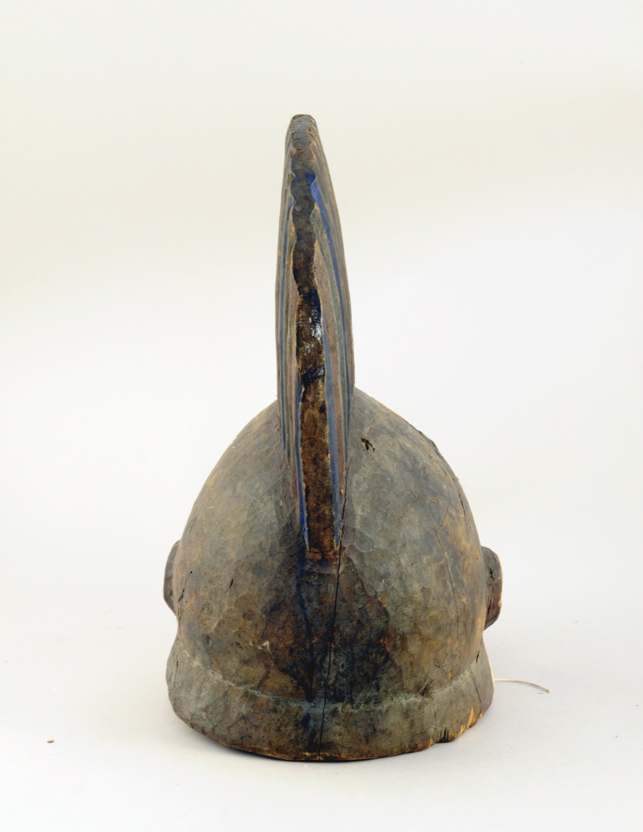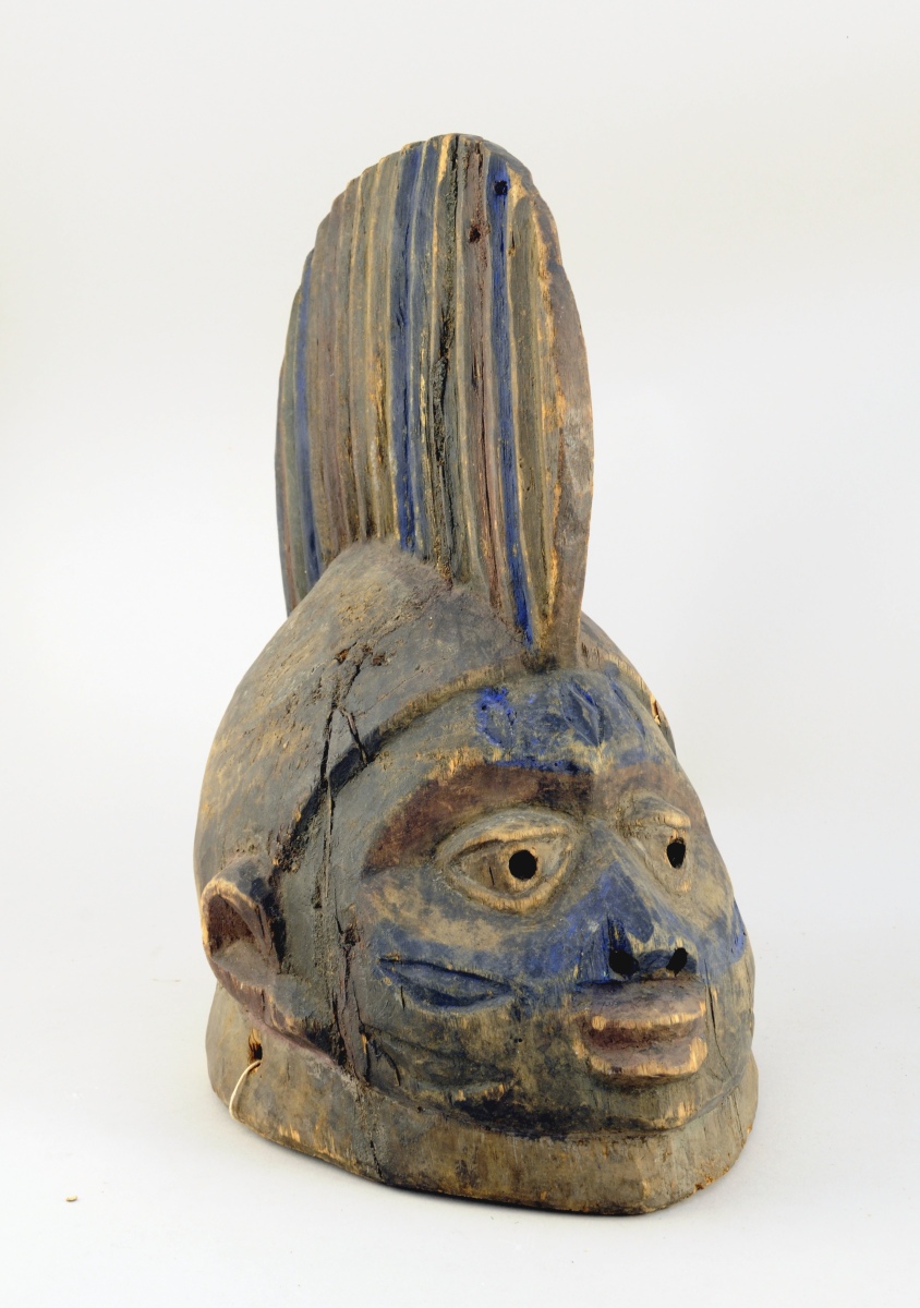 MASQUE YOURUBA en bois sculpté. Rehauts de peinture bleue.