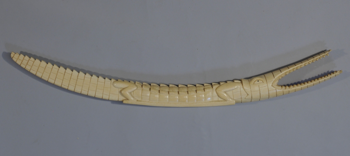 DÉFENSE d'éléphant en ivoire sculptée en crocodile.