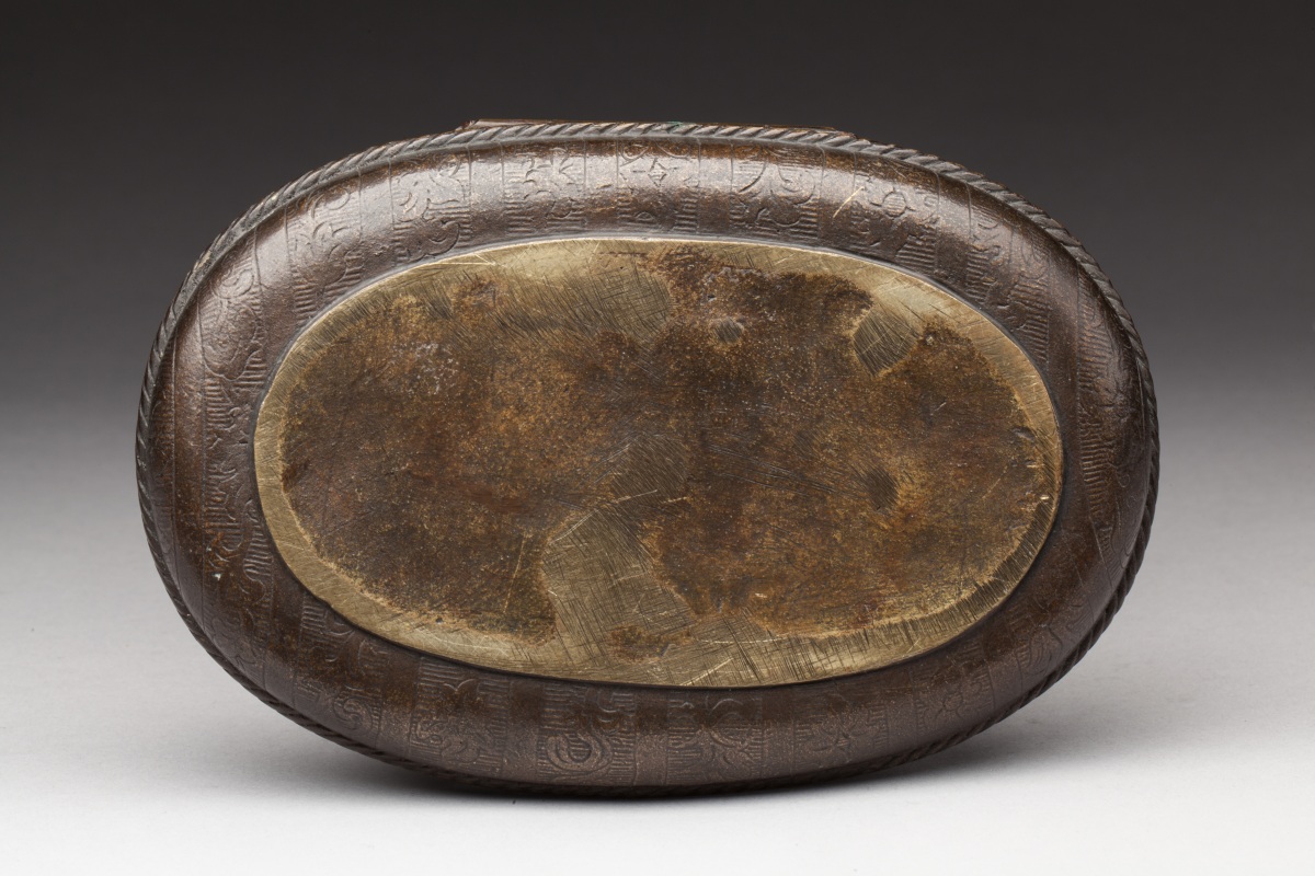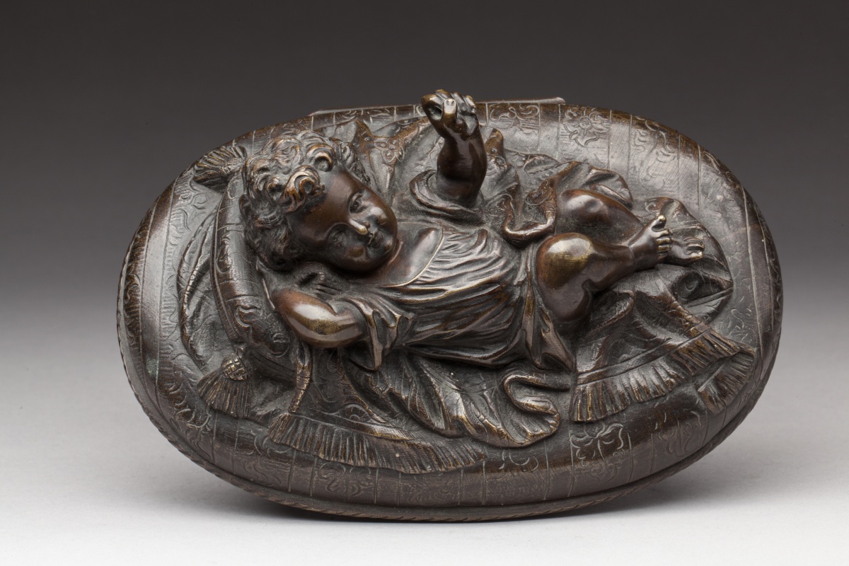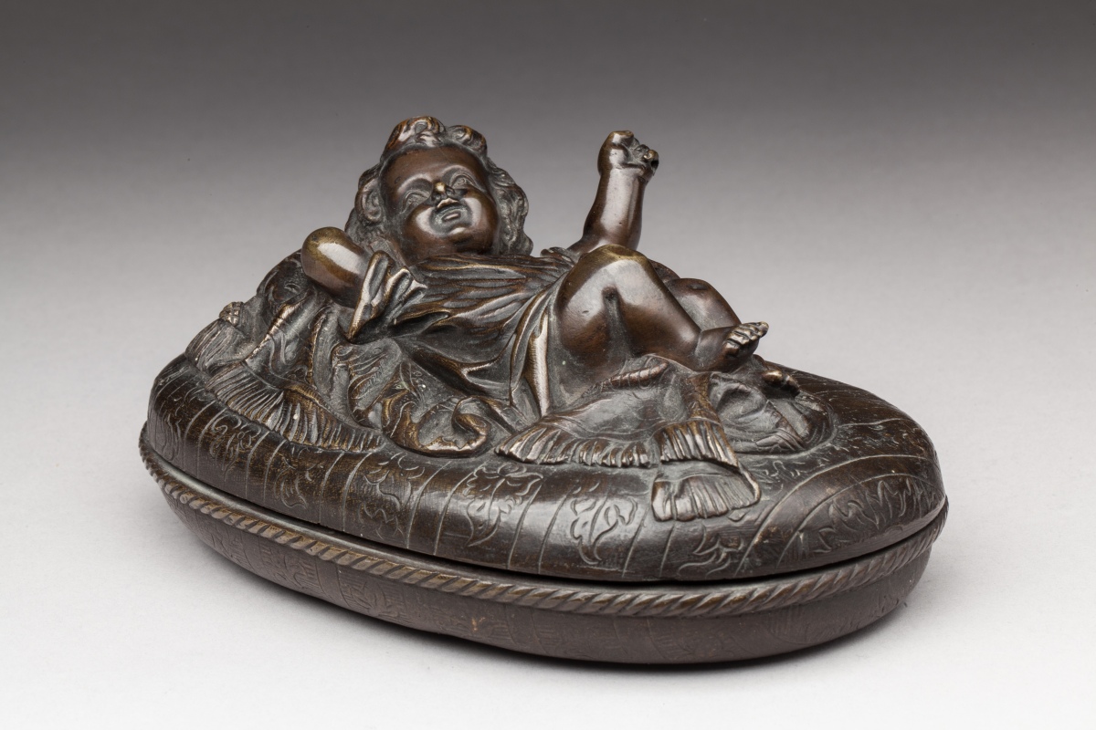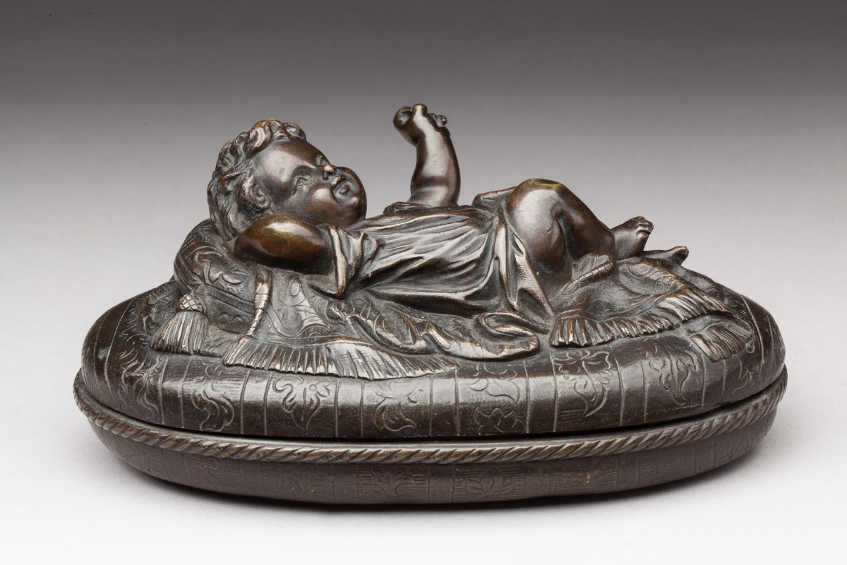 ENFANT JÉSUS en bronze pâtiné formant boite articulée par une charnière.