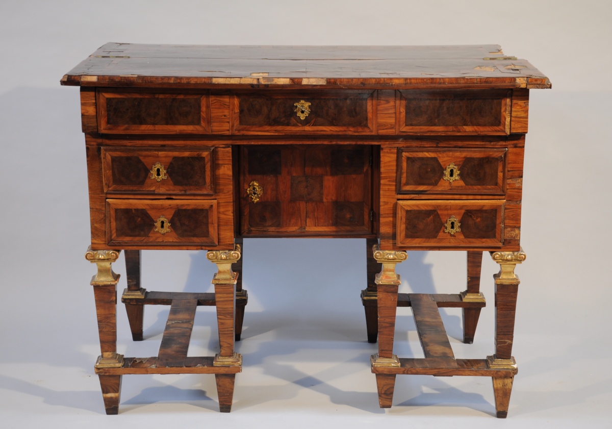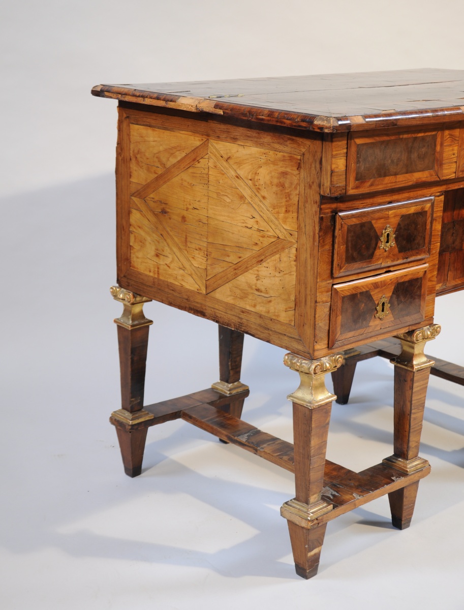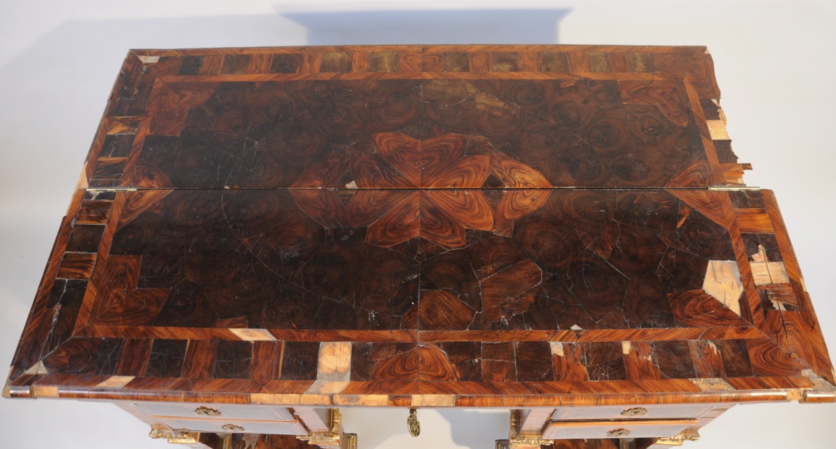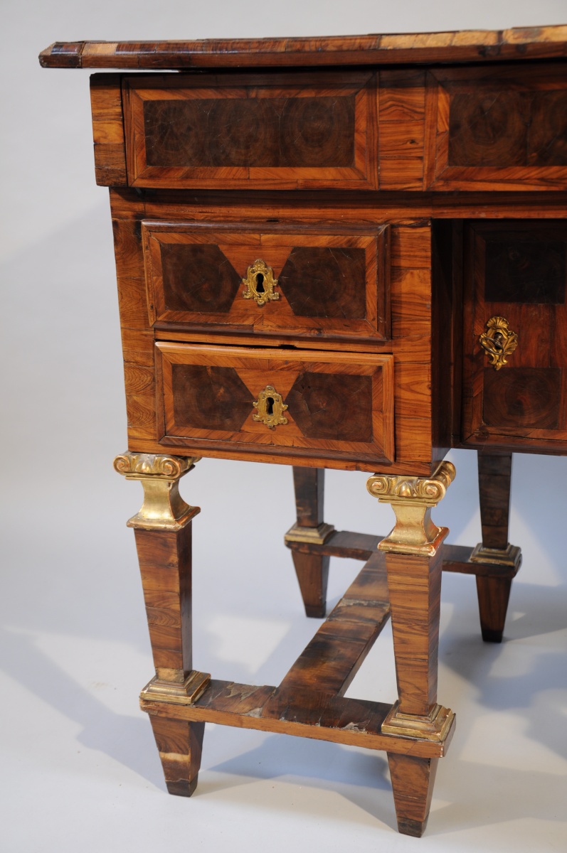 BUREAU MAZARIN de CHANGEUR de forme rectanglaire en placage de bois de violette, palissandre, bois de bout et bois indigènes à décor géométrisant marqueté toutes faces. Il ouvre en façade par quatre tiroirs et un vantail dissimulant un coffre. La ceinture abbatue et le plateau ouvert découvrent trois tiroirs. Il repose sur huit pieds gaine agrémentés d'un chapiteau ionique et d'une base en bois sculpté, stuqué et doré. Ils sont réunis par quatre par une entretoise en "H".