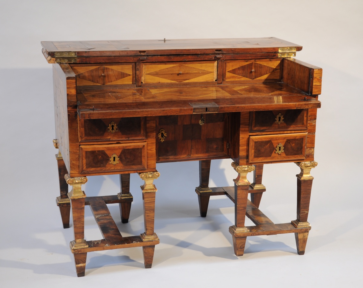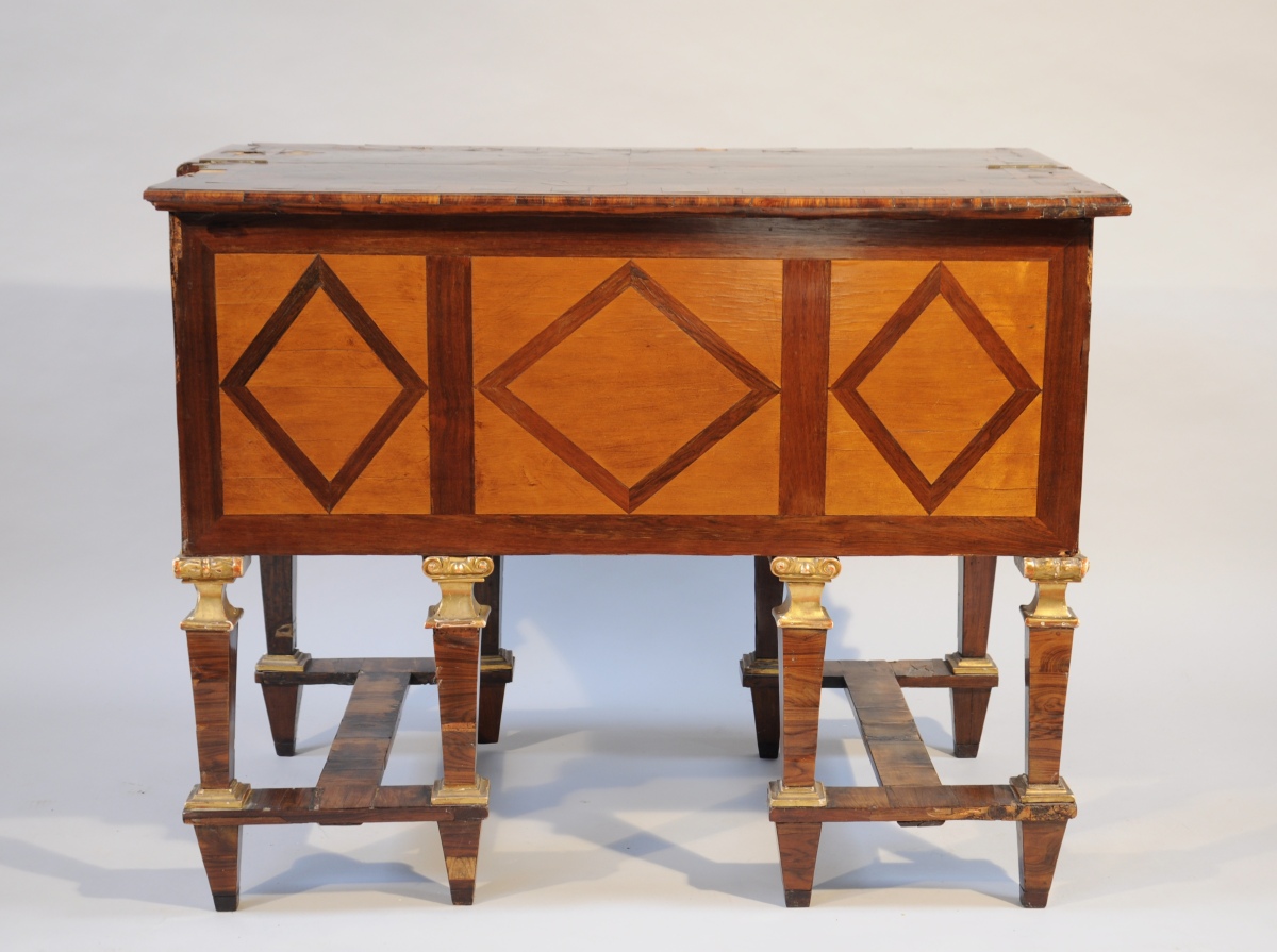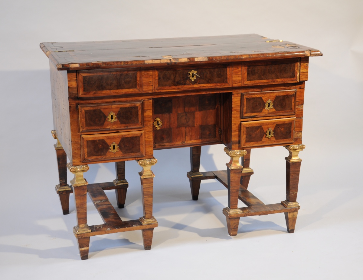 BUREAU MAZARIN de CHANGEUR de forme rectanglaire en placage de bois de violette, palissandre, bois de bout et bois indigènes à décor géométrisant marqueté toutes faces. Il ouvre en façade par quatre tiroirs et un vantail dissimulant un coffre. La ceinture abbatue et le plateau ouvert découvrent trois tiroirs. Il repose sur huit pieds gaine agrémentés d'un chapiteau ionique et d'une base en bois sculpté, stuqué et doré. Ils sont réunis par quatre par une entretoise en "H".