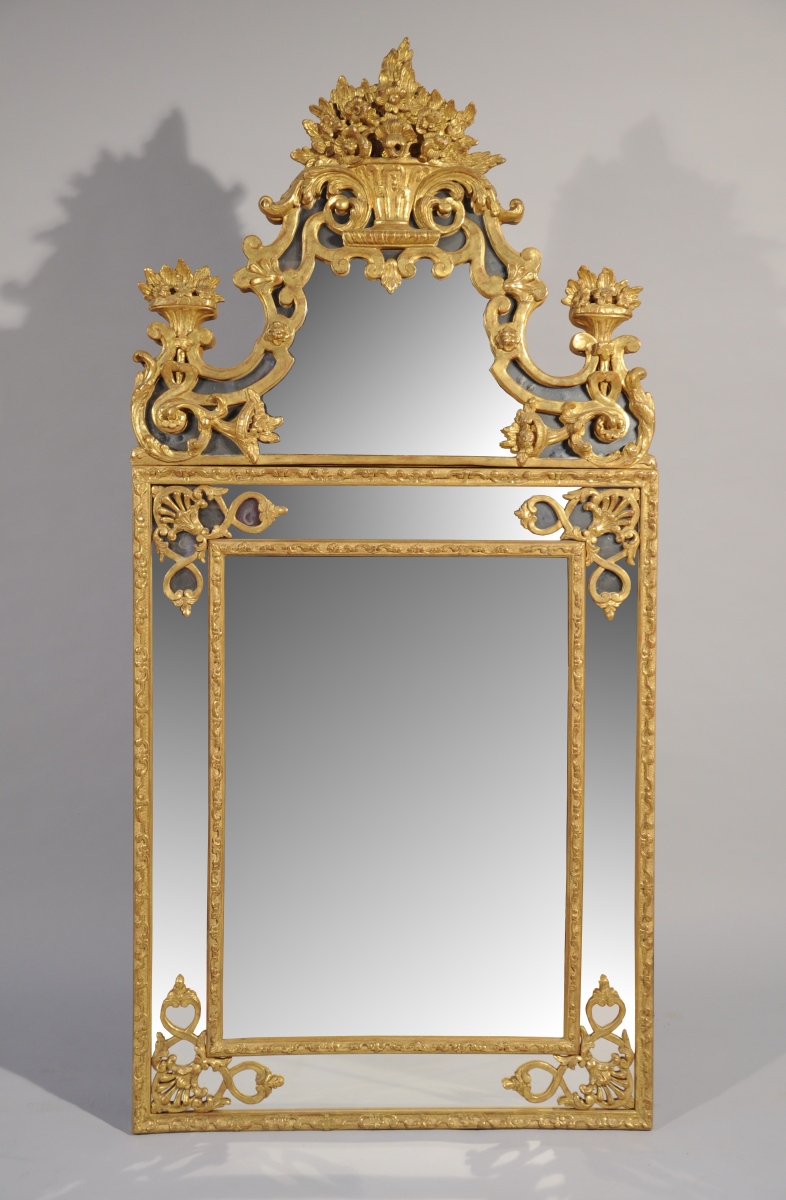 MIROIR à fronton en bois sculpté ajouré et doré à riche décor d'enroulements feuillagés, agrafes, palmettes et fleurettes. Le corps de forme rectangulaire agrementé de quatre écoinsons centrés d'une palmette inscrite dans des entrelacs. Le fronton sommé d'une importante coupe fleurie, flanqué, de part et d'autre, de deux paniers de fleurs reposant sur un motif terminé en corne d'abondance.