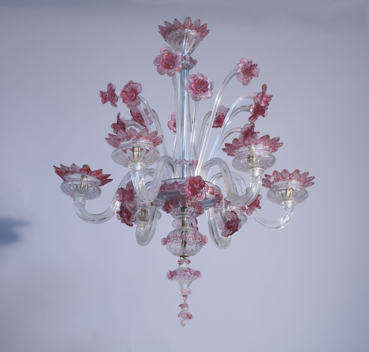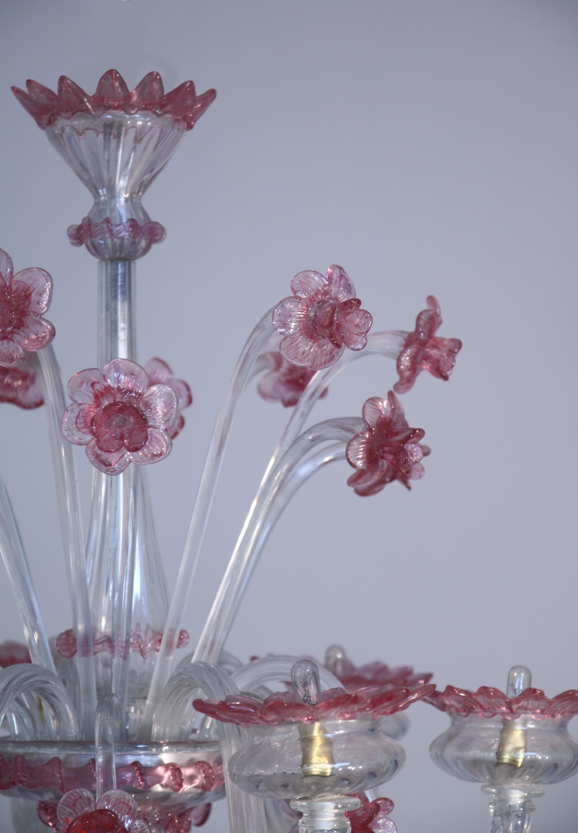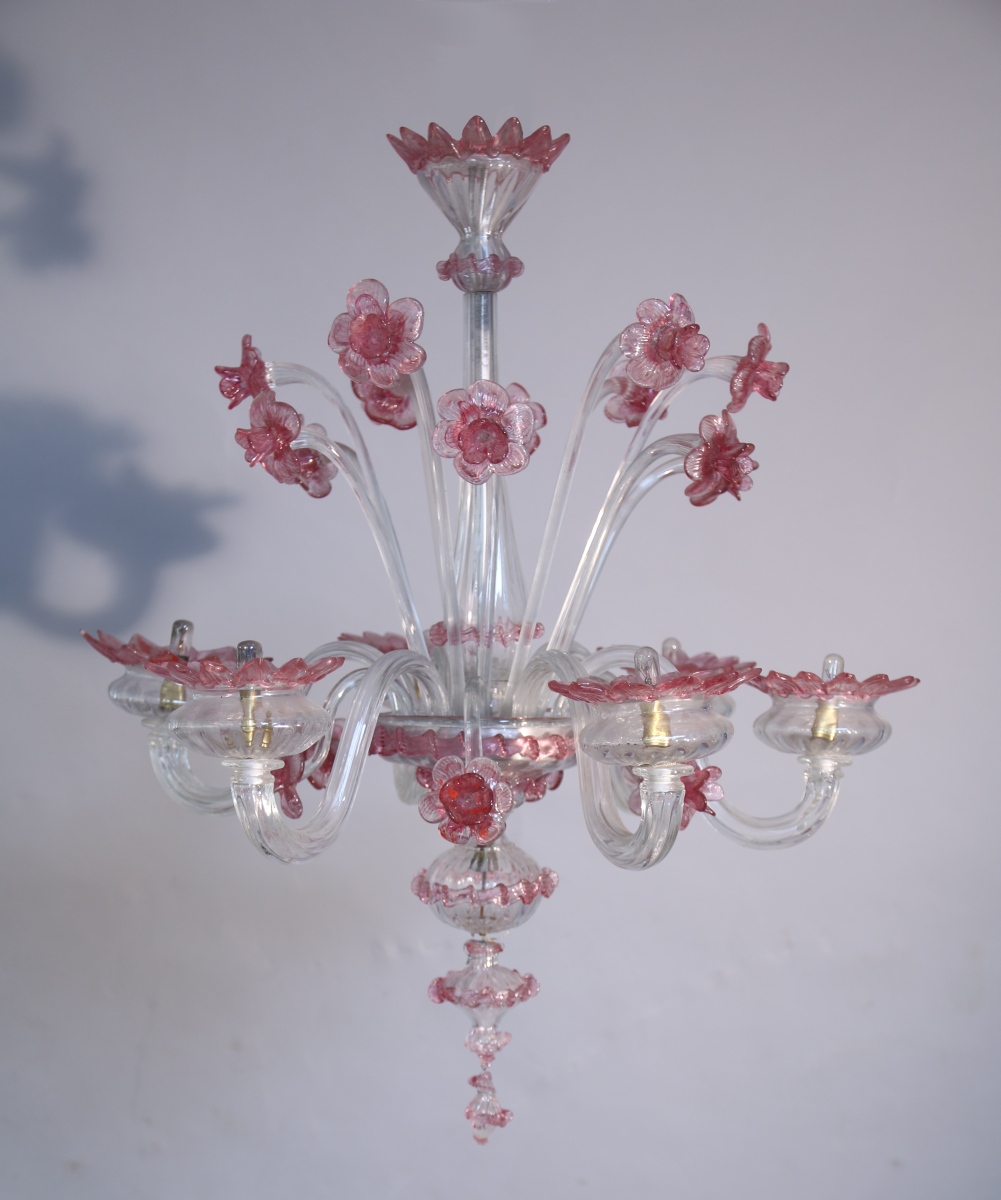 LUSTRE à six bras de lumières en verre de Venise blanc et rose à décor de jonquilles et de tournesols.