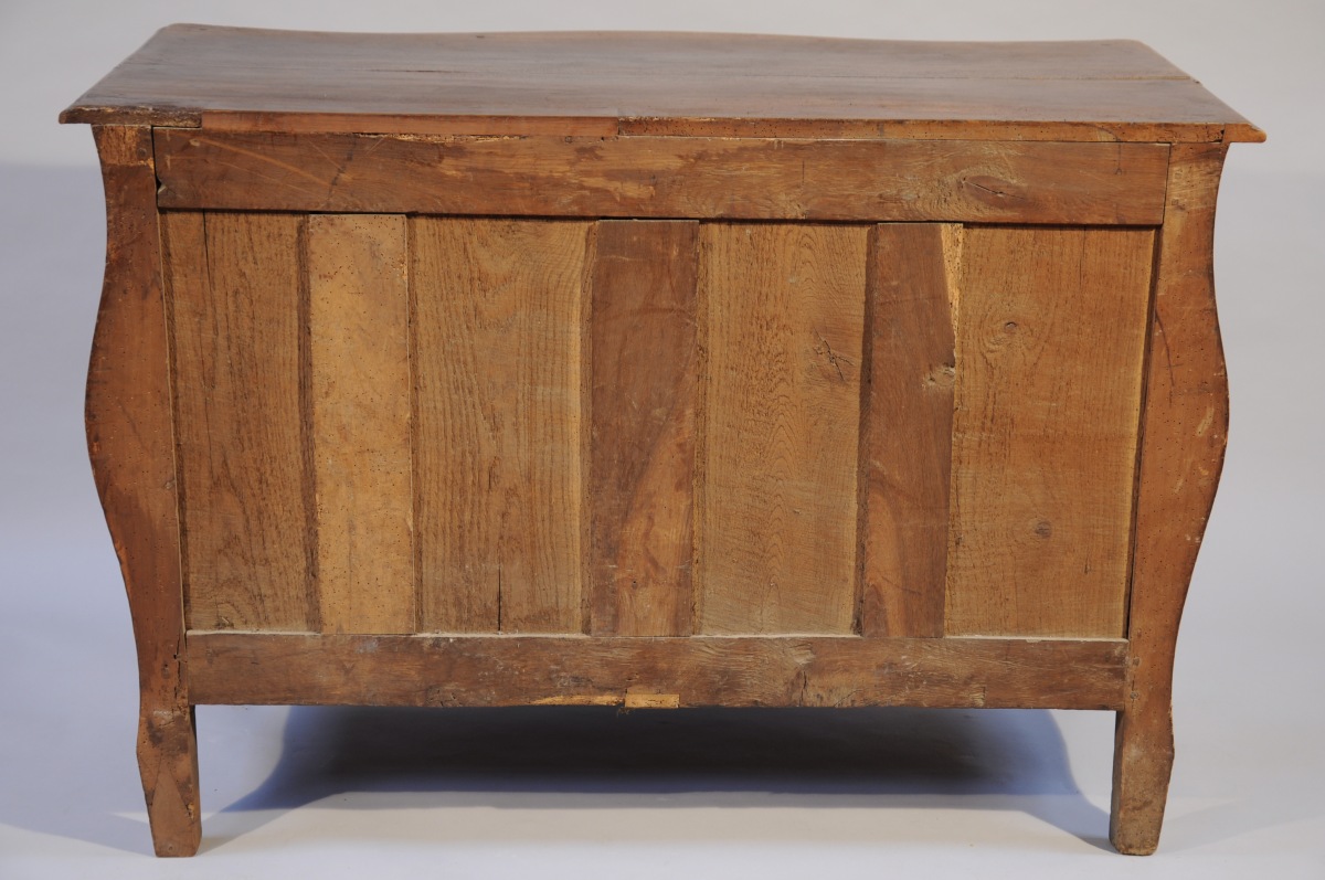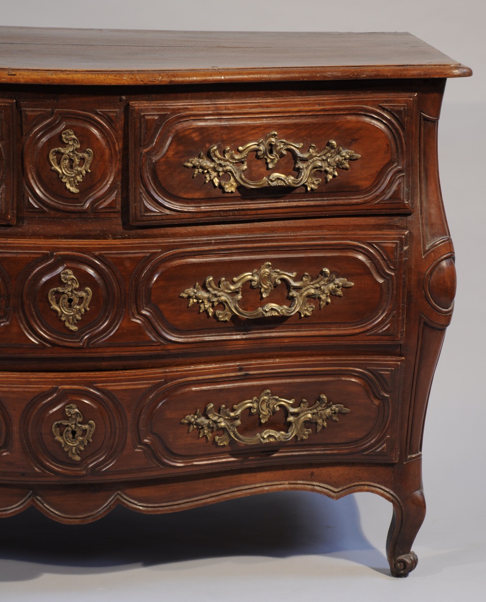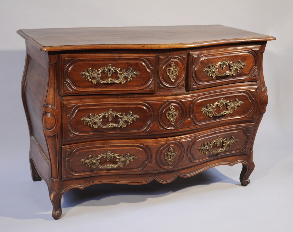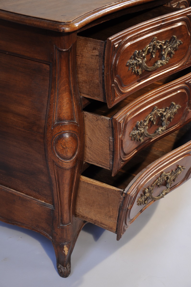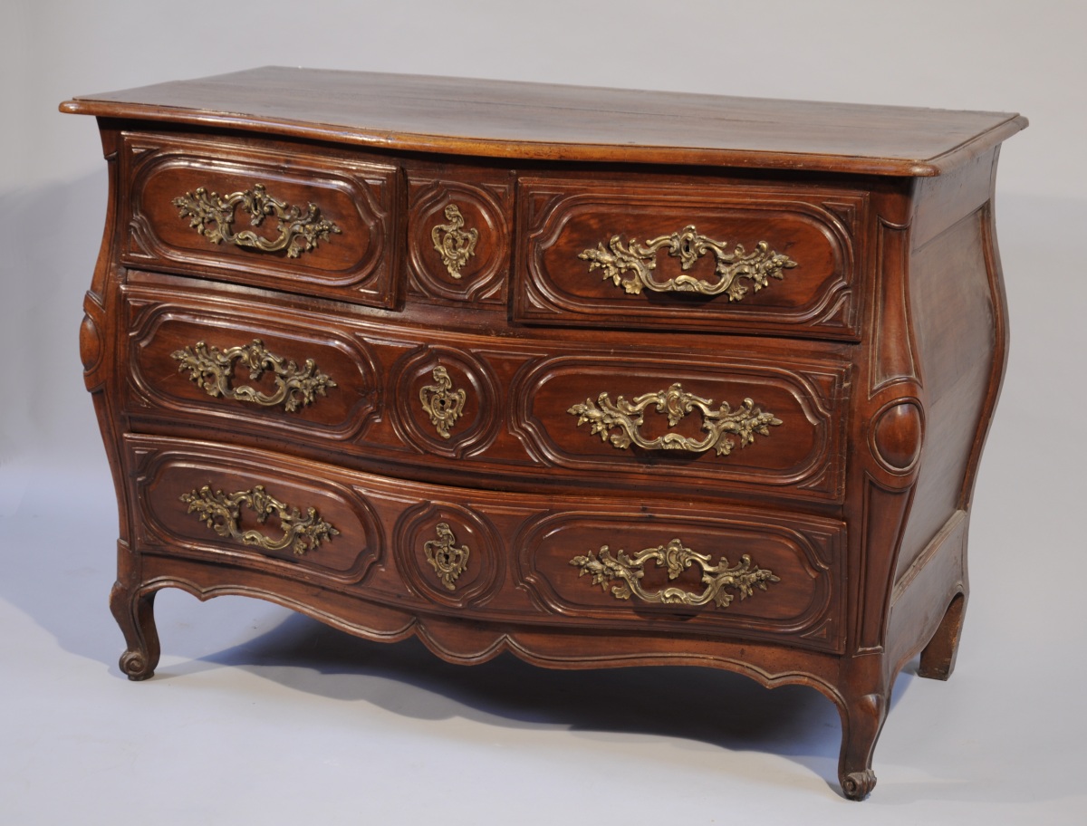 COMMODE GALBÉE en noyer mouluré. Elle ouvre en façade par quatre tiroirs sur trois rangs. Elle repose sur quatre pieds réunis par des traverses mouvementées, les pieds antérieurs à enroulement, les pieds postérieurs droits.