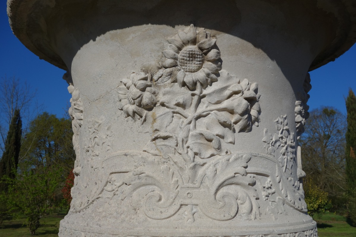 Grand VASE sur piédouche à décor de TOURNESOLS en pierre recomposée. Sur la panse, trois fleurs allégoriques illustrent le cycle de la vie et de la mort du tournesol. De riches frises de feuillages, lambrequins et rinceaux agrémentent le vase.