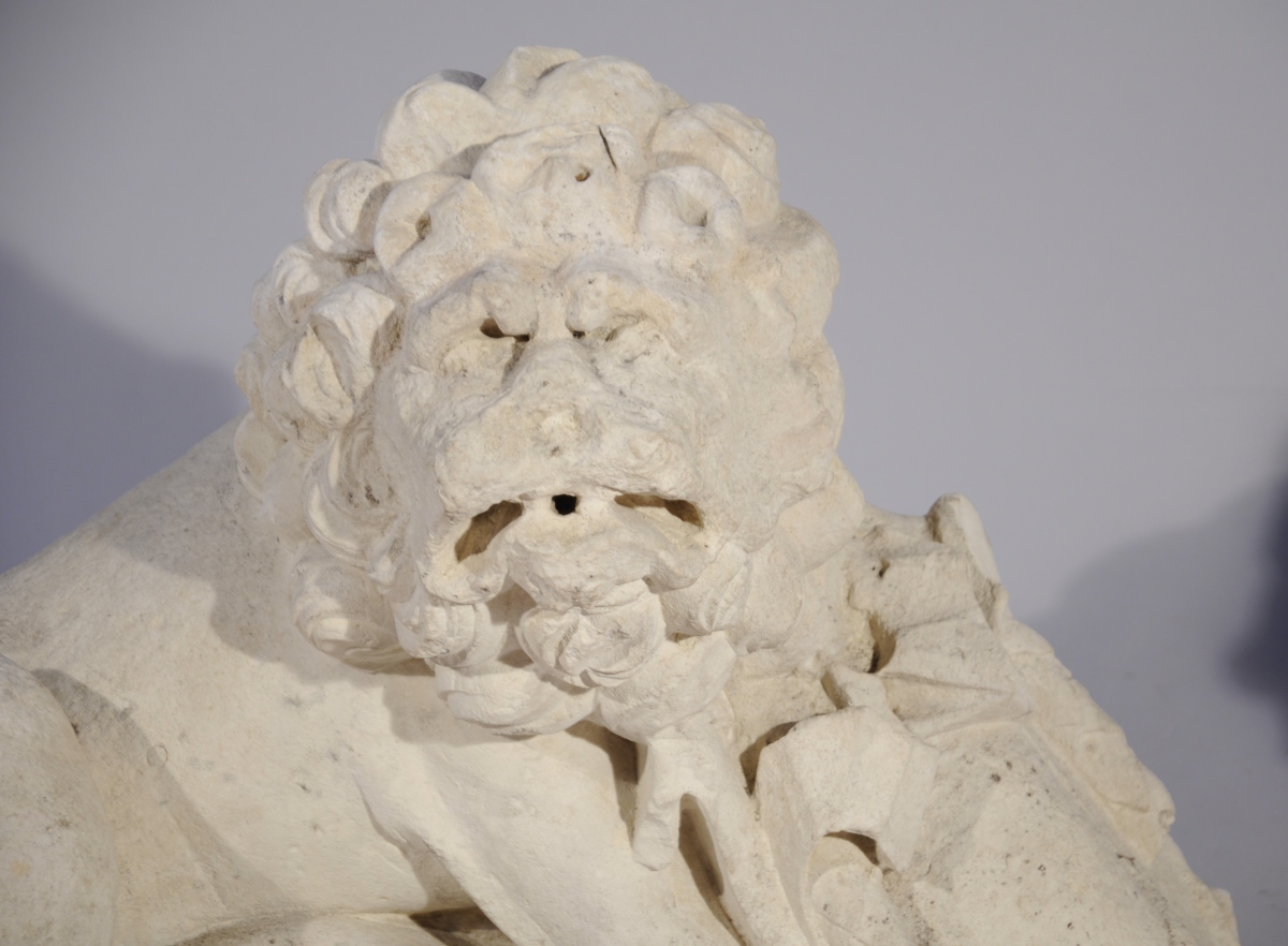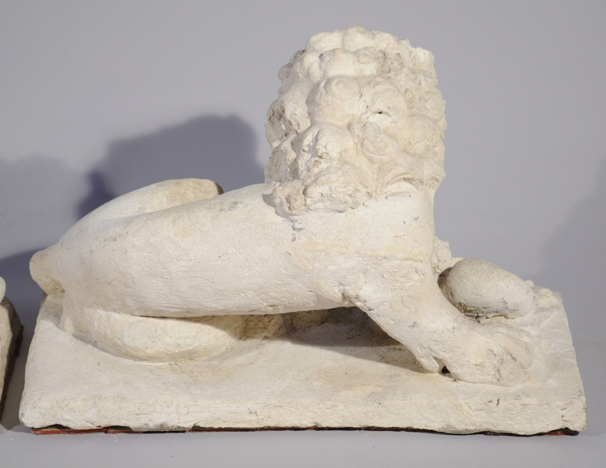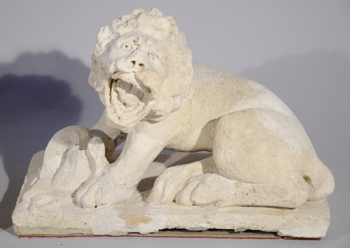 Paire de LIONS en pierre calcaire. Ils se tiennent couchés sur une terrasse, les pattes avant encadrant un cartouche feuillagé. L'un rugissant.