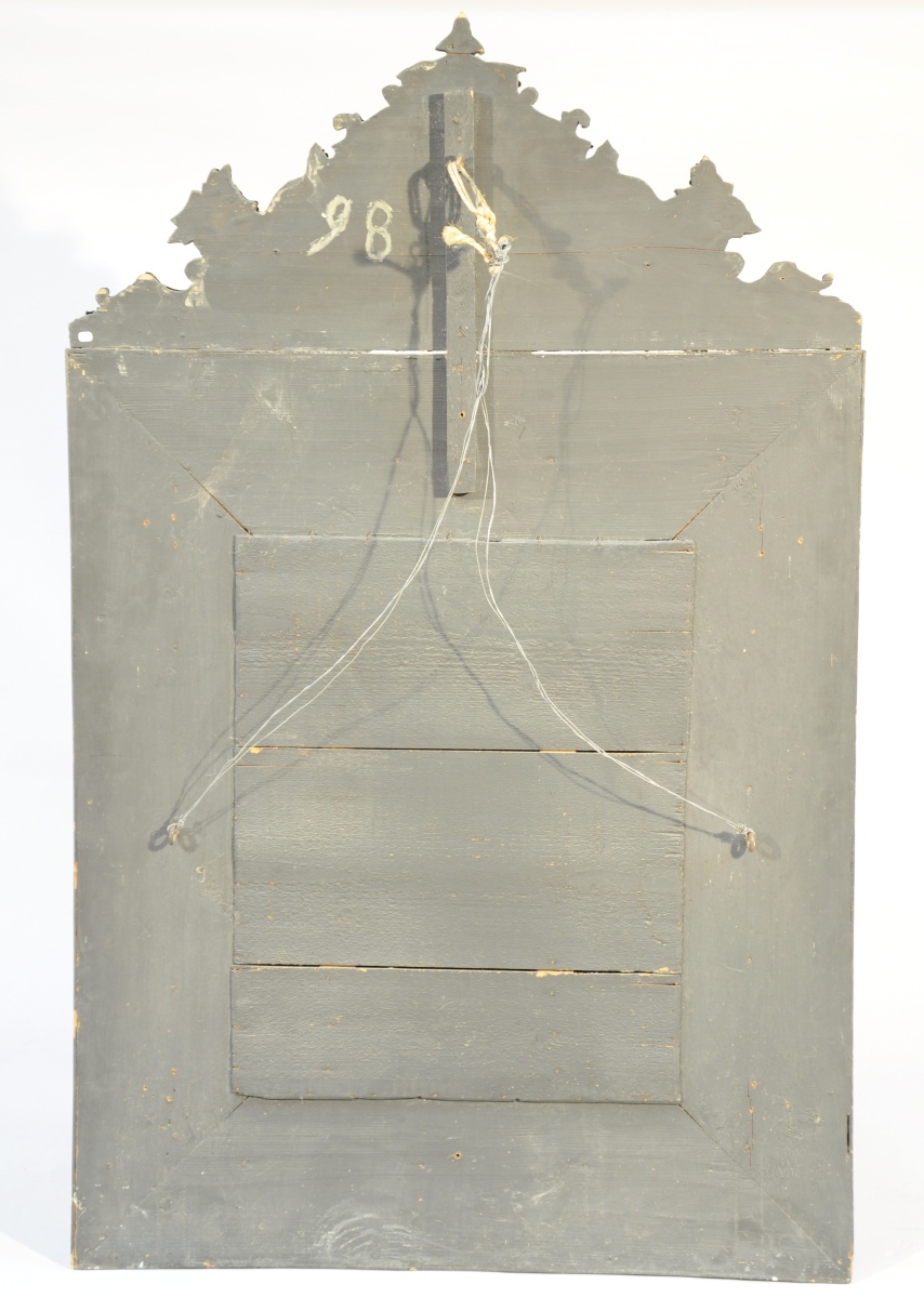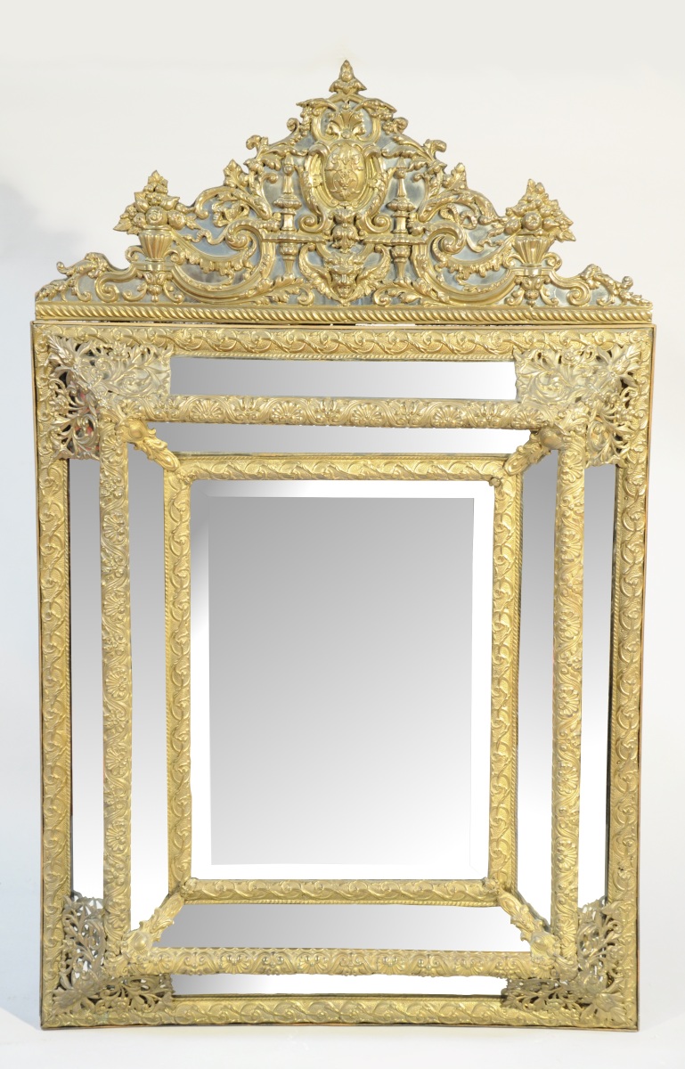 MIROIR À FRONTON de forme rectangulaire à pare closes. Riche ornementation de pomponne repoussé et ajouré de feuillages stylisés. Le fronton orné de vases fleuris, rinceaux, enroulements, masques de faunes et centré d'un médaillon de forme ovale. La glace centrale biseautée.