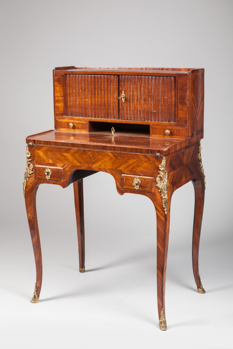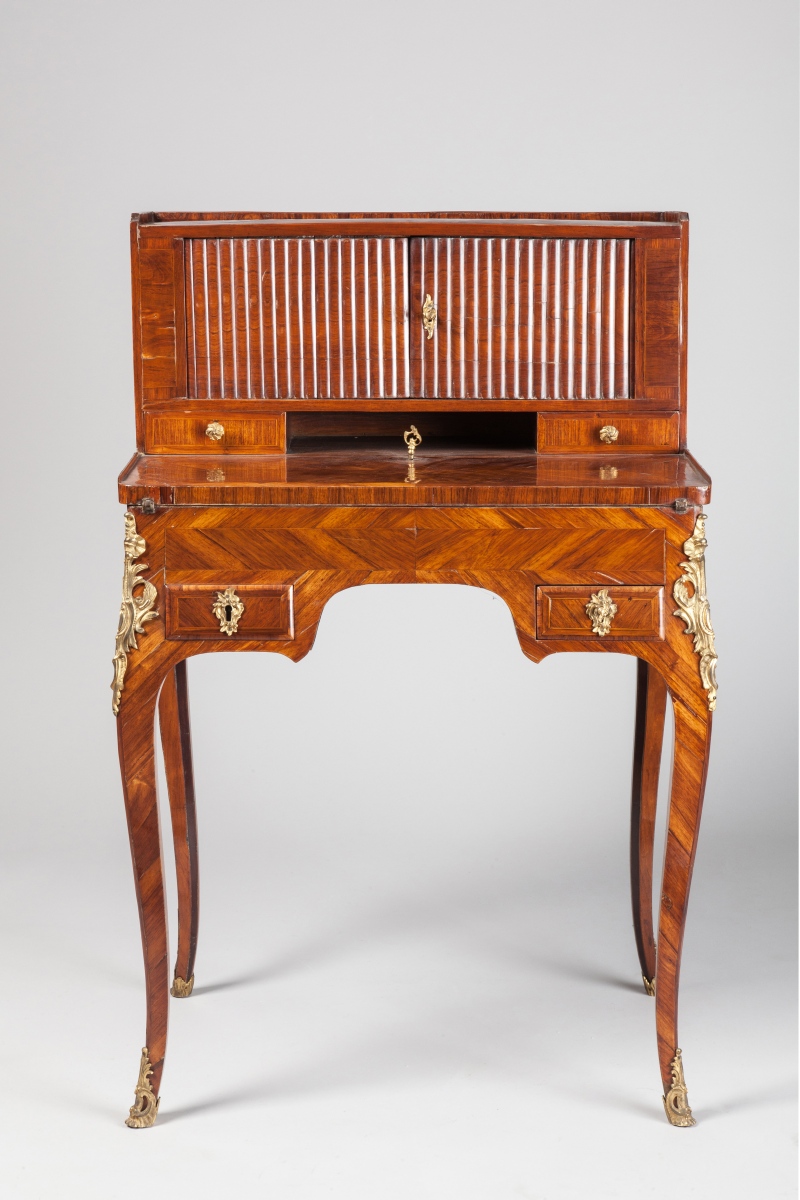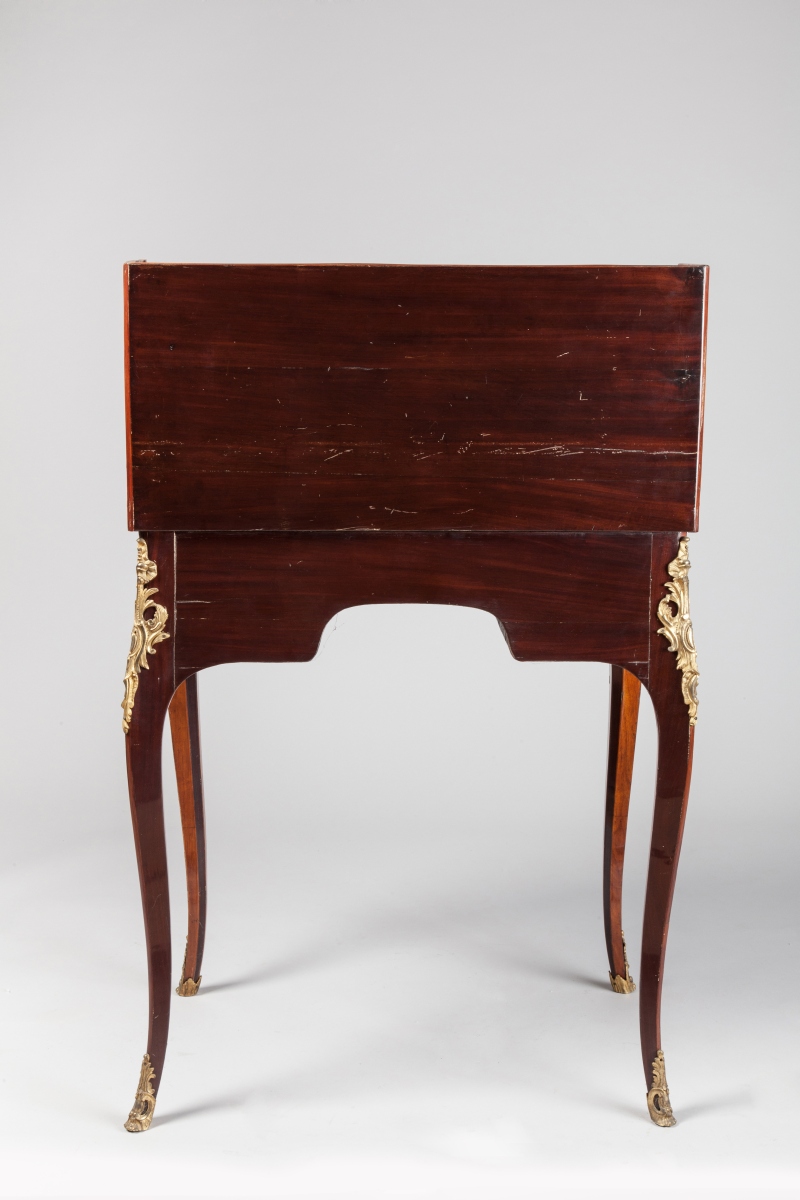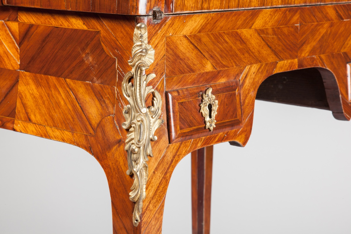 BONHEUR du JOUR en bois de placage et marqueterie toutes faces, en satiné et bois de rose. Il présente un gradin à portes à rideaux coulissants, reposant sur deux tiroirs et une niche. Il ouvre à un abattant dissimulant un plateau coulissant encadré de deux caissons. Deux petits tiroirs en façade. Piètement galbé.