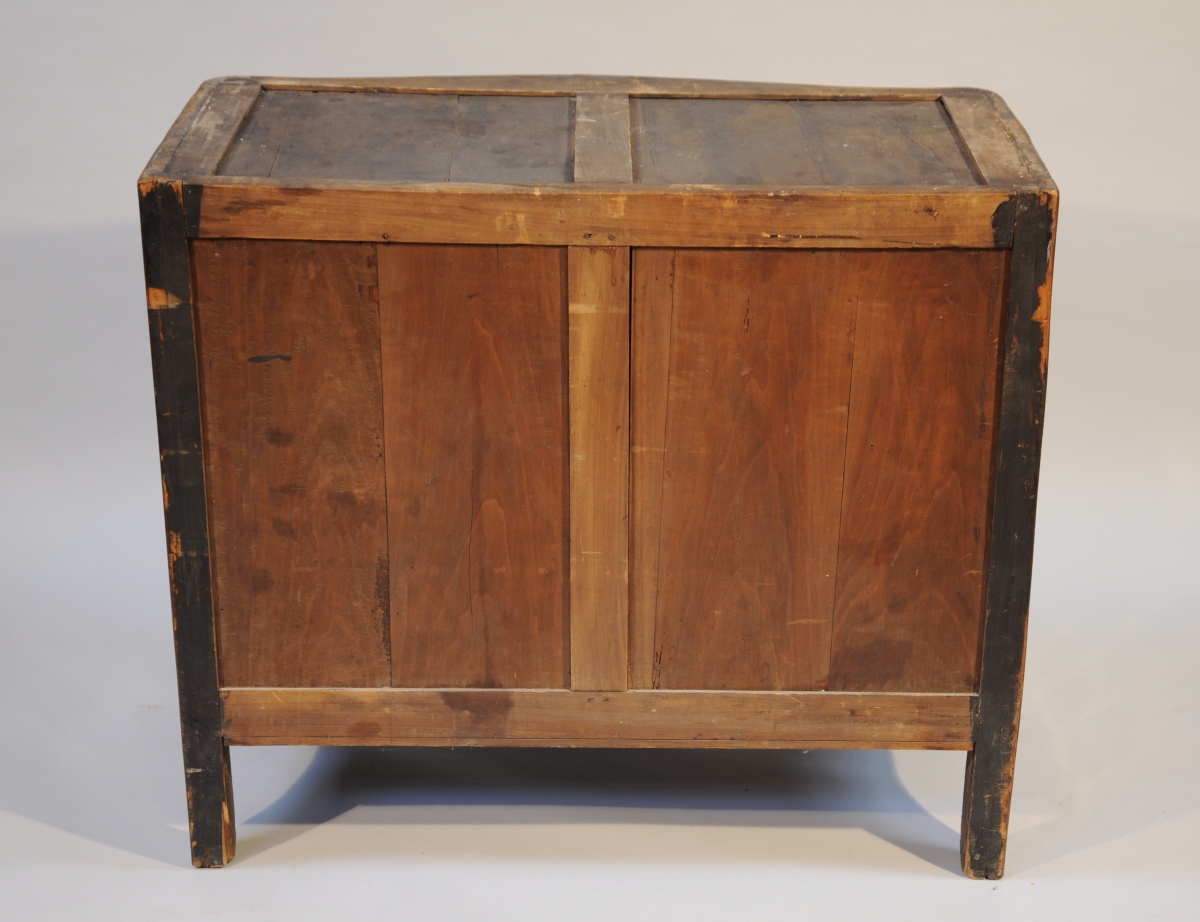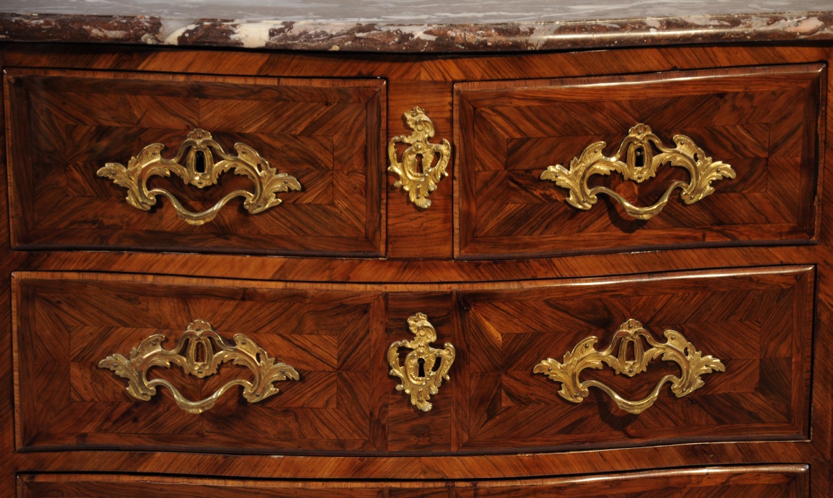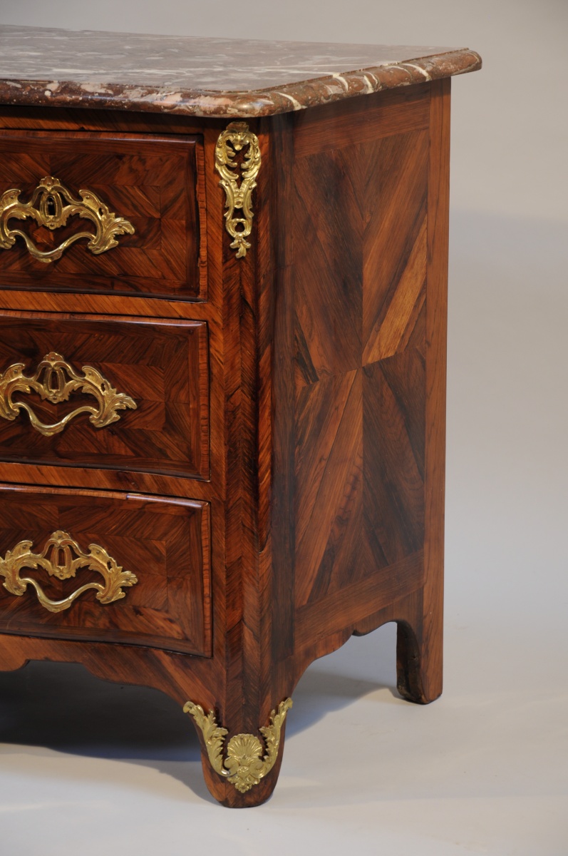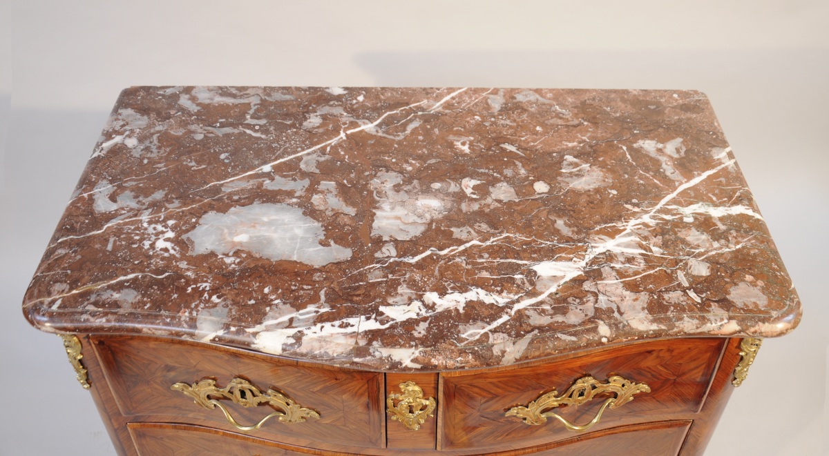 Petite COMMODE à façade légèrement bombée en placage de bois de violette ouvrant par quatre tiroirs sur trois rangs. Traverses basses chantournées. Elle repose sur quatre pieds droits. Trace d'estampille. Dessus de marbre rouge veiné blanc (restaurations).