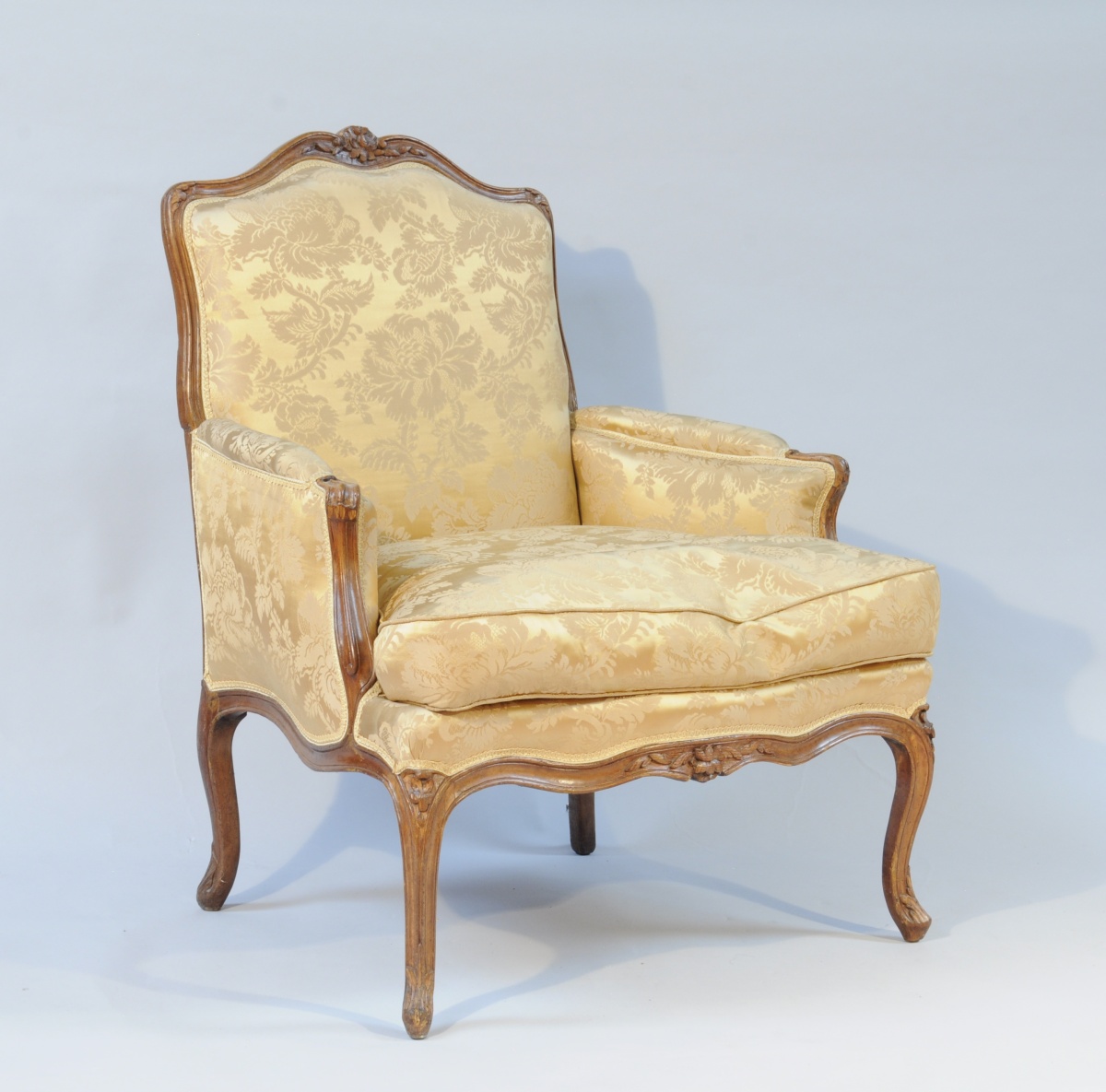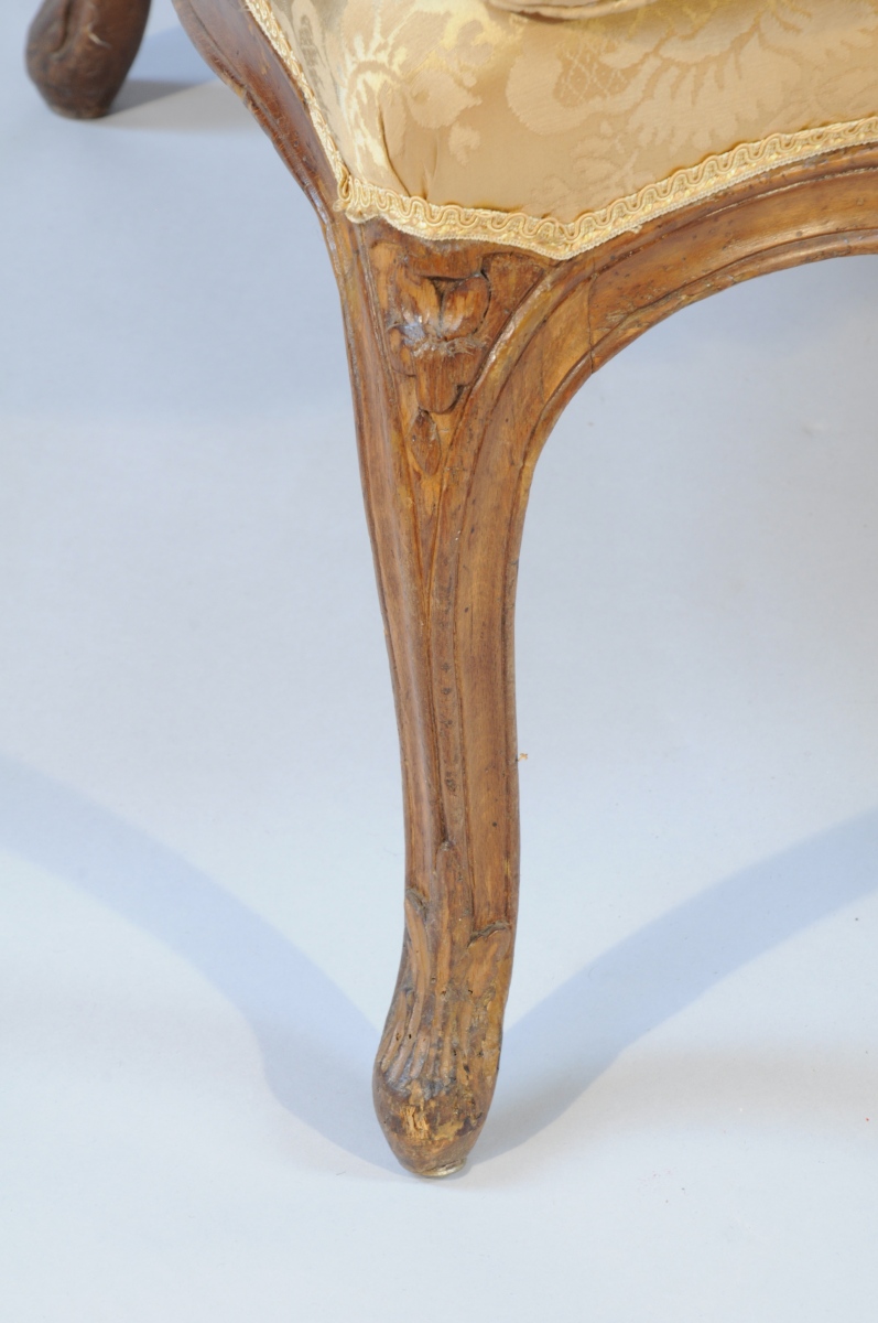 BERGÈRE en hêtre naturel mouluré et sculpté. Dossier chantourné, consoles d'accotoir en coup de fouet. Traverse haute du dossier et ceinture sculptée d'un motif feuillagé. Il repose sur quatre pieds cambrés à feuilles d'acanthe, les deux antérieurs sculptés d'une fleurette en chute.