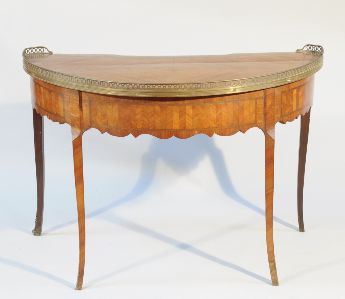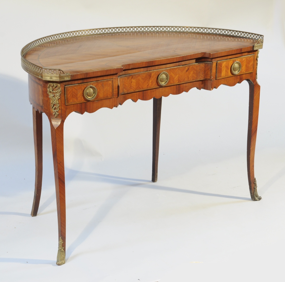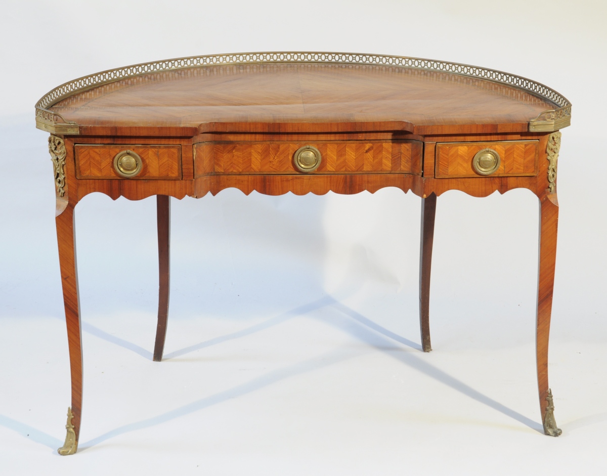 TABLE à ÉCRIRE DEMI-LUNE en marqueterie de bois de rose, toutes faces, à décor de frisage en chevrons en ceinture et en fougère encadré d'un filet de marqueterie dite a topo pour le plateau. Ce dernier ceint d'une galerie en laiton ajourée d'une frise d'or. La ceinture découpée ouvre en façade par trois tiroirs. Repose sur quatre pieds cambrés. Garniture de bronze telle que: anneaux mobiles à frise de lauriers centrés d'une urne, chute ajourée de feuillages et sabots.