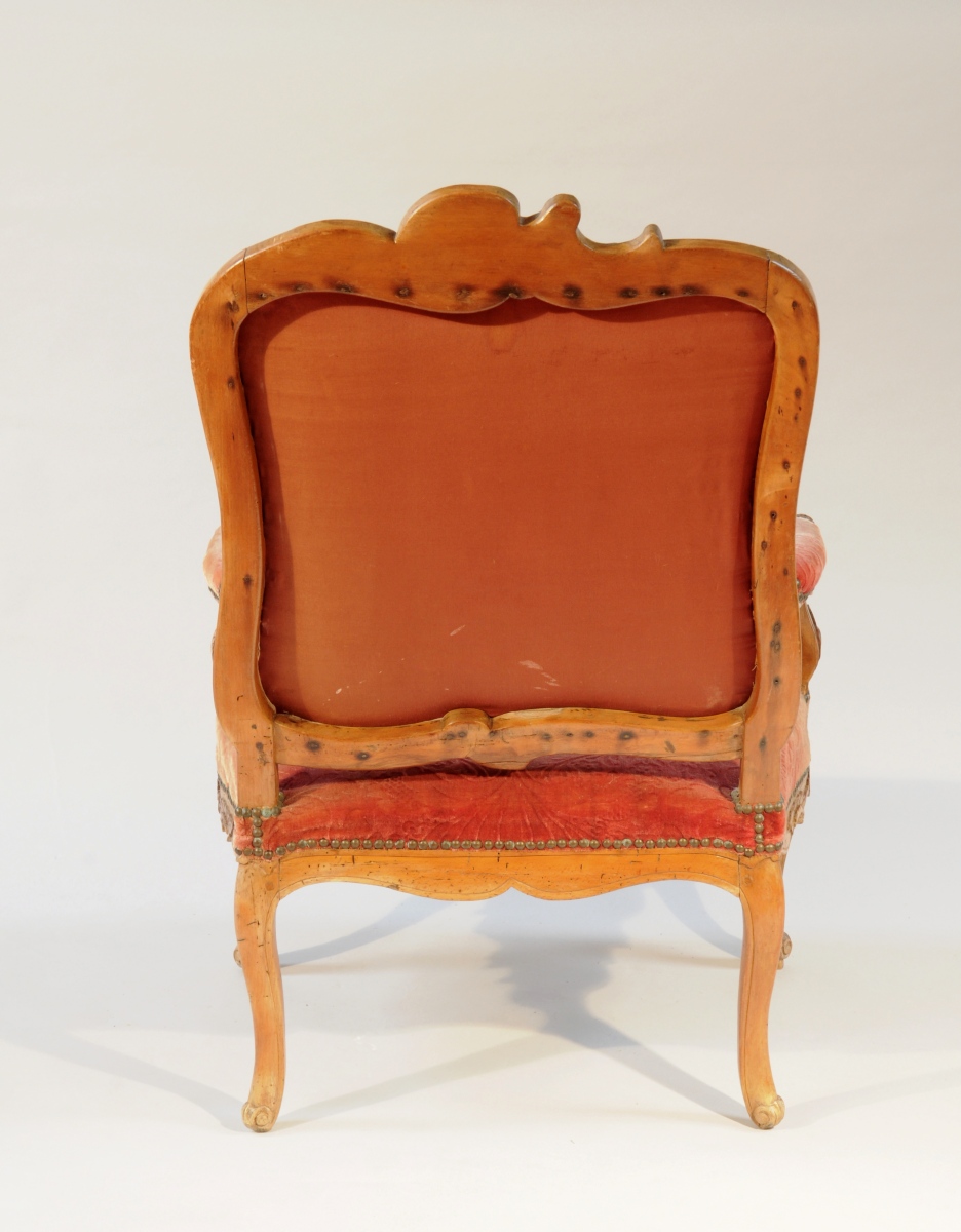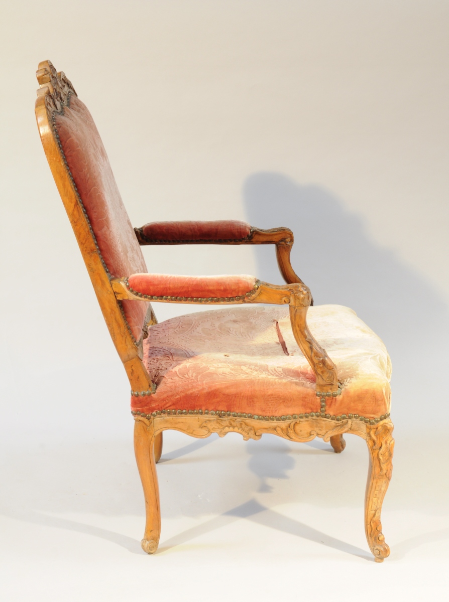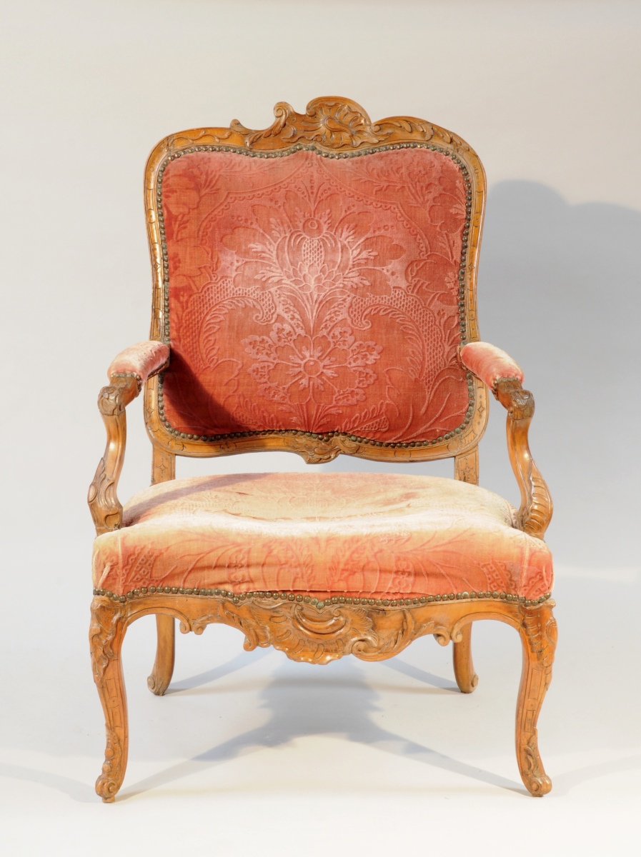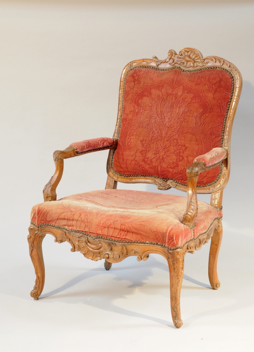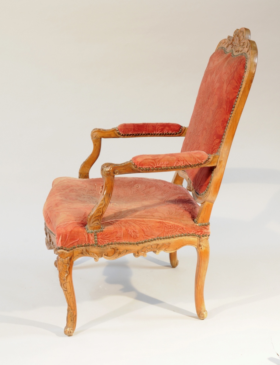 FAUTEUIL À LA REINE en hêtre richement sculpté et mouluré. Le dossier légèrement violonné est surmonté d'un large coquille asymétrique se prolongeant en enroulements feuillagés à l'épaulement et les montants sont ornés de motifs géométriques épurés. Les accotoirs sont à manchette et les consoles d'accotoir sinueux accueillent chacun un décor différent, celui de gauche une fleur entourée de feuillage et une importante coquille, celui de droite une large feuille d'acanthe et une aile de chauve-souris. La ceinture est centrée d'une coquille asymétrique s'étendant en feuillages enroulés. Il repose sur quatre pieds cambrés, les deux antérieurs recevant des décors de feuillage asymétrisés.