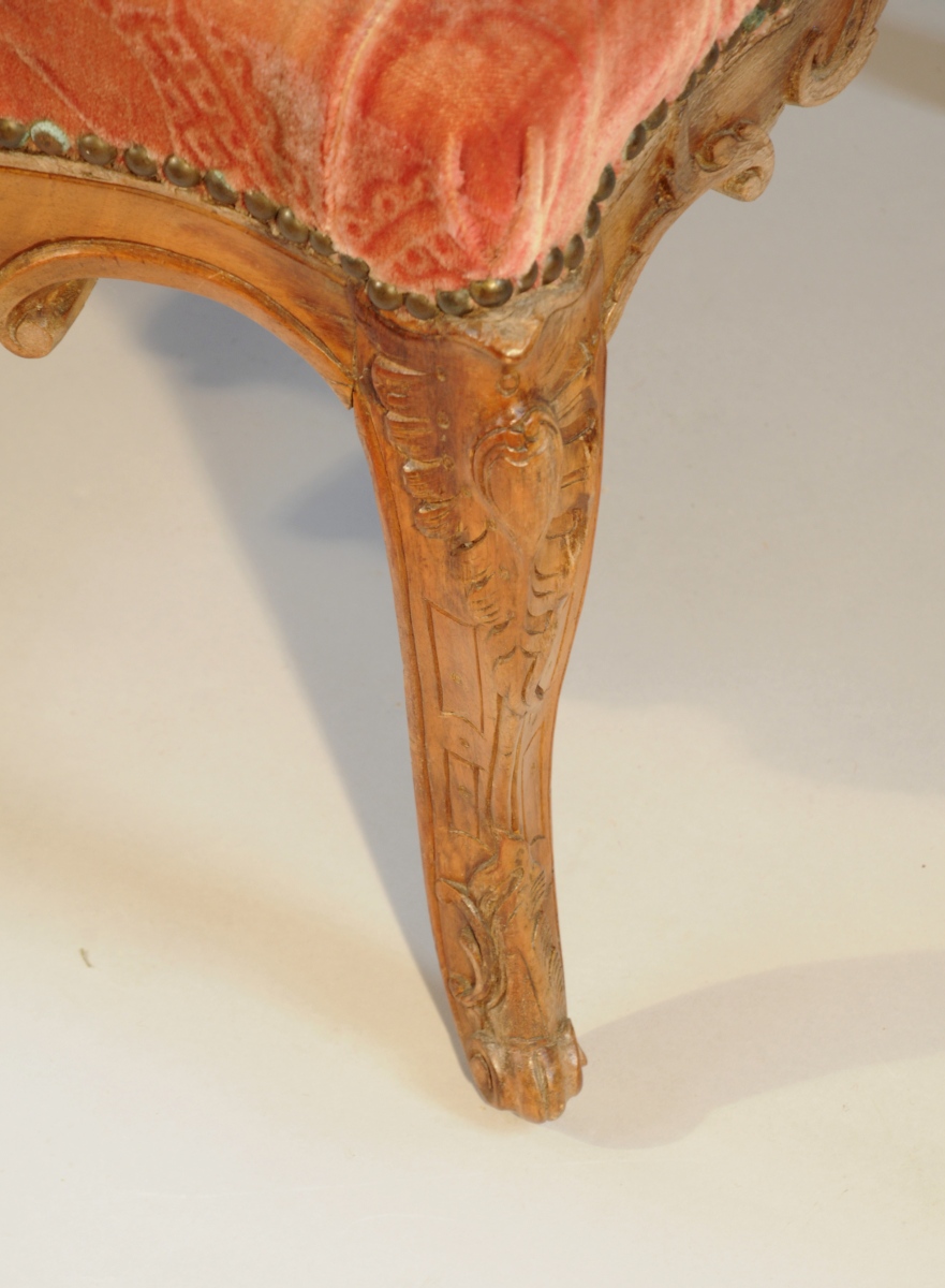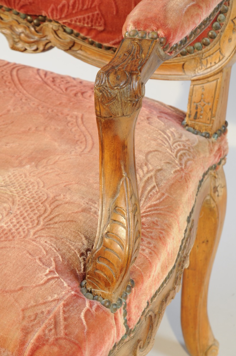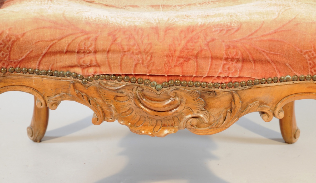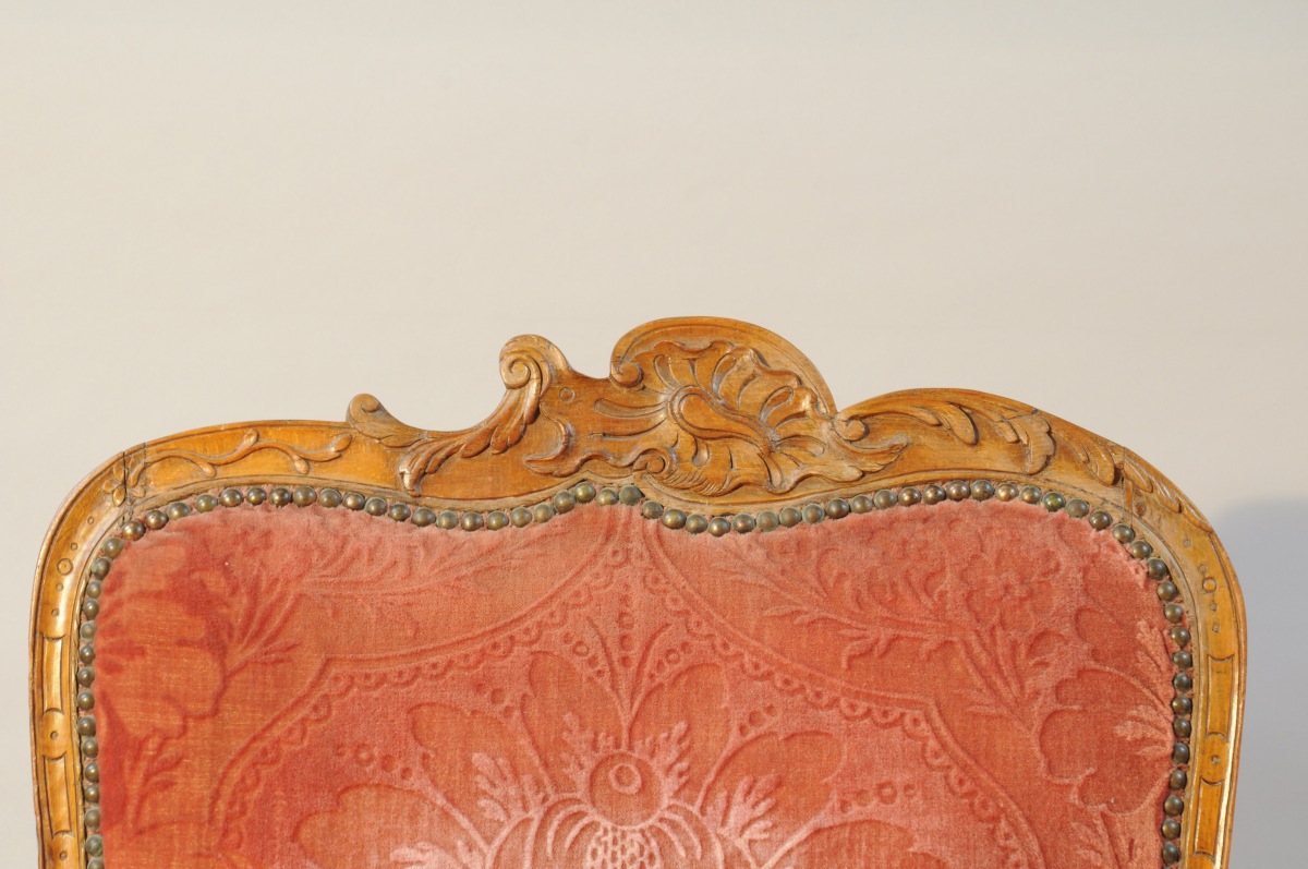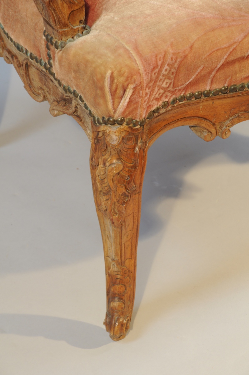 FAUTEUIL À LA REINE en hêtre richement sculpté et mouluré. Le dossier légèrement violonné est surmonté d'un large coquille asymétrique se prolongeant en enroulements feuillagés à l'épaulement et les montants sont ornés de motifs géométriques épurés. Les accotoirs sont à manchette et les consoles d'accotoir sinueux accueillent chacun un décor différent, celui de gauche une fleur entourée de feuillage et une importante coquille, celui de droite une large feuille d'acanthe et une aile de chauve-souris. La ceinture est centrée d'une coquille asymétrique s'étendant en feuillages enroulés. Il repose sur quatre pieds cambrés, les deux antérieurs recevant des décors de feuillage asymétrisés.