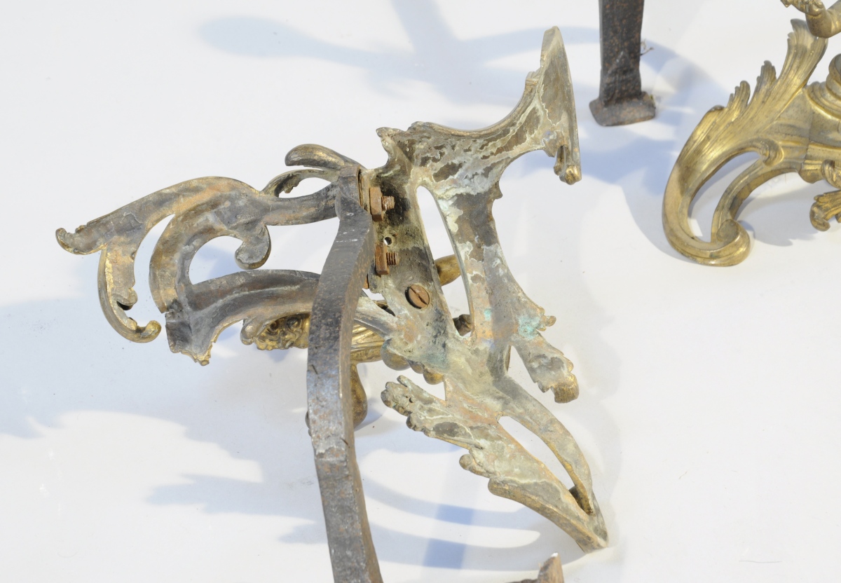 Paire de FEUX asymétriques en bronze ciselé et doré. Ornementation d'enroulements feuillagés. L'un agrémenté d'un putto tenant un masque et l'autre d'une fillette présentant des fleurs.