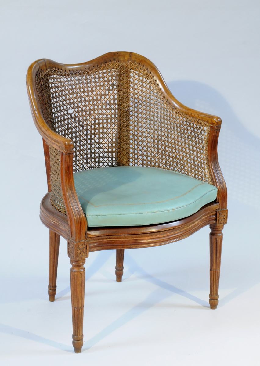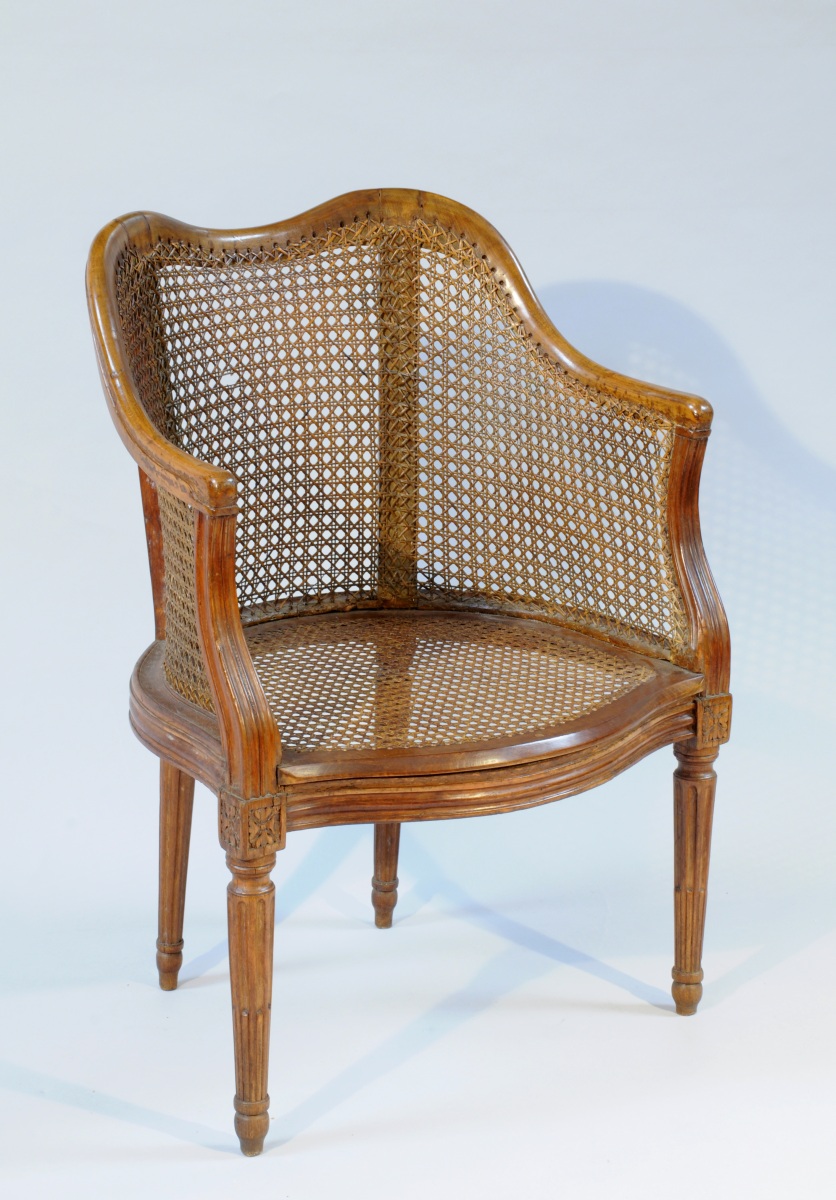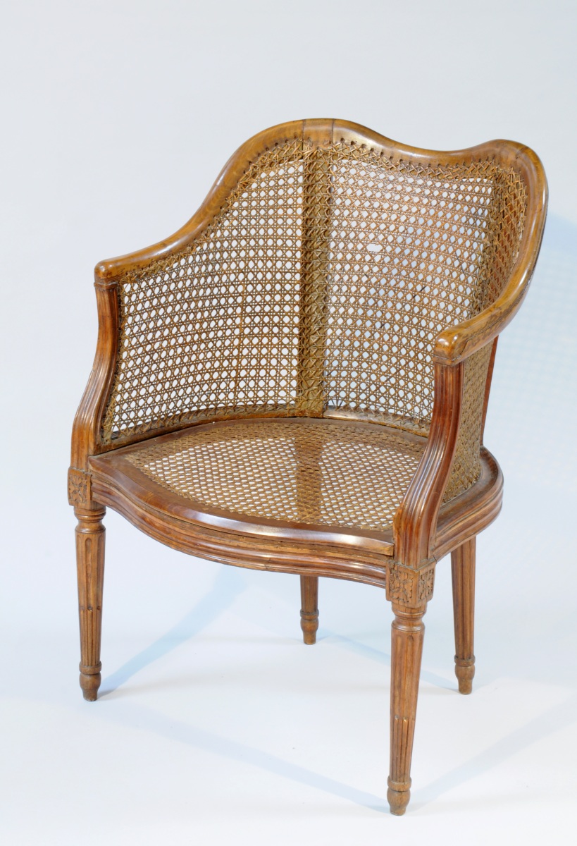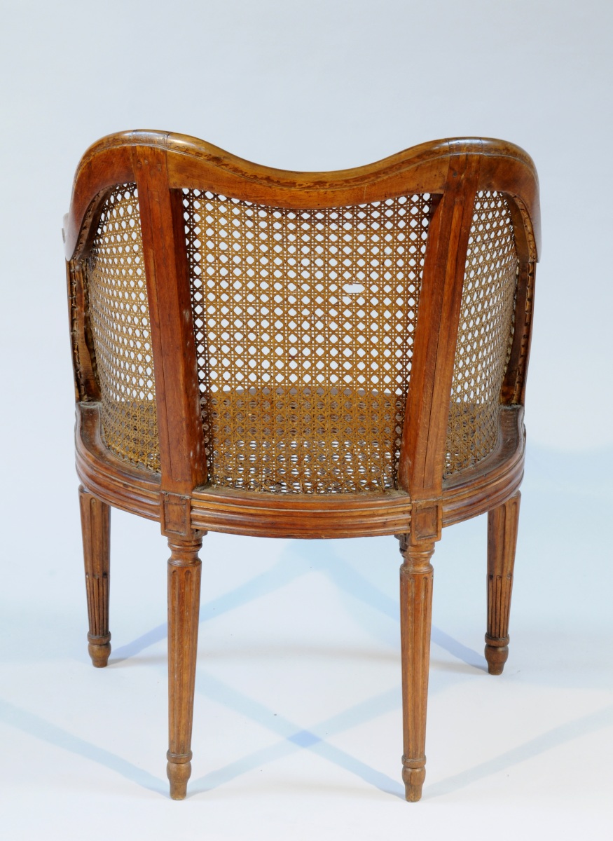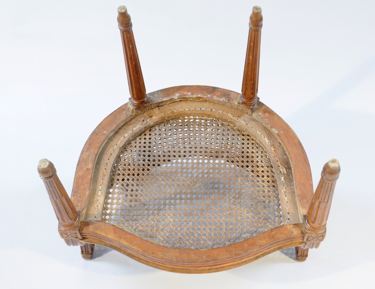 FAUTEUIL DE TOILETTE canné en hêtre mouluré. Dossier mouvementé, échancré en partie haute. Les consoles d'accotoir reposent sur des dés de raccordement fleuronnés. Il repose sur quatre pieds fuselés et cannelés terminés en toupie. Les pieds antérieurs rudentés.