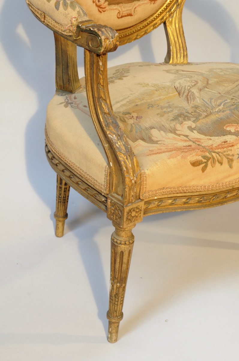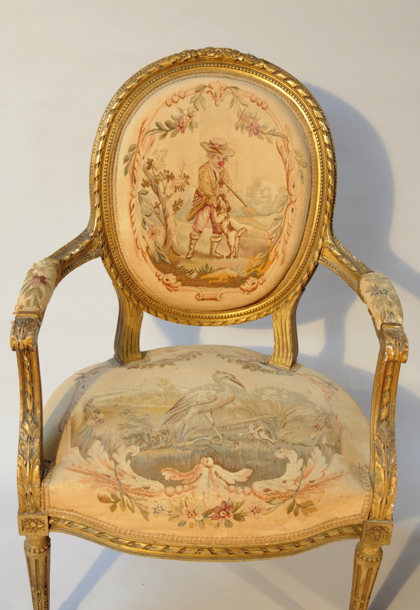 Paire de FAUTEUILS CABRIOLETS à dossier médaillon en bois sculpté, stuqué et doré. Riche décor de frises rubannées, rais de perles, acanthes, fleurons et fleurettes sur la traverse haute du dossier. Reposent sur quatre pieds cannelés et rudentés à asperges. Garniture en tapisserie d'Aubusson, les assises aux Fables de La Fontaine. Une jeune paysanne à la colombe et le Loup et l'Agneau pour l'un; un jeune chasseur et le Héron pour l'autre.
