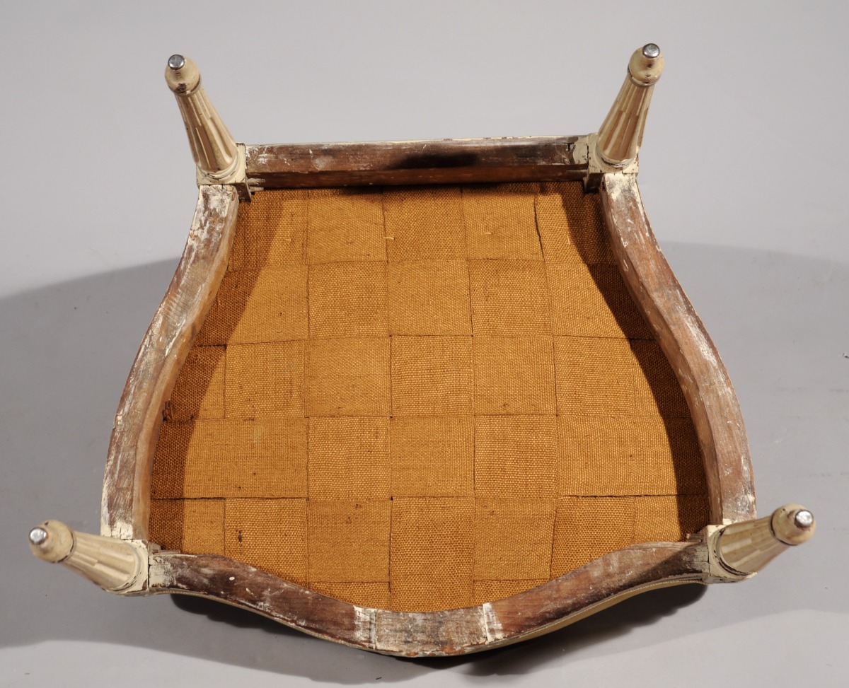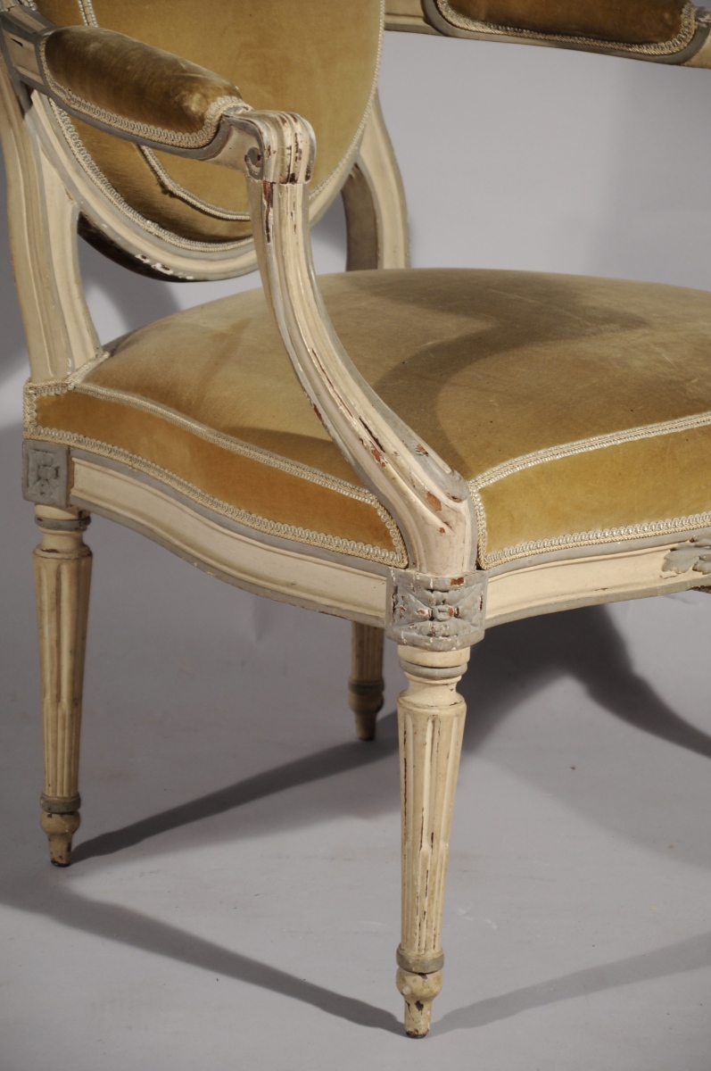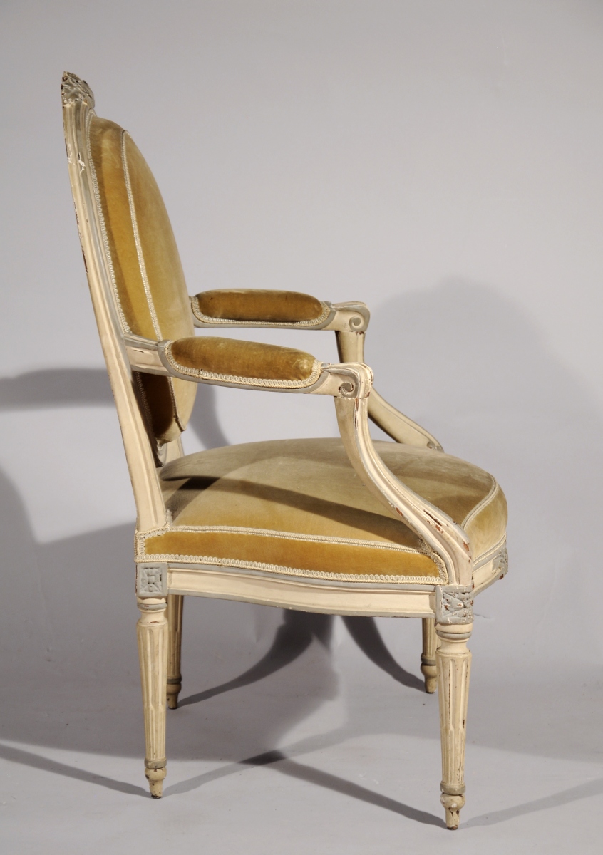 Suite de QUATRE FAUTEUILS CABRIOLETS à dossier médaillon en bois mouluré, sculpté et rechampi crème et gris. Le sommet du dossier et le centre de la ceinture sculptés d'une large feuille d'acanthe. Consoles d'accotoirs en coup-de-fouet. Dés de raccordement fleuronnés et arrondis à l'avant. Ils reposent sur quatre pieds fuselés, cannelés et rudentés.