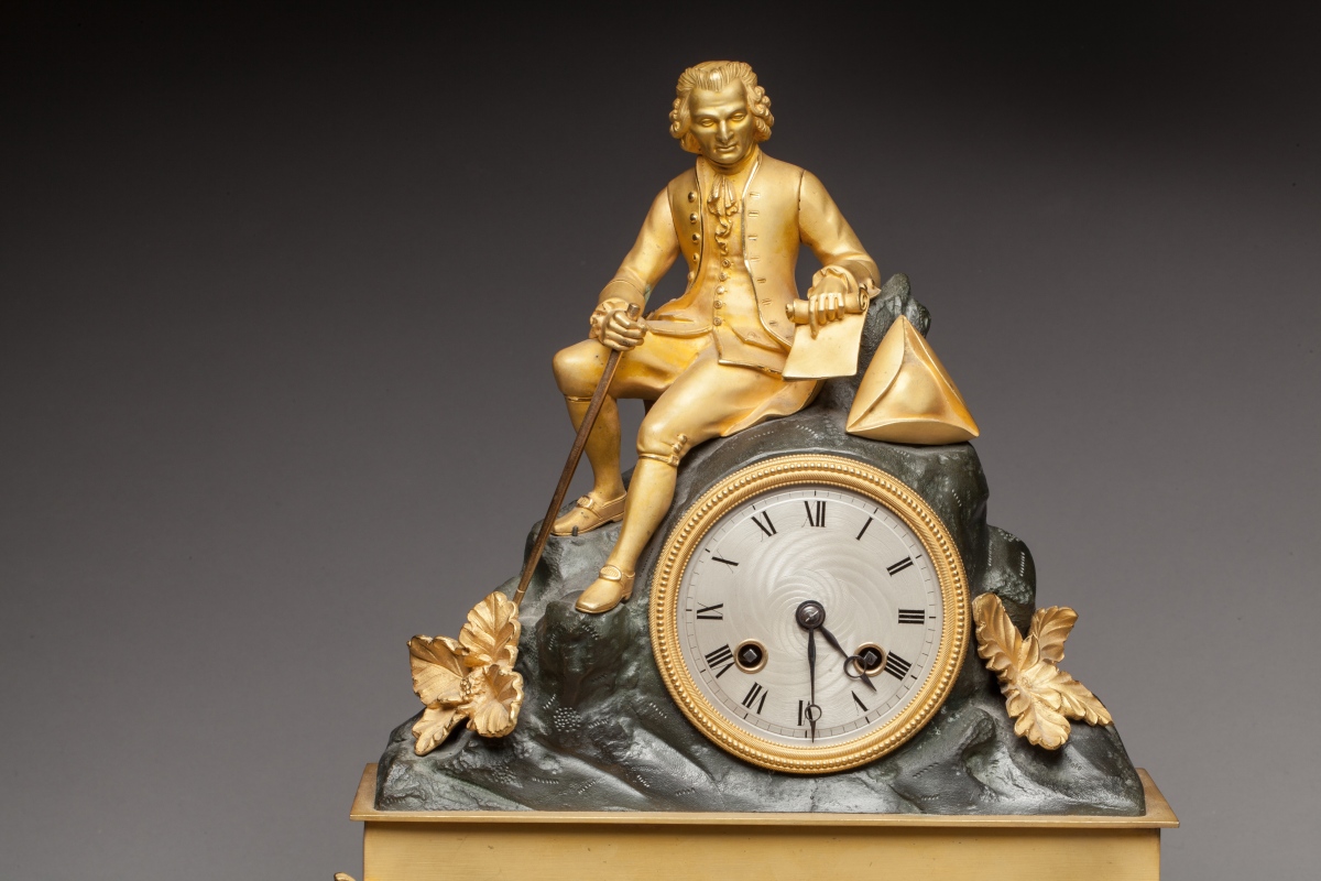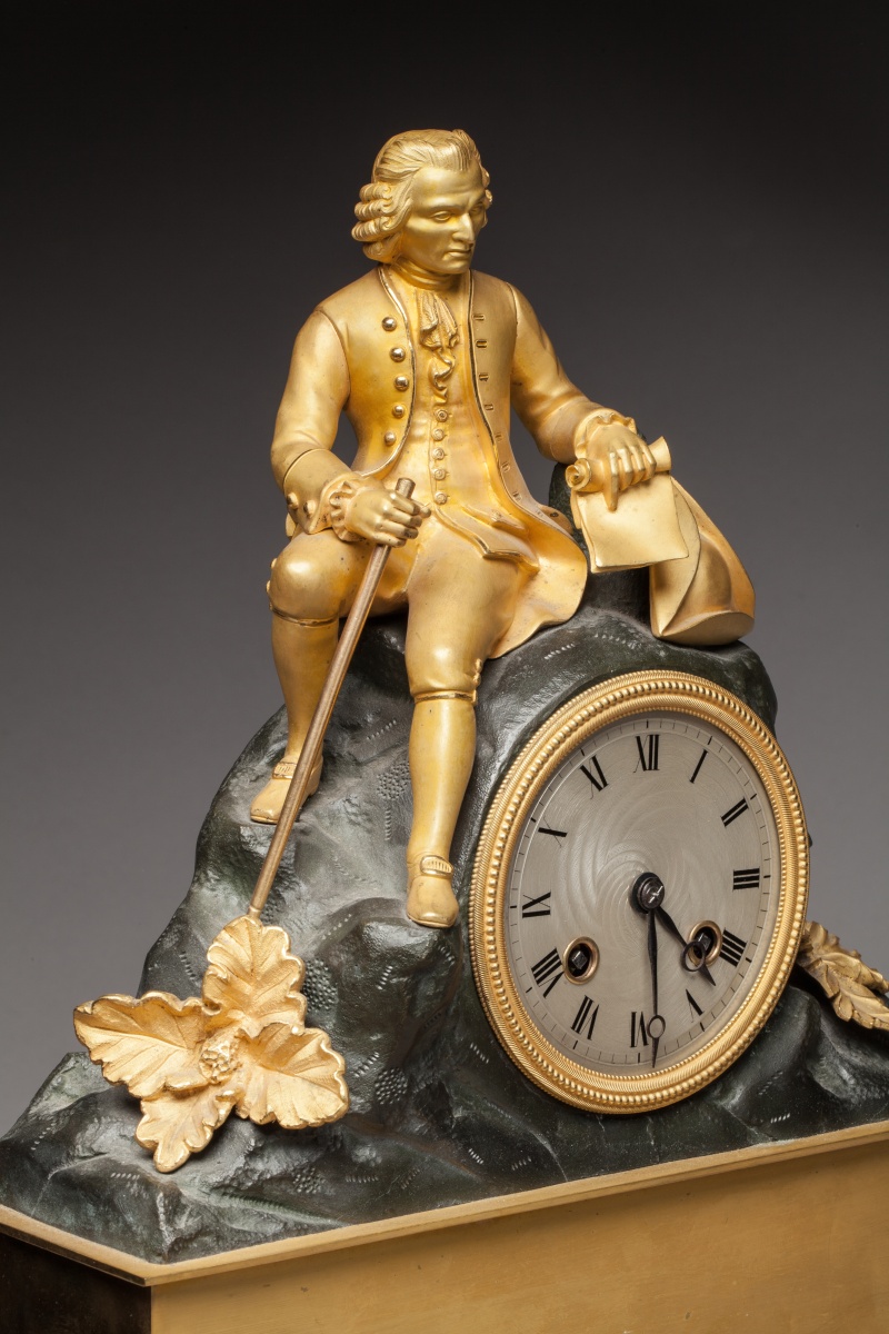 PENDULE "AU PROMENEUR SOLITAIRE" dite borne, en régule doré et patiné et en laiton figurant Jean-Jacques Rousseau assis, baton de marche et rouleau manuscrit à la main, son chapeau tricorne posé sur les rochers. Le cadran métalique ondoyé est marqué des heures en chiffres romains et gradué pour les minutes. Elle repose sur un socle de forme rectangulaire à motifs d'acanthes sur une base à doucine ceinte d'une frise de lotus reposant sur quatre pieds à acanthe et frises feuillagées.