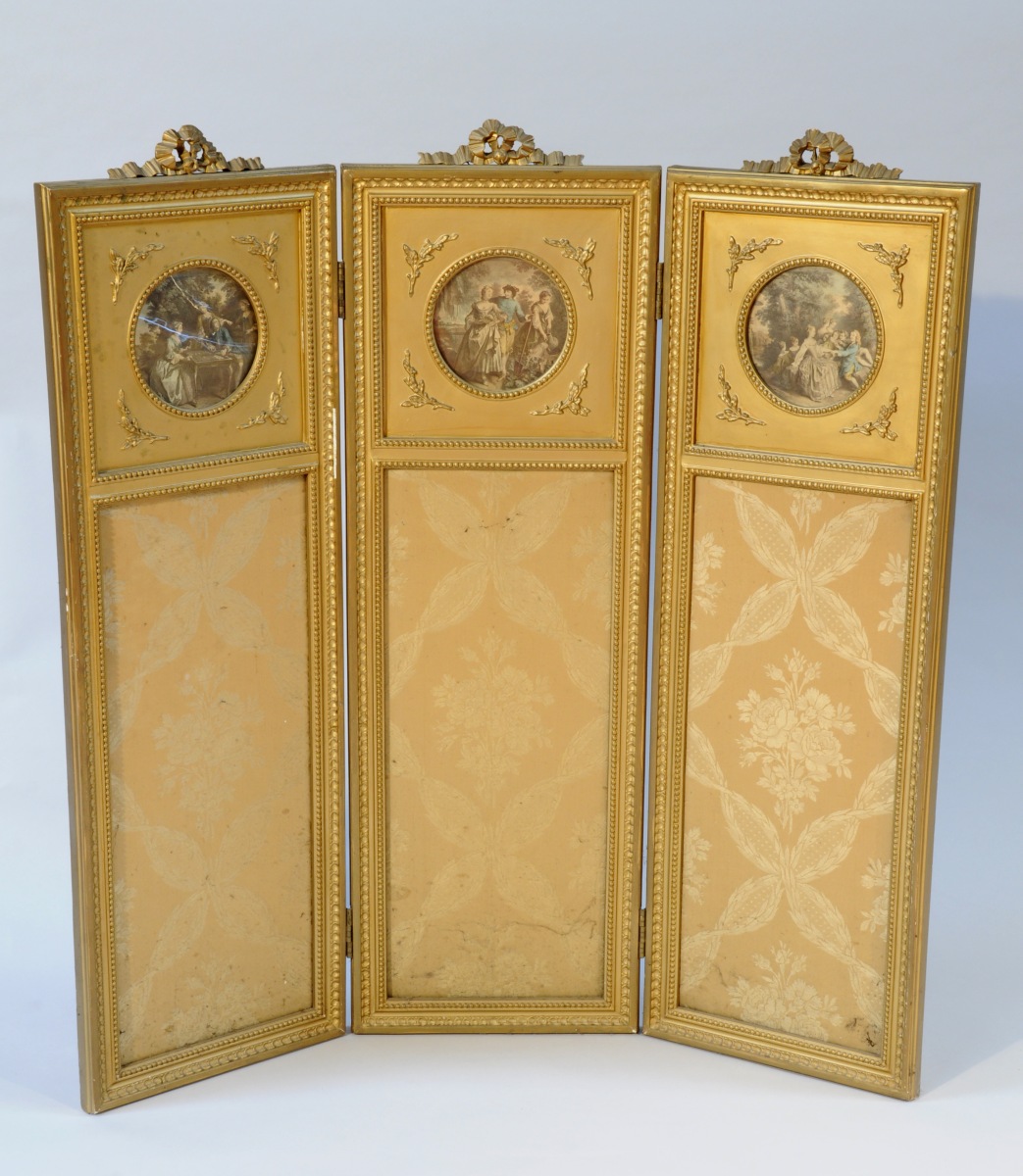 PARAVENT à trois feuilles de forme rectangulaire en bois sculpté et doré orné de frise de rais de cur et rais de perles. La partie inférieure gainée de tissu et la partie supérieure à médaillons circulaires entourés de branches de laurier, accueillant des gravures rehaussées. Nuds rubanés à l'amortissement.
