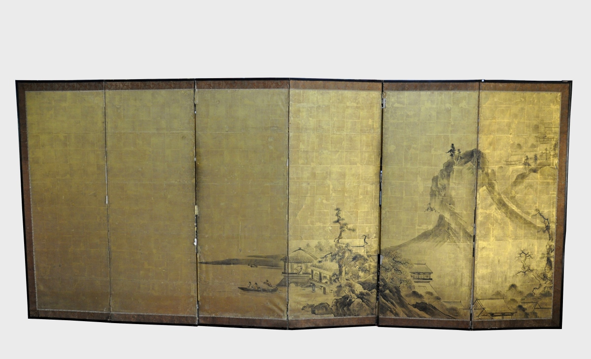 JAPON. Grand PARAVENT à fond de feuille d'or figurant une scène de montagne et de paysage. 6 larges feuilles de papier.