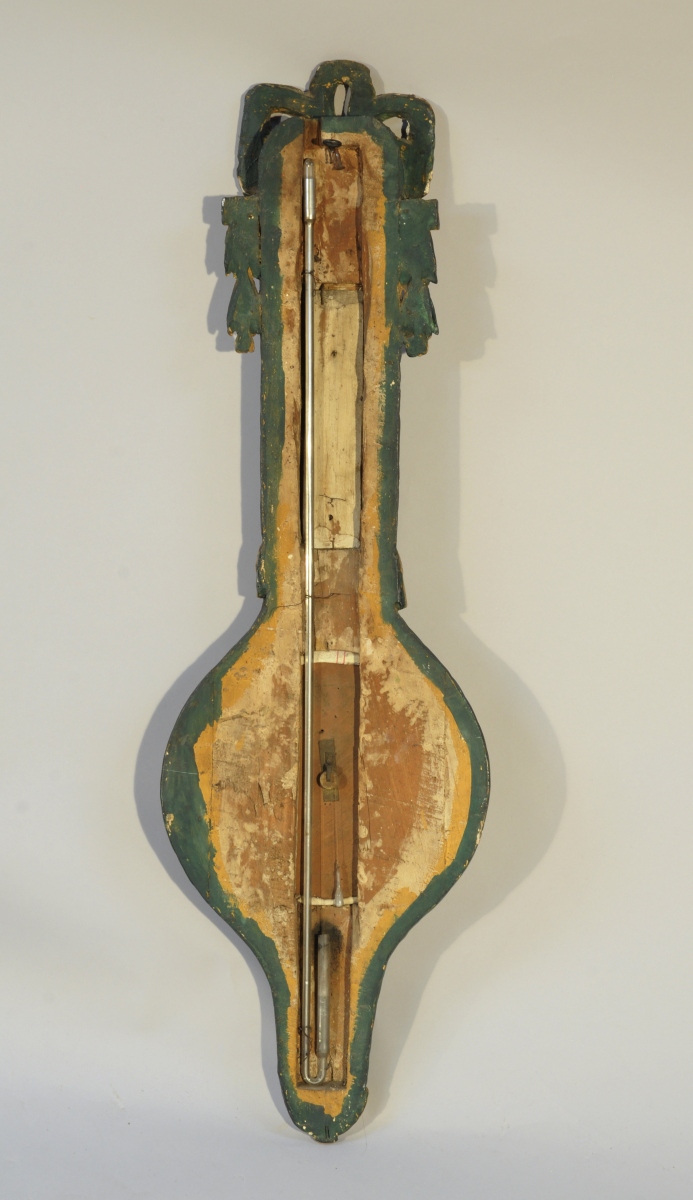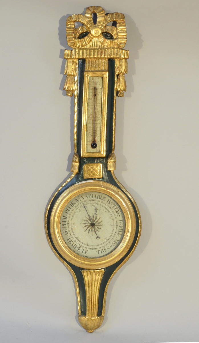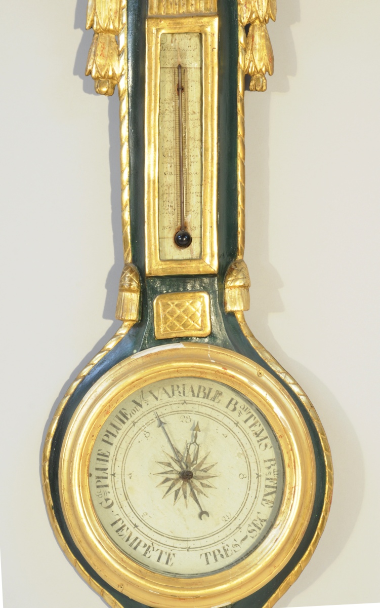 BAROMÈTRE-THERMOMÈTRE en bois mouluré et sculpté redoré et relaqué vert. En partie supérieure, le thermomètre à système Réaumur est sommé d'un nud rubané, flanqué de deux guirlandes de laurier et de deux glands de passementerie. Le baromètre s'inscrit dans un encadrement circulaire mouluré terminé en cul de lampe feuillagé.