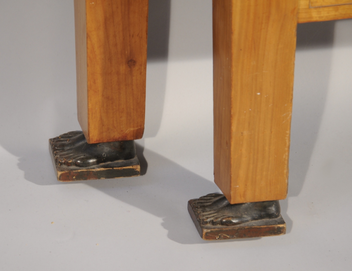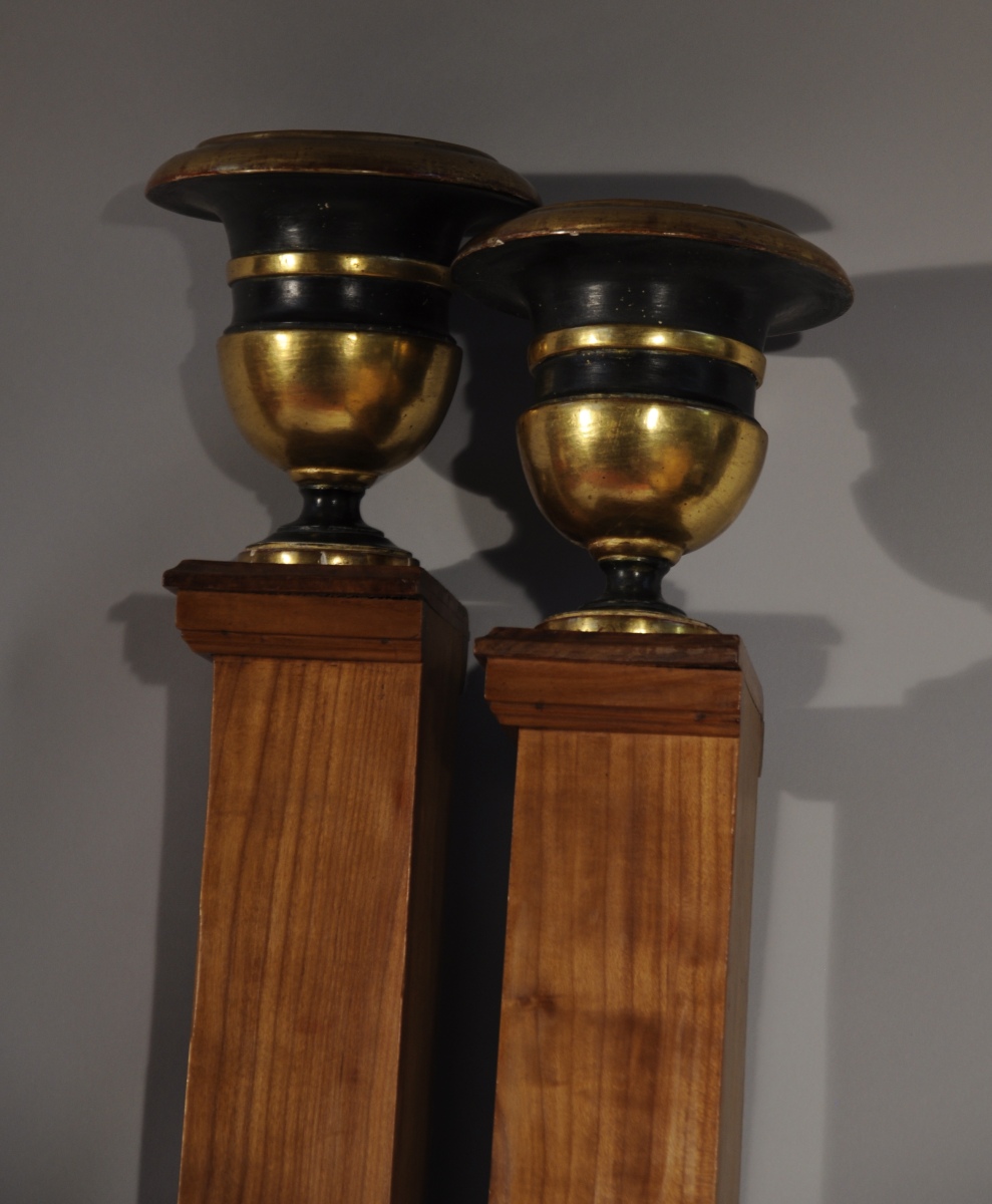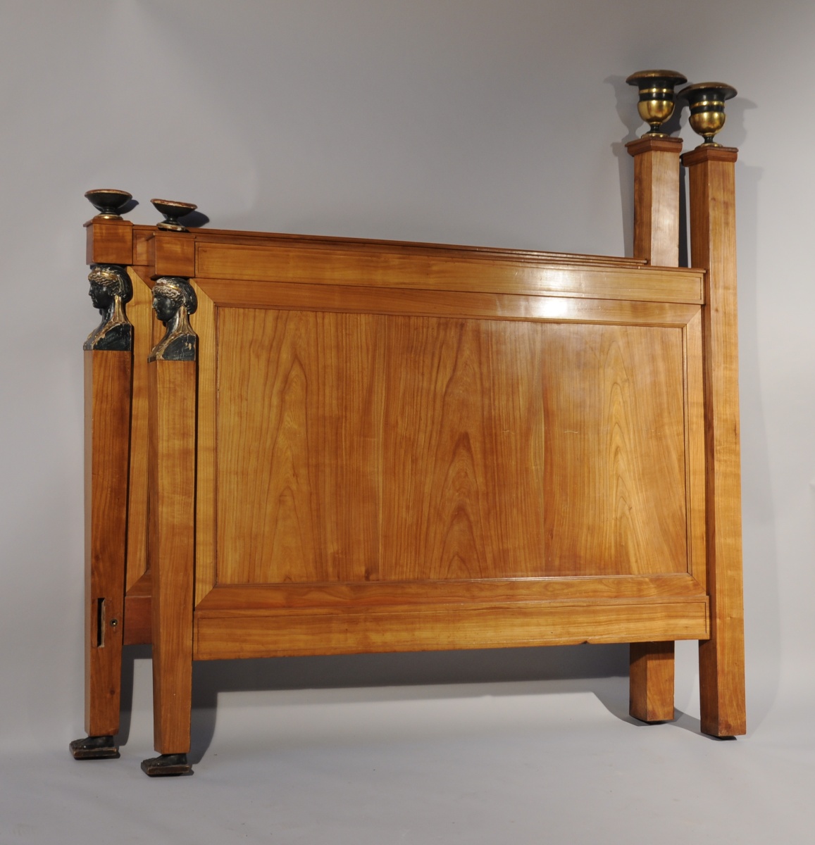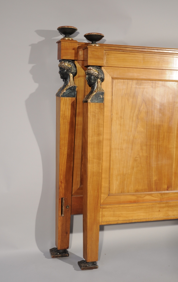 LIT DE TRAVERS dit "à la romaine" à chevets égaux en acajou blond (?). Les montants antérieurs ornés de têtes et pieds d'Égyptiennes en gaine et sommés d'une coupe sur piédouche en bois sculpté, patiné vert et doré. Les montants postérieurs sont agrémentés à l'amortissement d'un vase médicis en bois tourné, repatiné vert et redoré.
